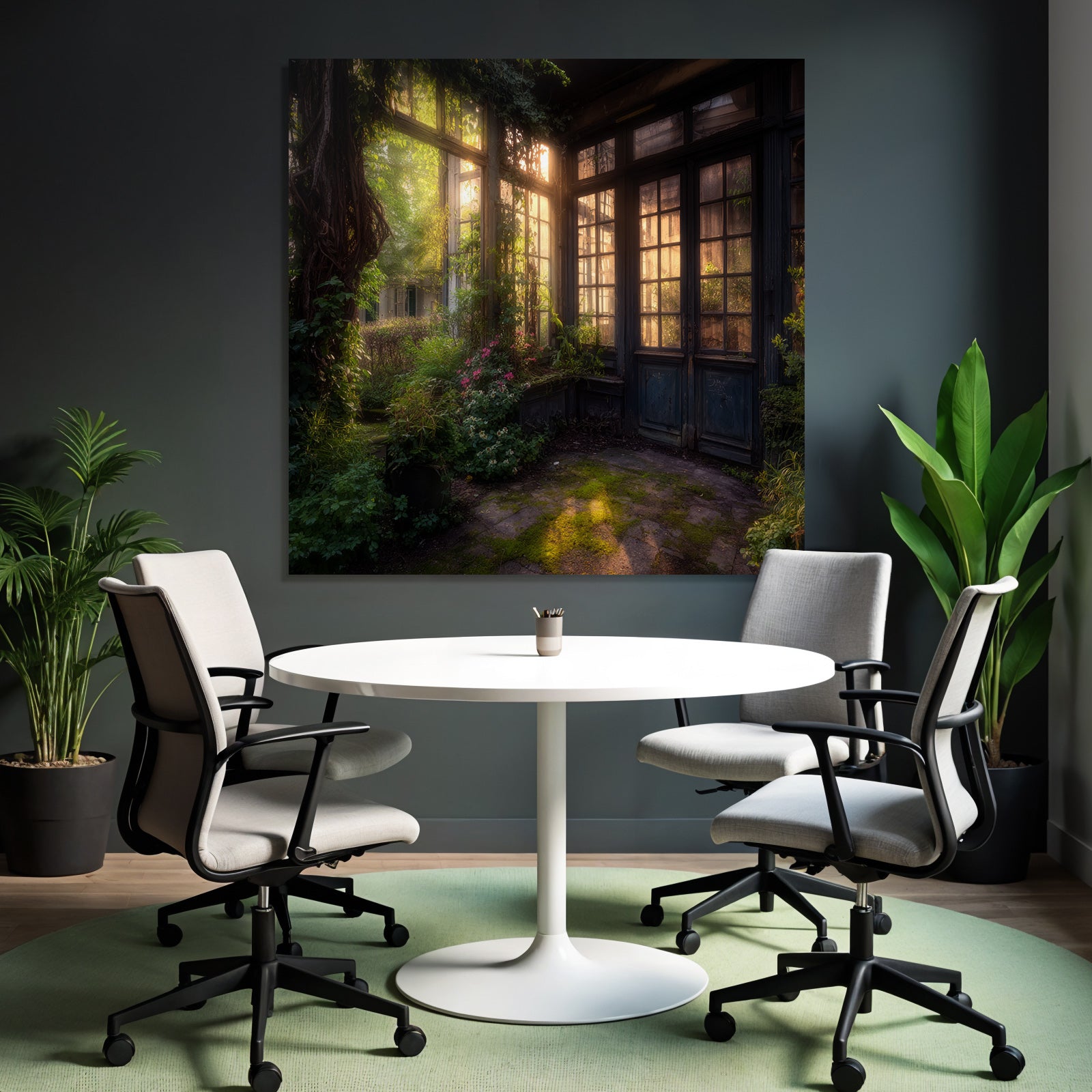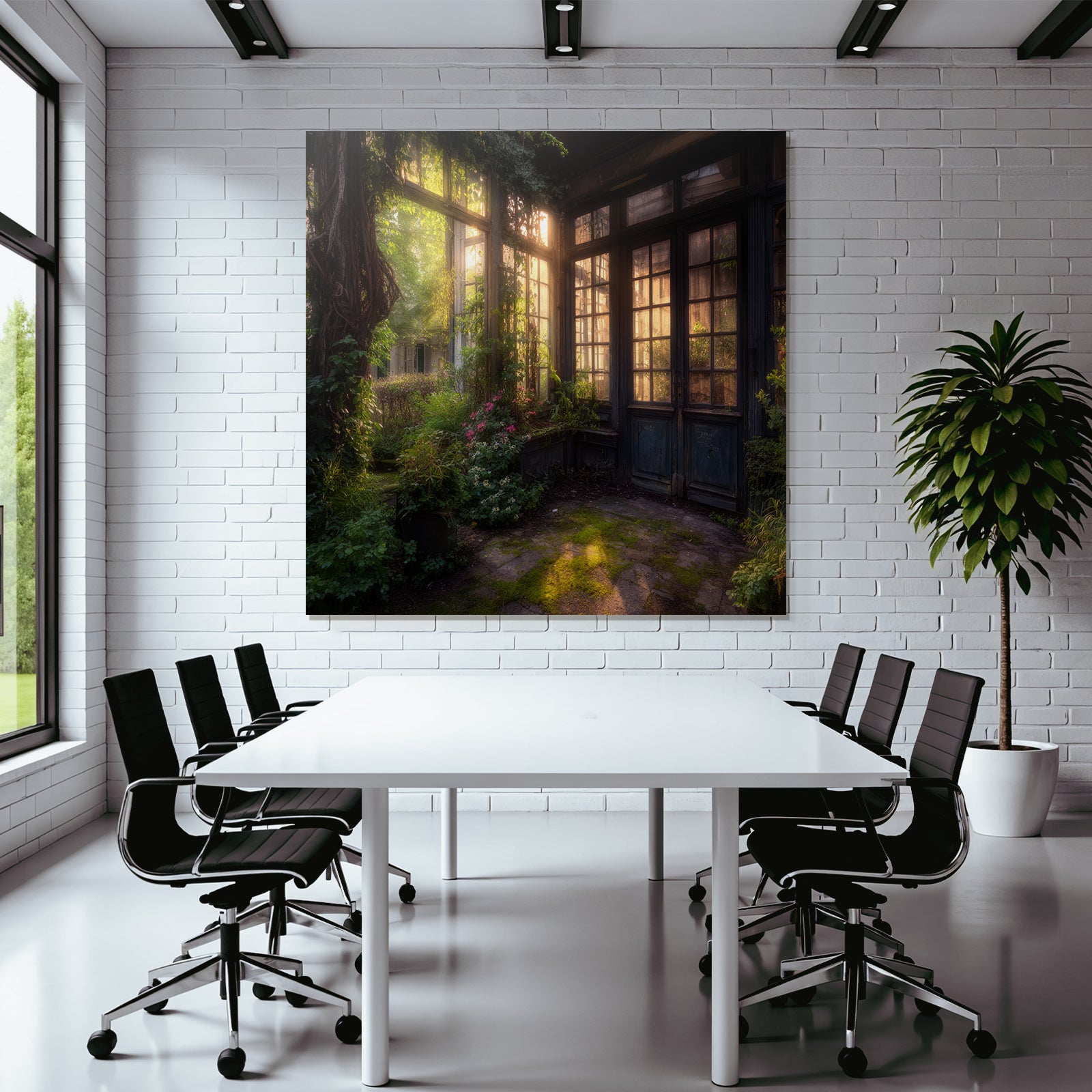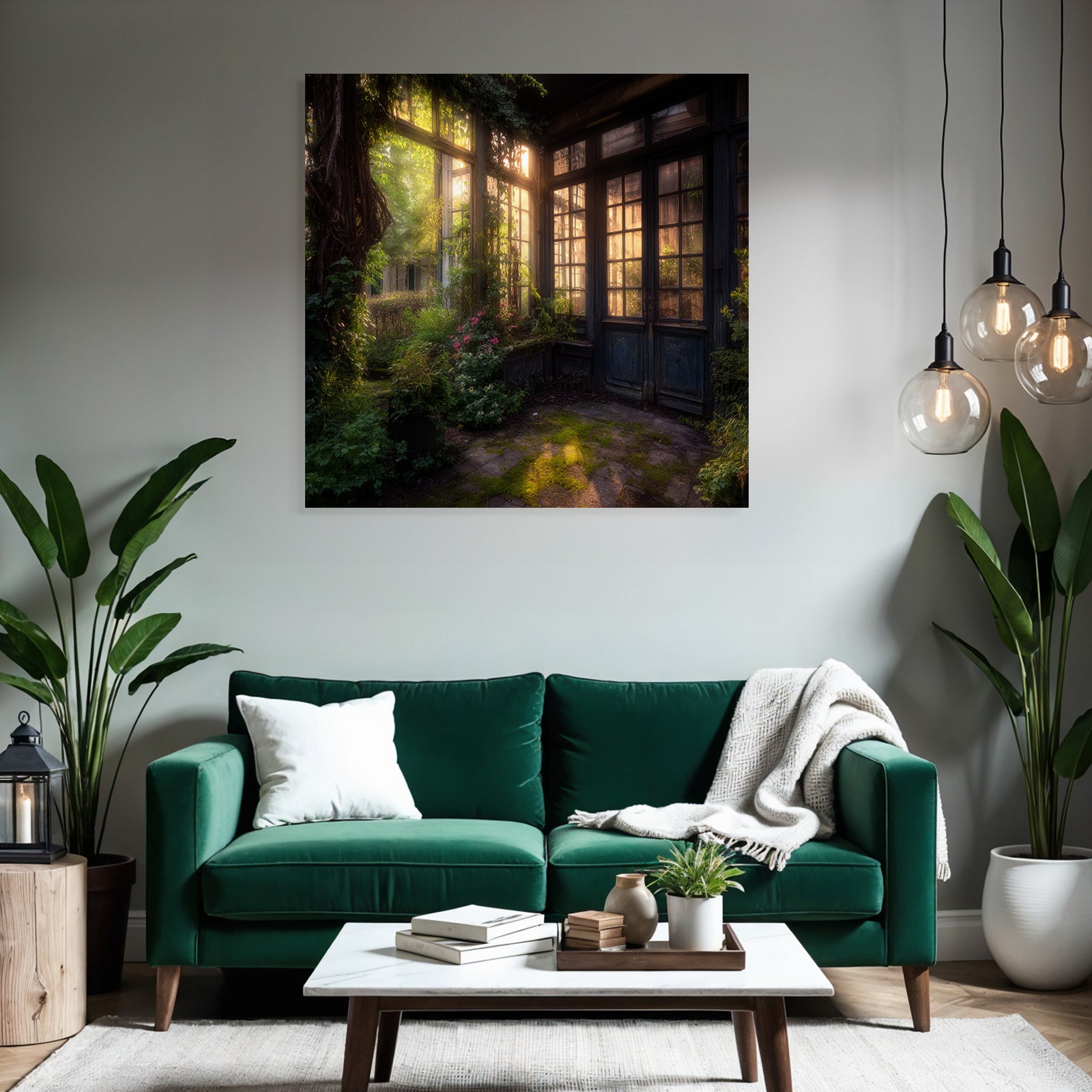 Mit dem Werk „Friedlicher Innenraum Mit Glasfenstern Und Grünpflanzen“ im Stil Lost Places gestaltest Du Dein Wartezimmer oder Deine Hotel-Lobby eindrucksvoll und modern – auf Stoff im FameFrame™.