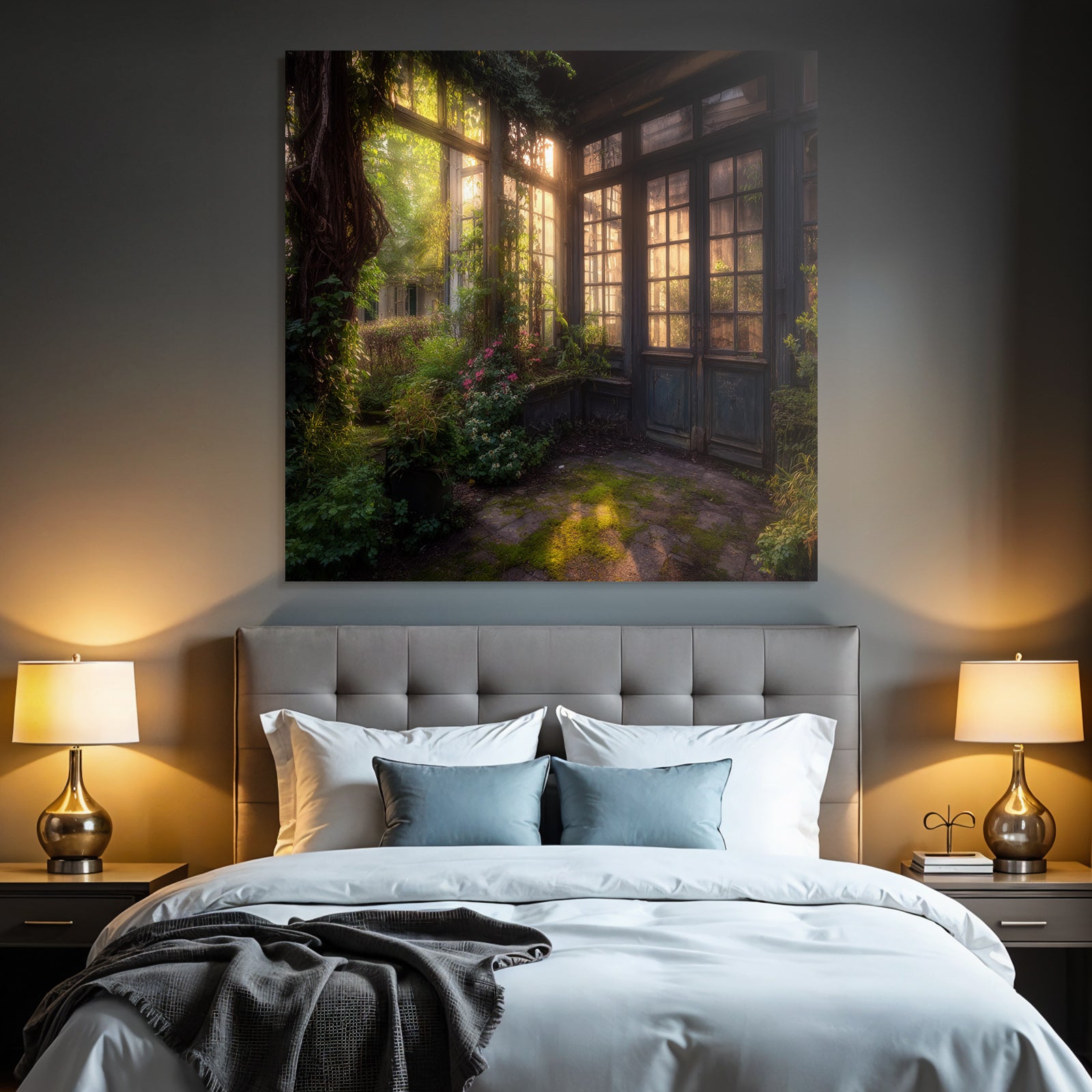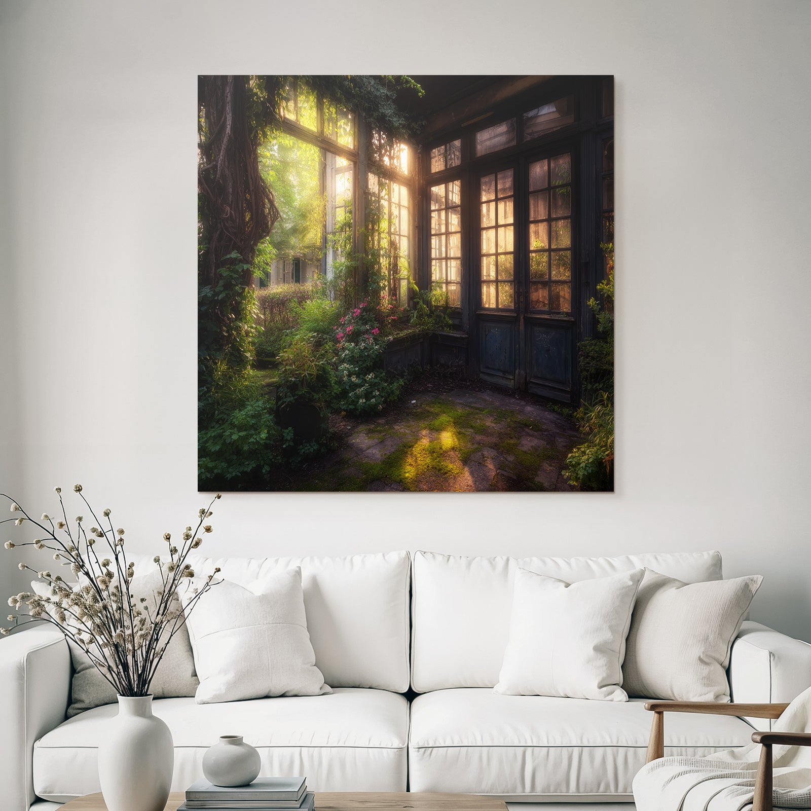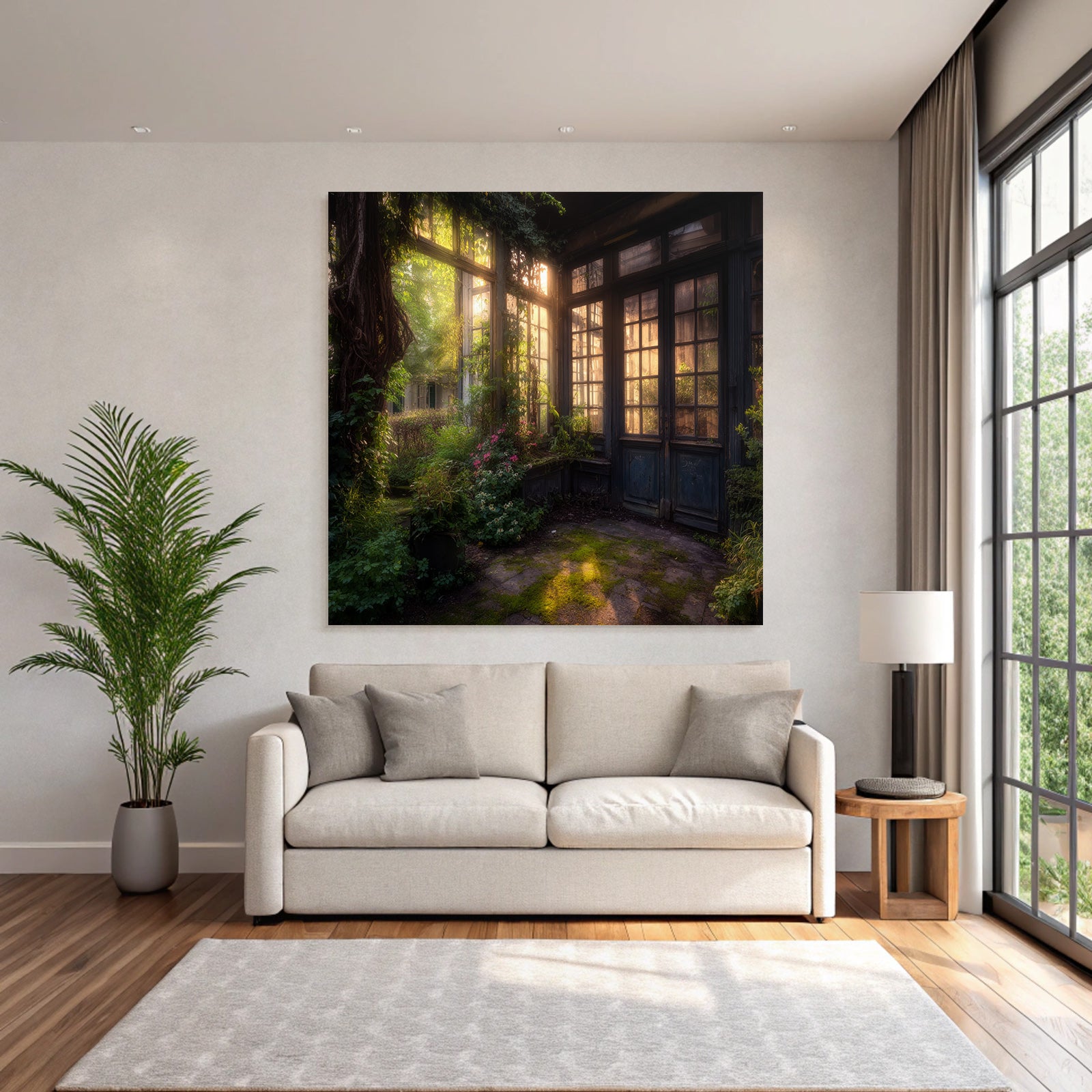 Mit dem Werk „Friedlicher Innenraum Mit Glasfenstern Und Grünpflanzen“ im Stil Lost Places gestaltest Du Dein Wartezimmer oder Deine Hotel-Lobby eindrucksvoll und modern – auf Stoff im FameFrame™.