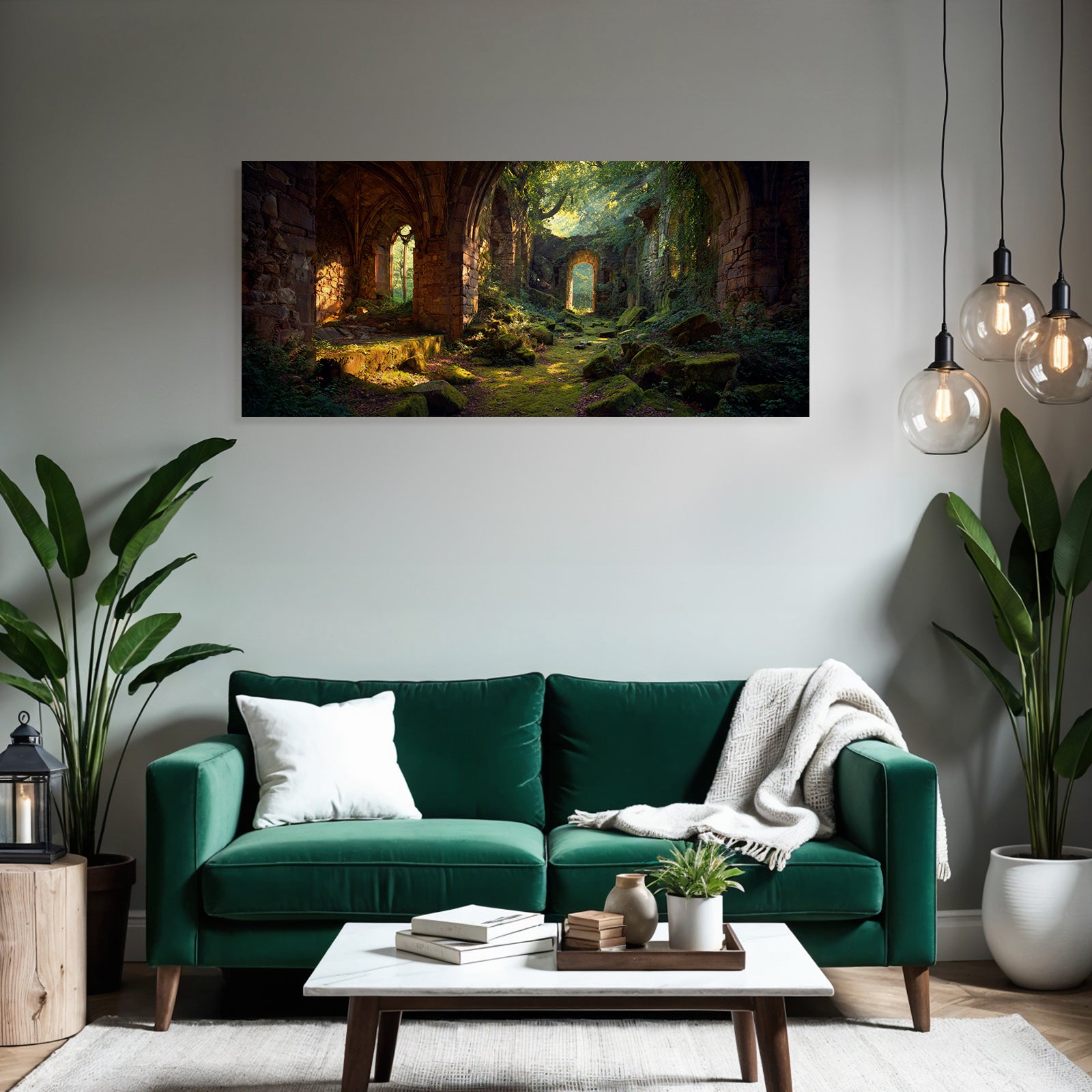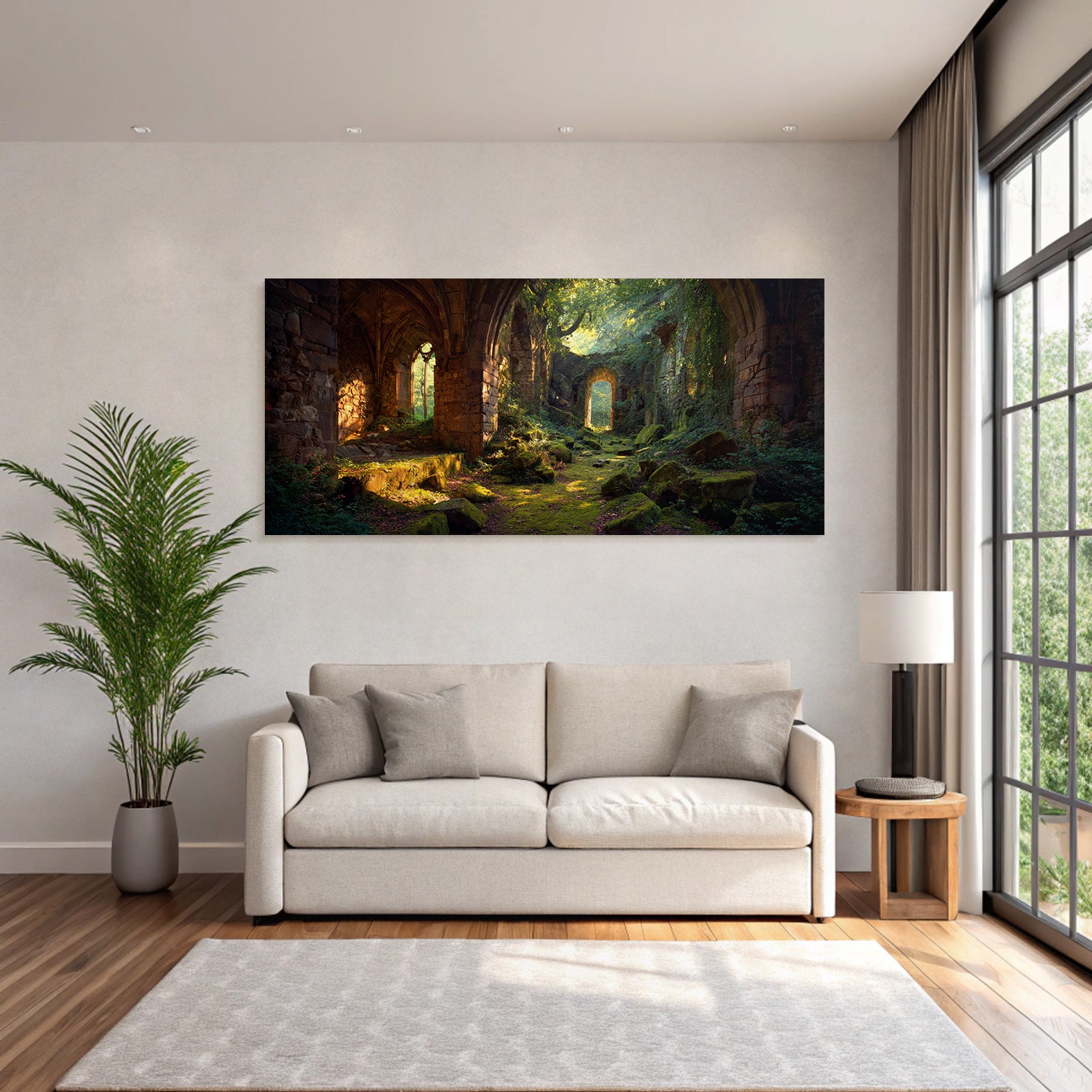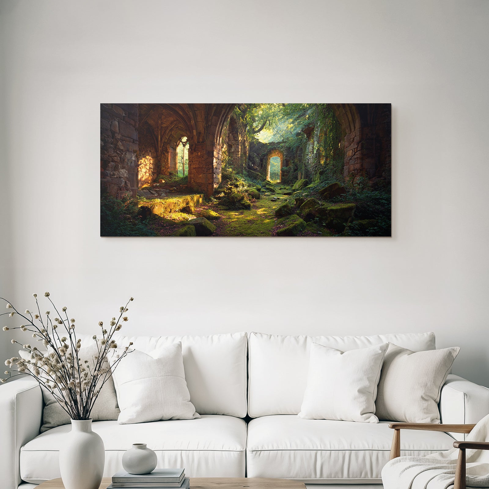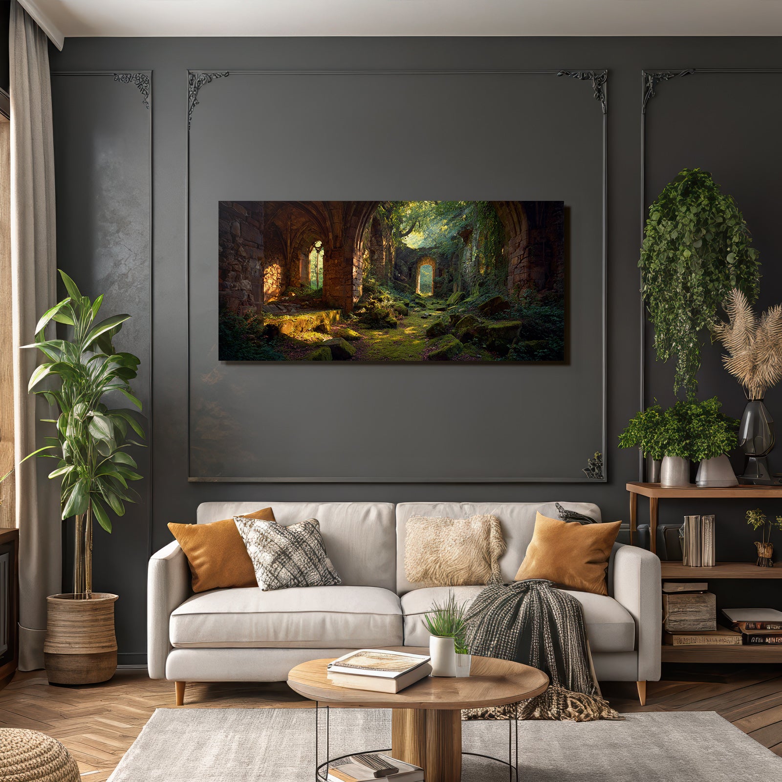 Mit Lost Places-Elementen und klarer Wirkung verleiht „Üppige Ruinen Eines Alten Gemaeürs Umgeben Von Natürlicher Schönheit“ Deinem Raum Persönlichkeit – eingerahmt im exklusiven FameFrame™.