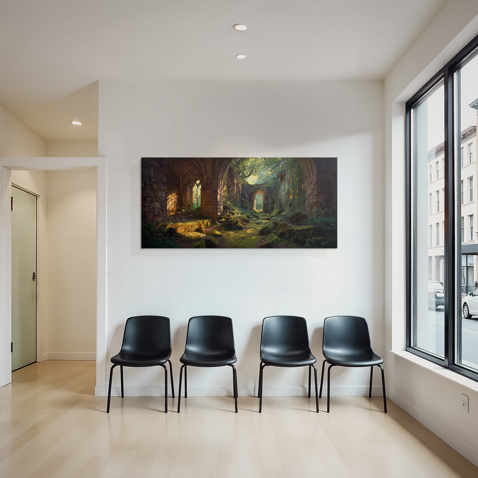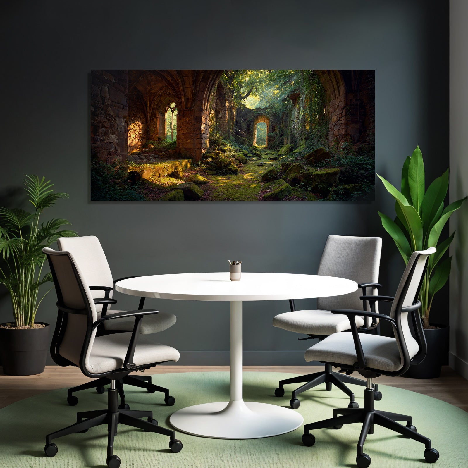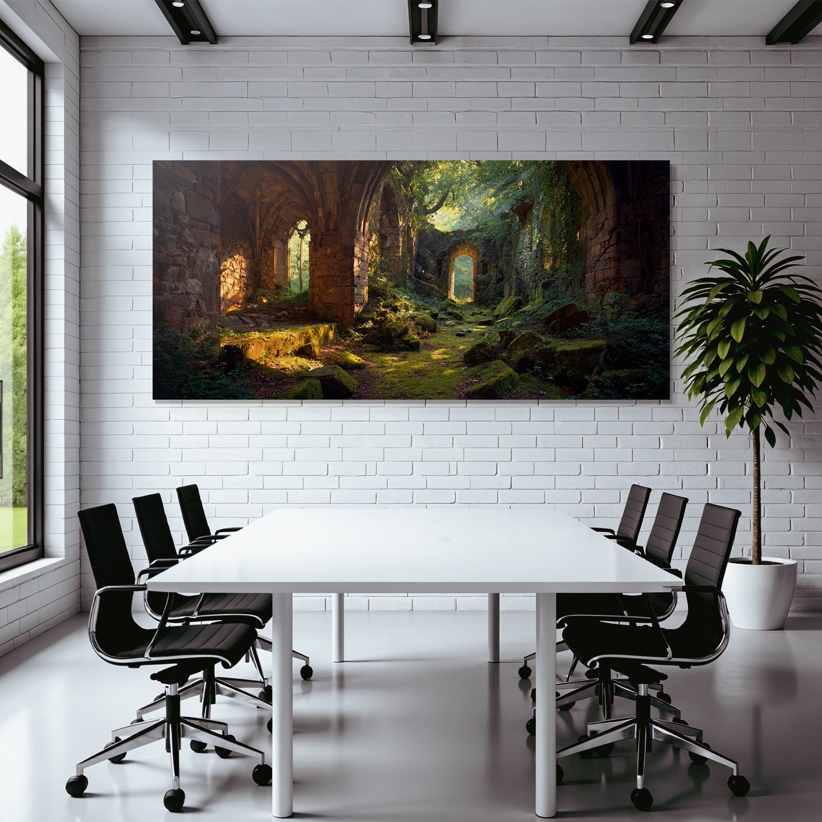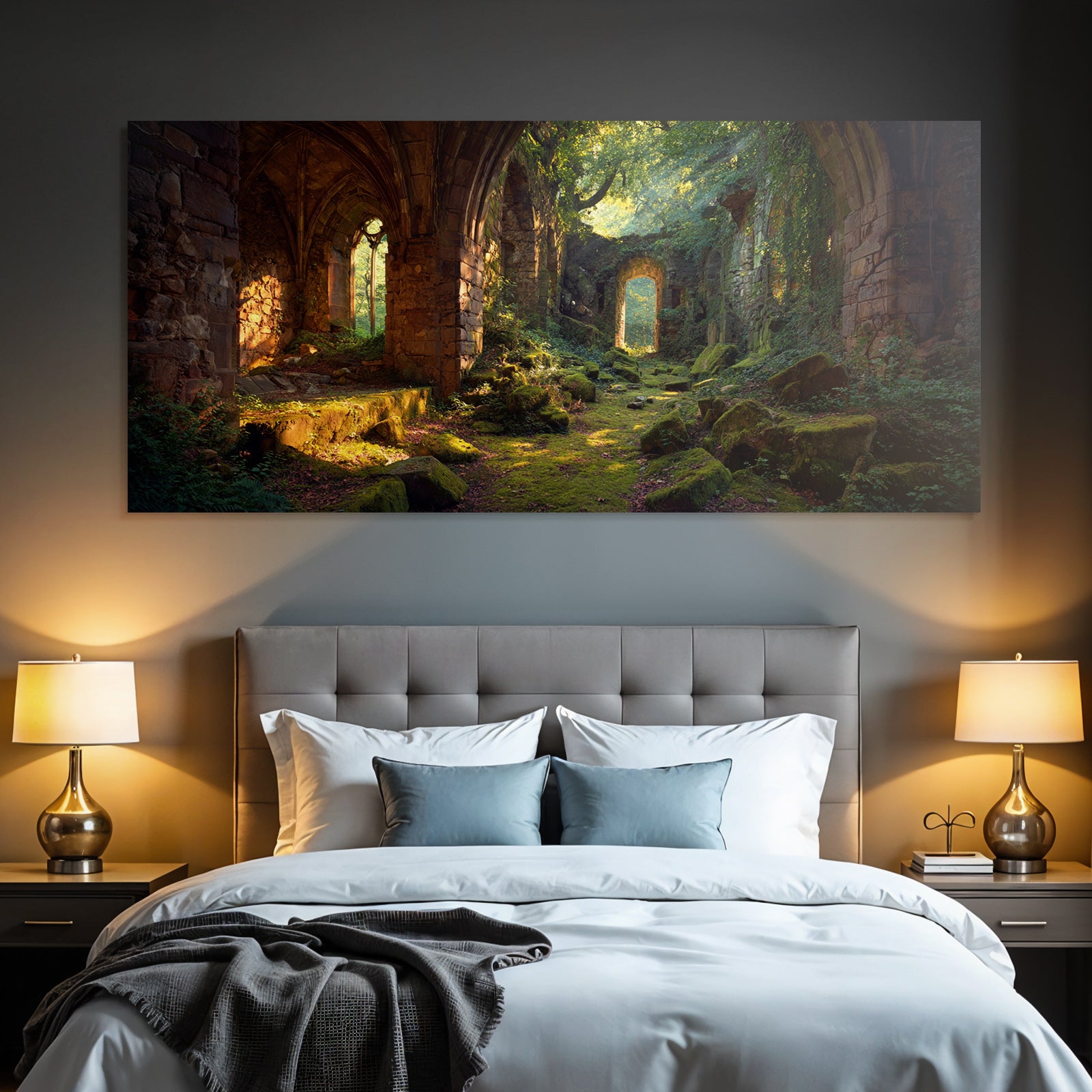 Mit Lost Places-Elementen und klarer Wirkung verleiht „Üppige Ruinen Eines Alten Gemaeürs Umgeben Von Natürlicher Schönheit“ Deinem Raum Persönlichkeit – eingerahmt im exklusiven FameFrame™.