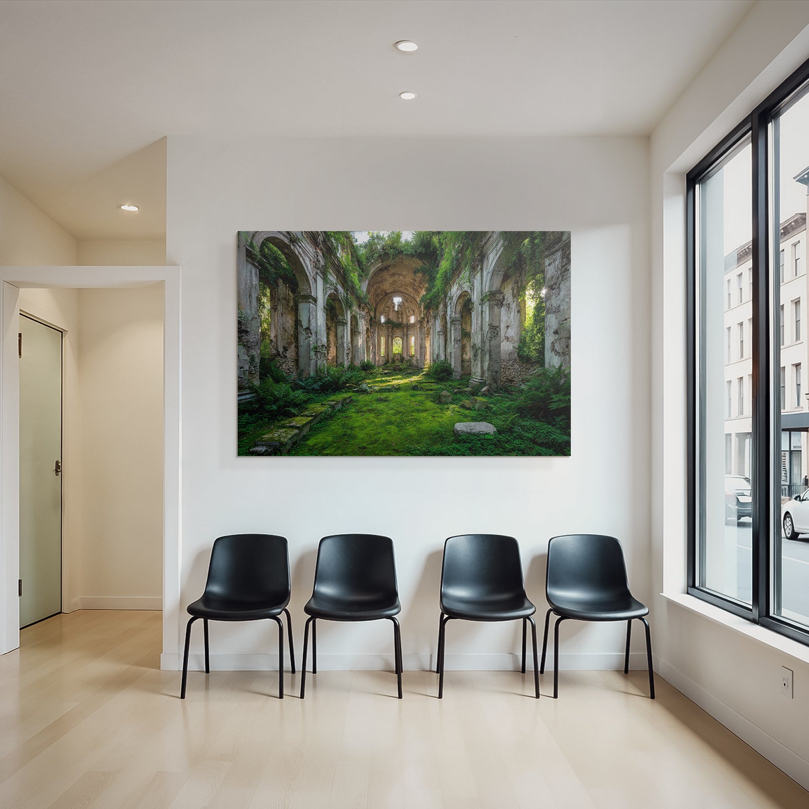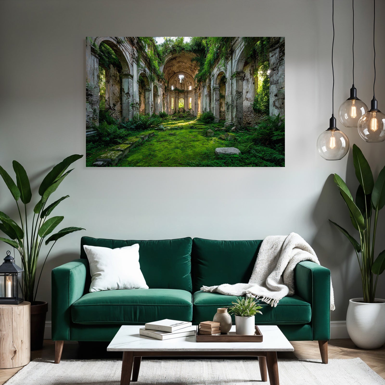 Die Kombination aus dem Motiv „Verfallene Mit Naturgewalt Und Grünem Wachstum“ und dem Stil Lost Places schafft eine Brücke zwischen Klassik und Moderne. Der FameFrame™ vollendet dieses Zusammenspiel perfekt.