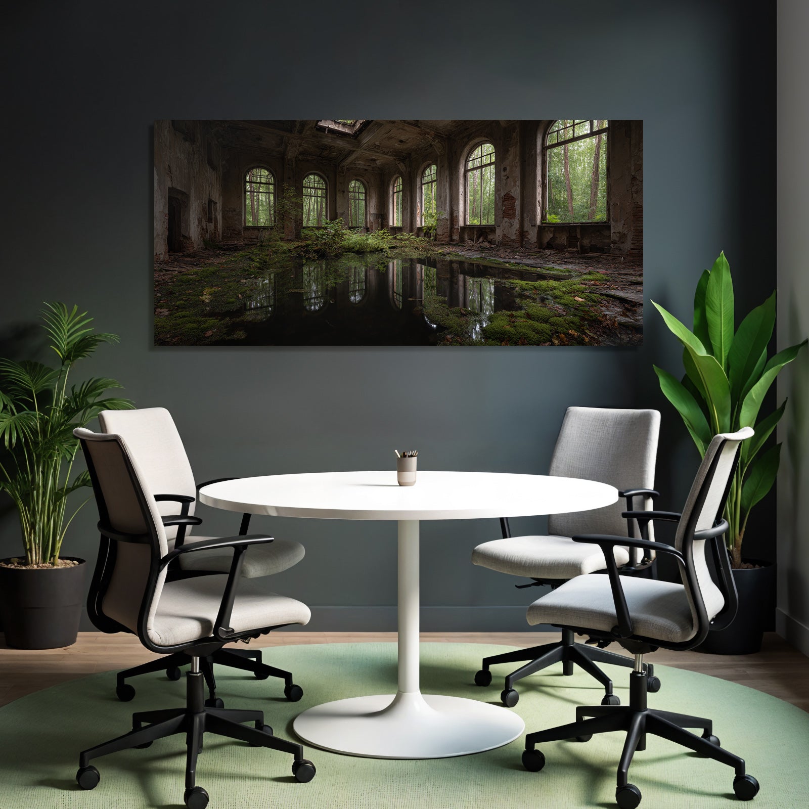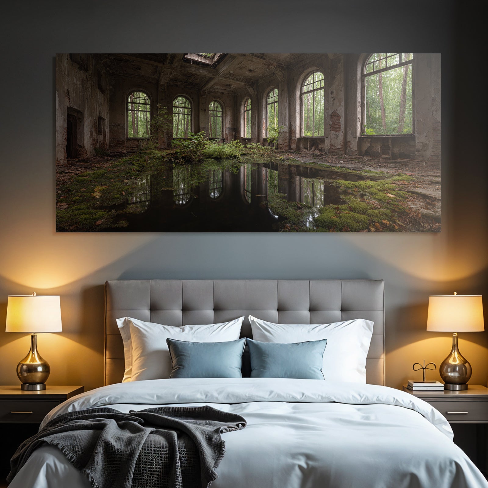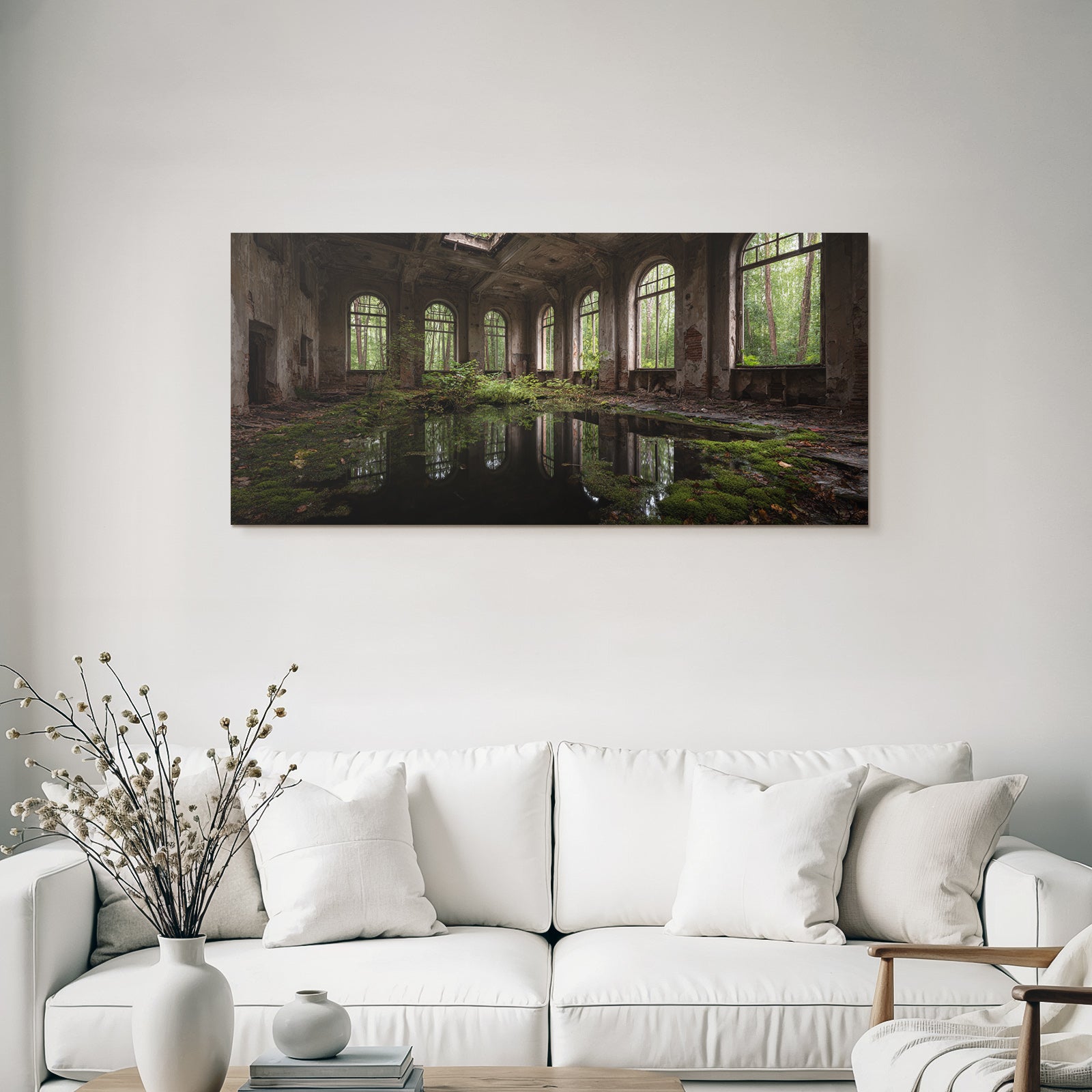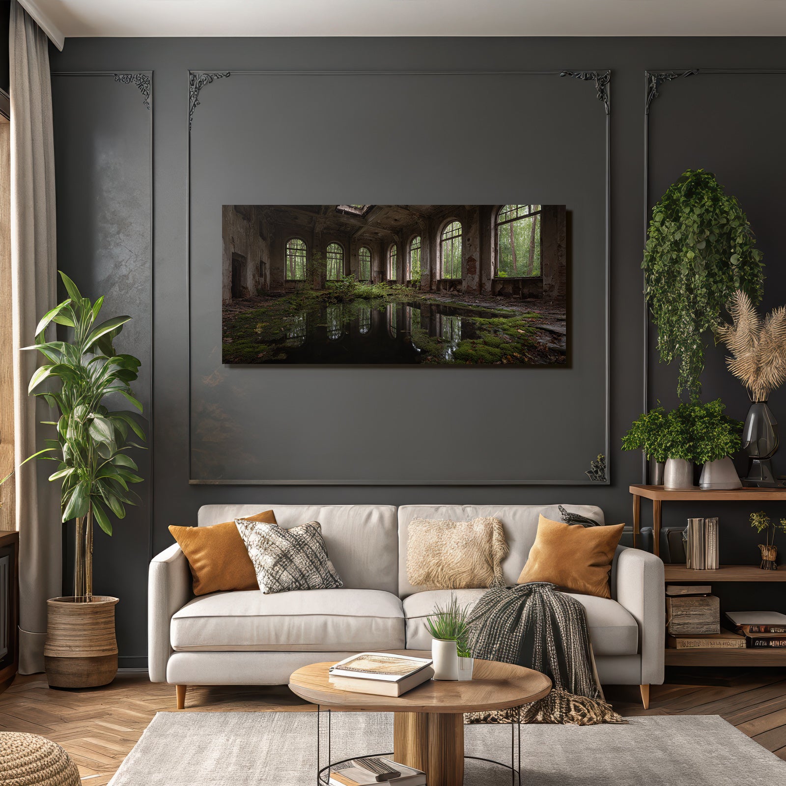 „Verlassene Innenansicht Mit Natur Reclamation Und Vegetation“ bringt den Stil Lost Places an Deine Wand – perfekt für Schlafzimmer, Homeoffice oder Besprechungsräume, edel gerahmt im FameFrame™.