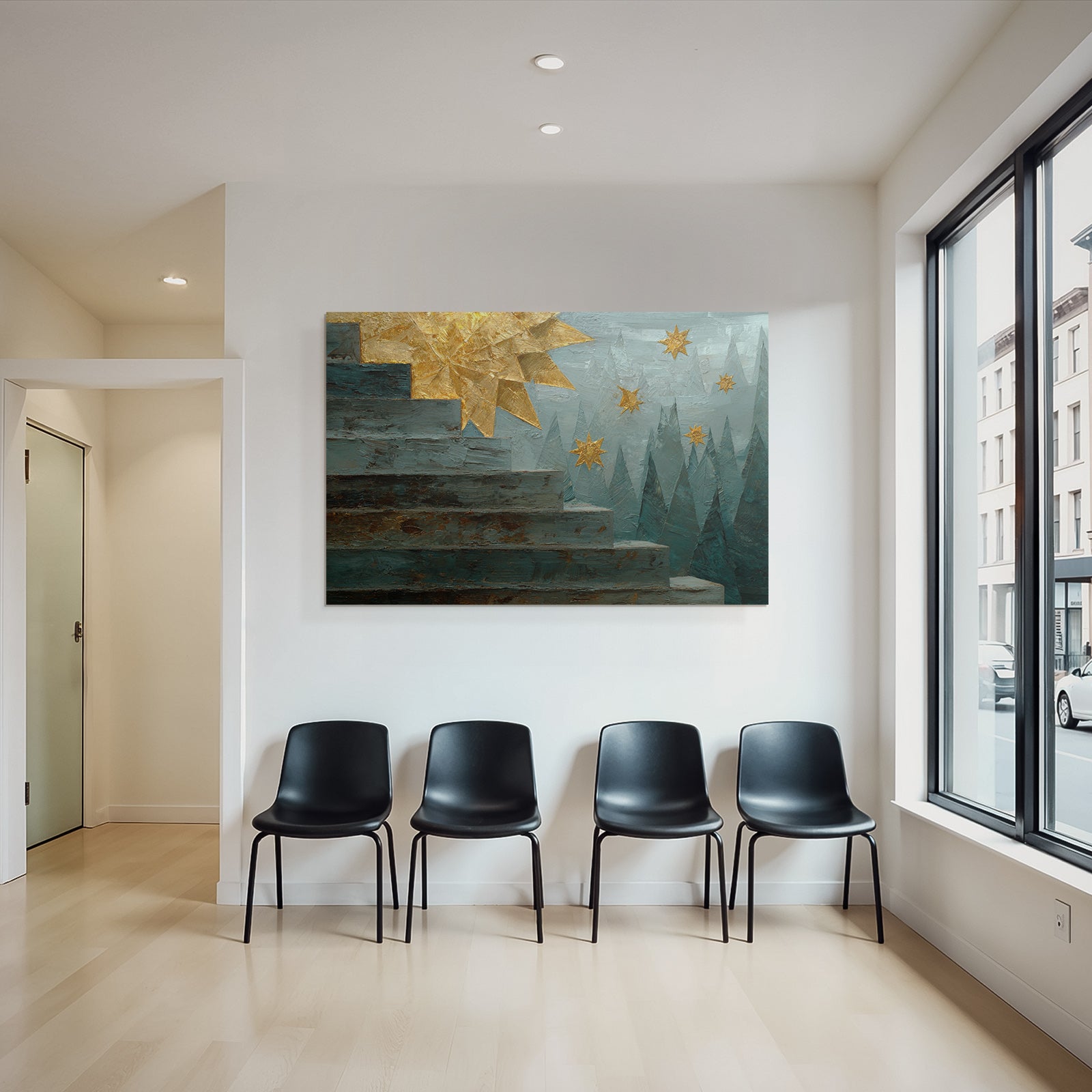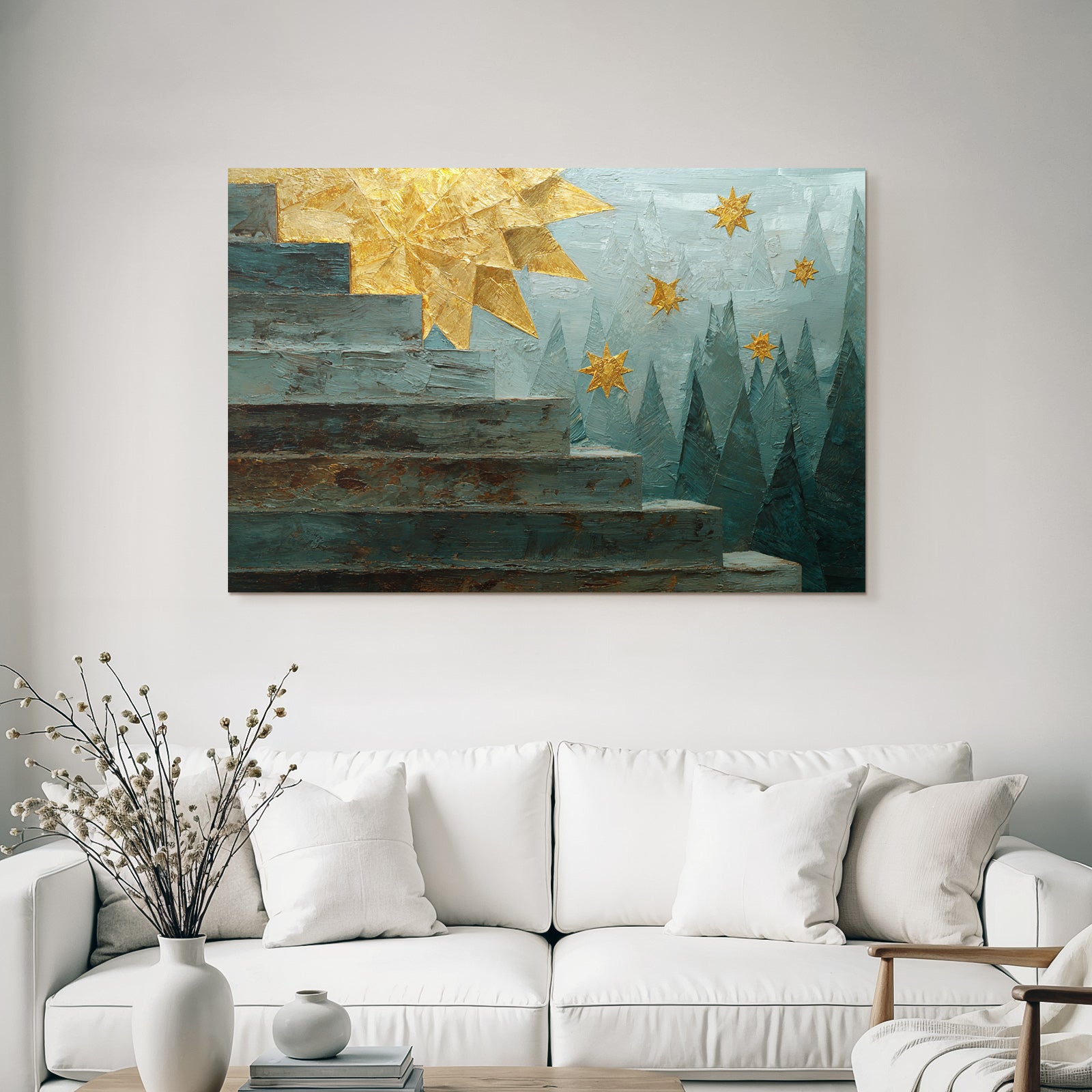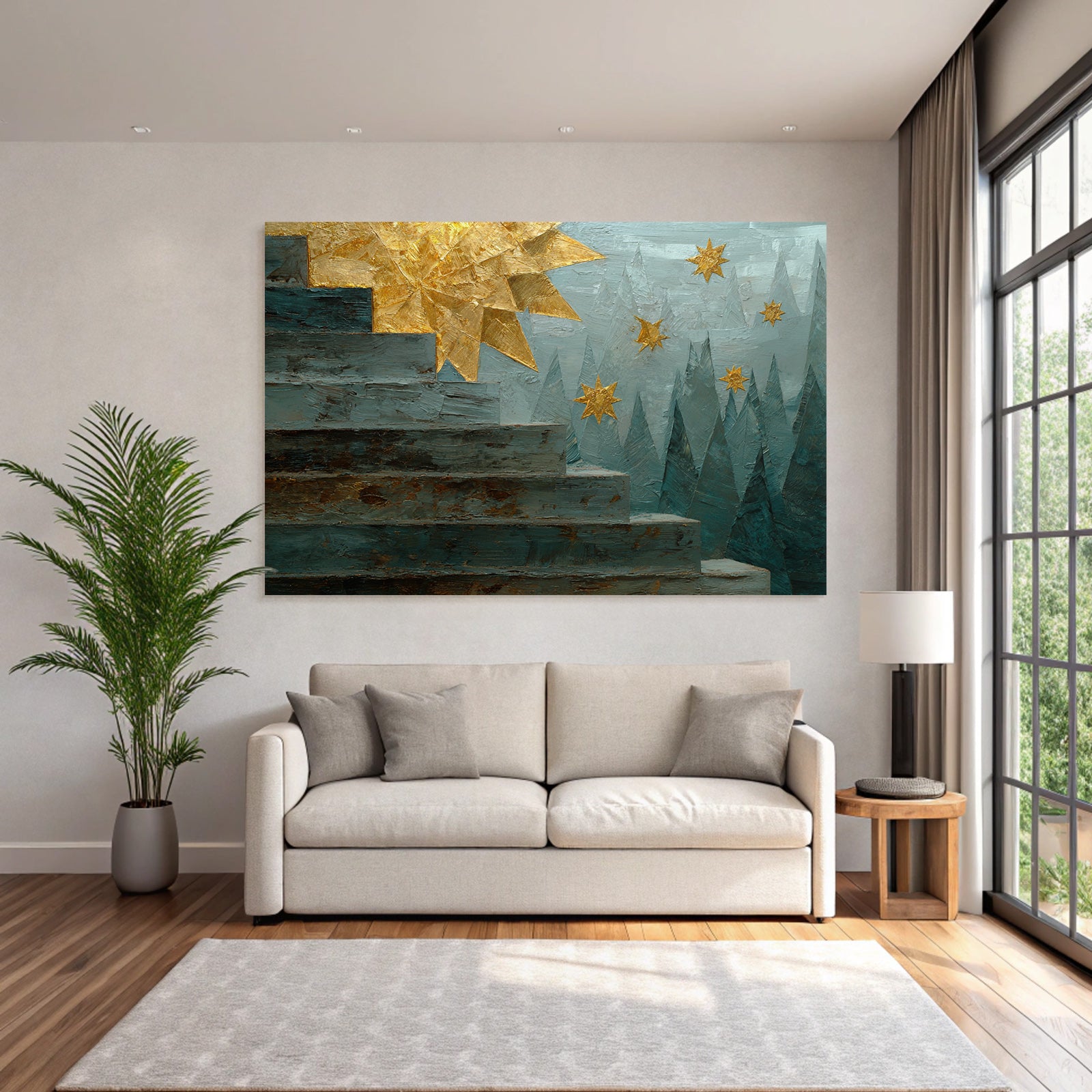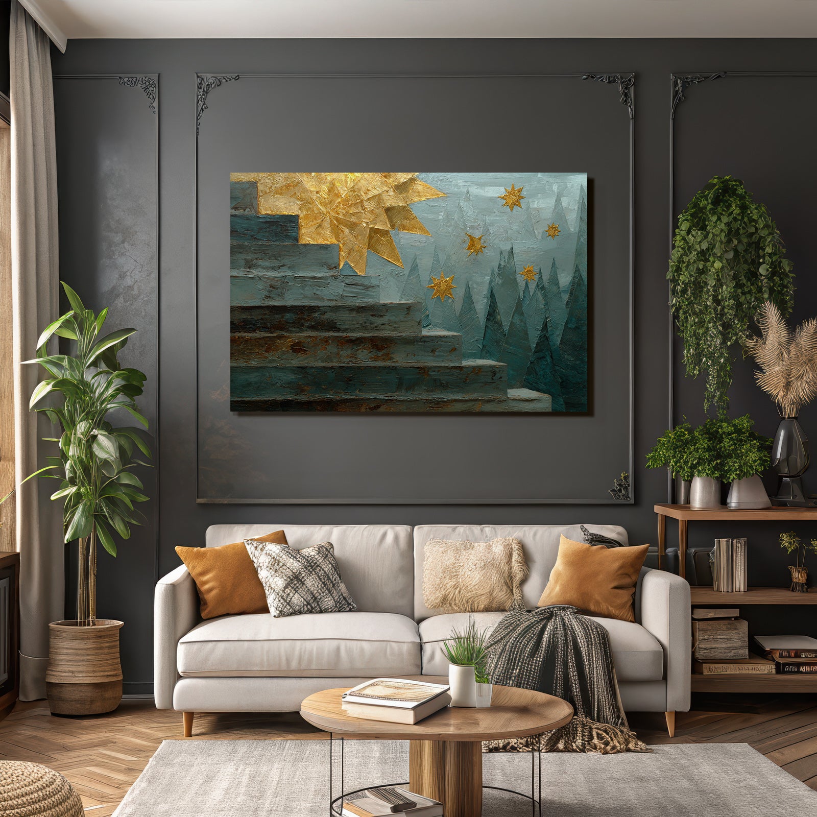 Verwandeln Sie Ihr Schlafzimmer in eine Oase der Ruhe. Das Motiv „ArtDeco Aufstieg Zum Goldenen Stern“ im Stil Art Deco wirkt im FameFrame™ besonders harmonisch und beruhigend.