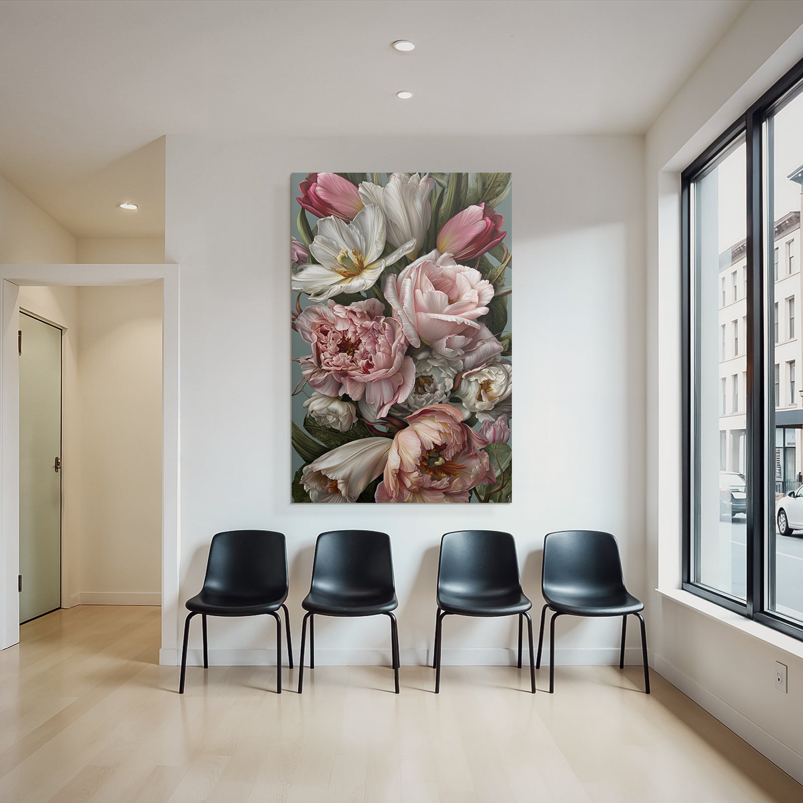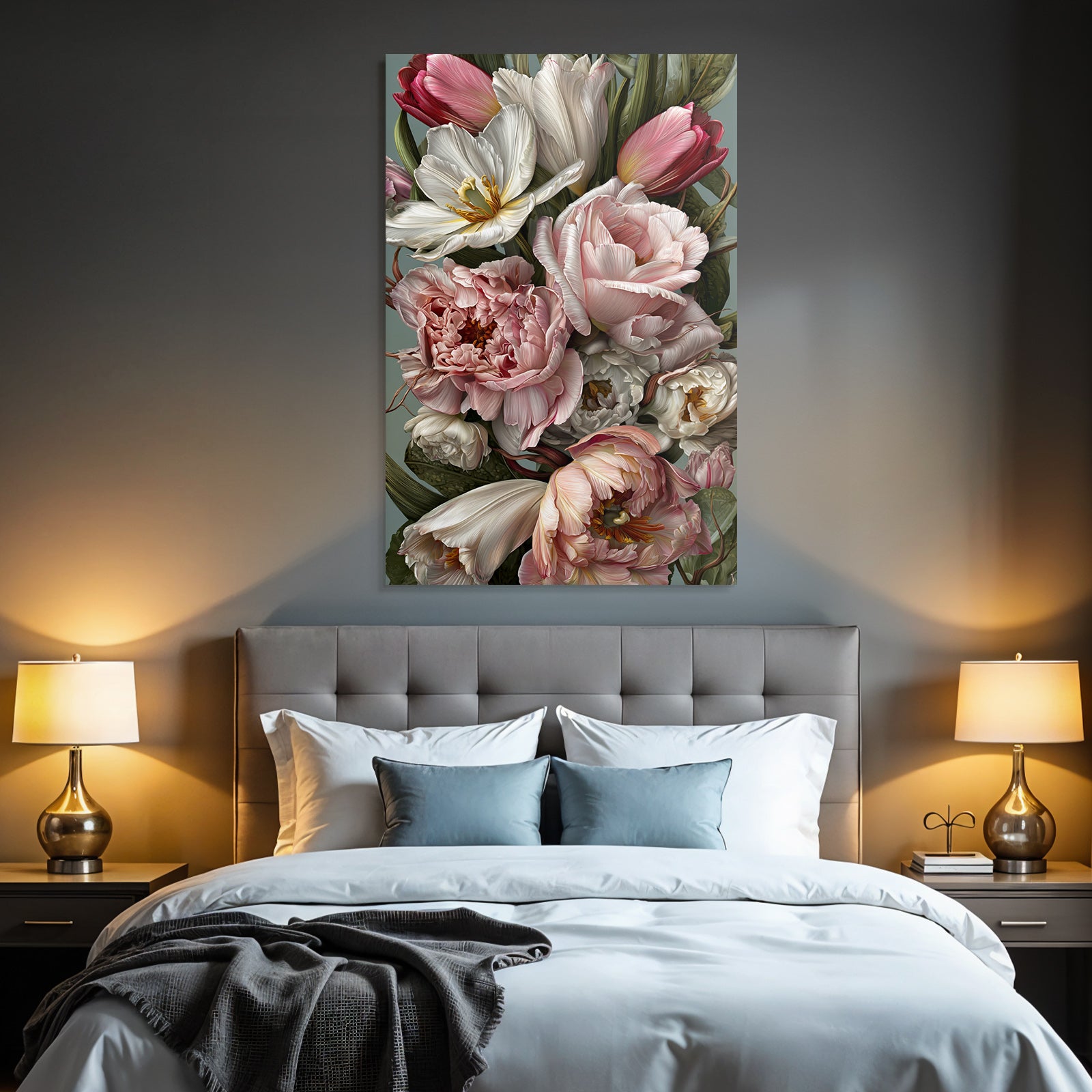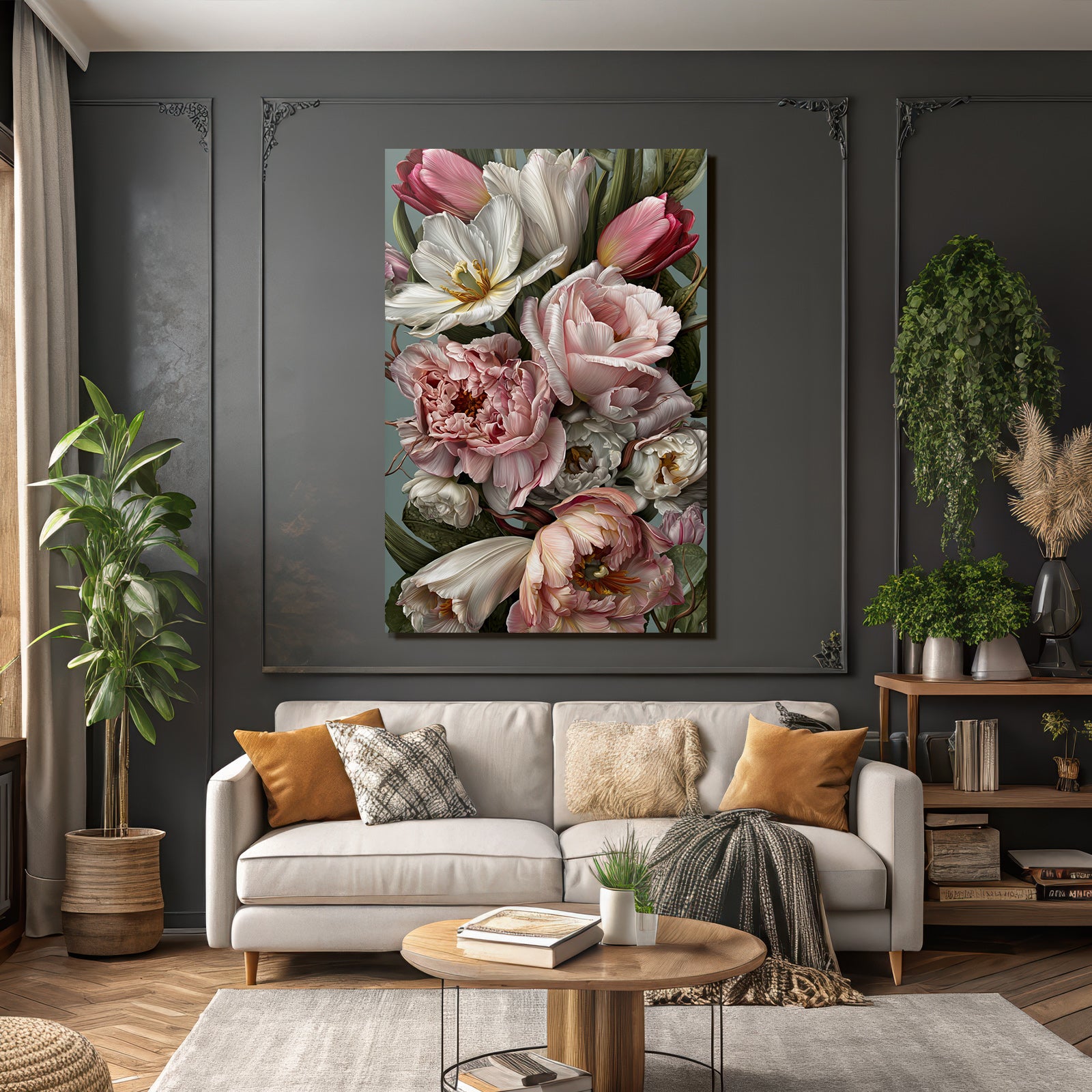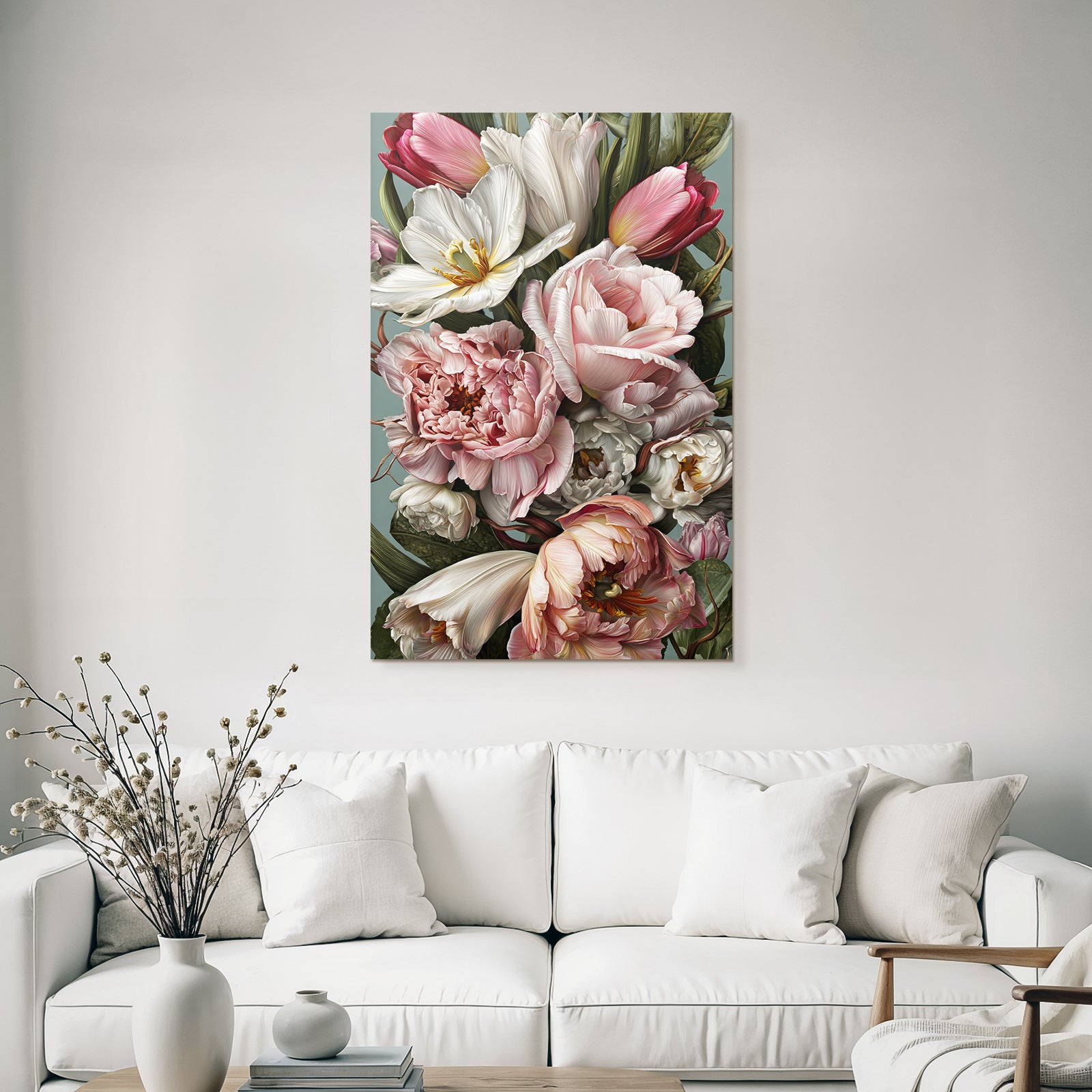 Setze Akzente im Esszimmer, Salon oder Praxisraum mit dem Kunstwerk „Bukett Mit Tulpen Und Pfingstrosen In Sanften Pastelltönen“ im Stil Rosen Tulpen Lavendel – gespannt im edlen FameFrame.