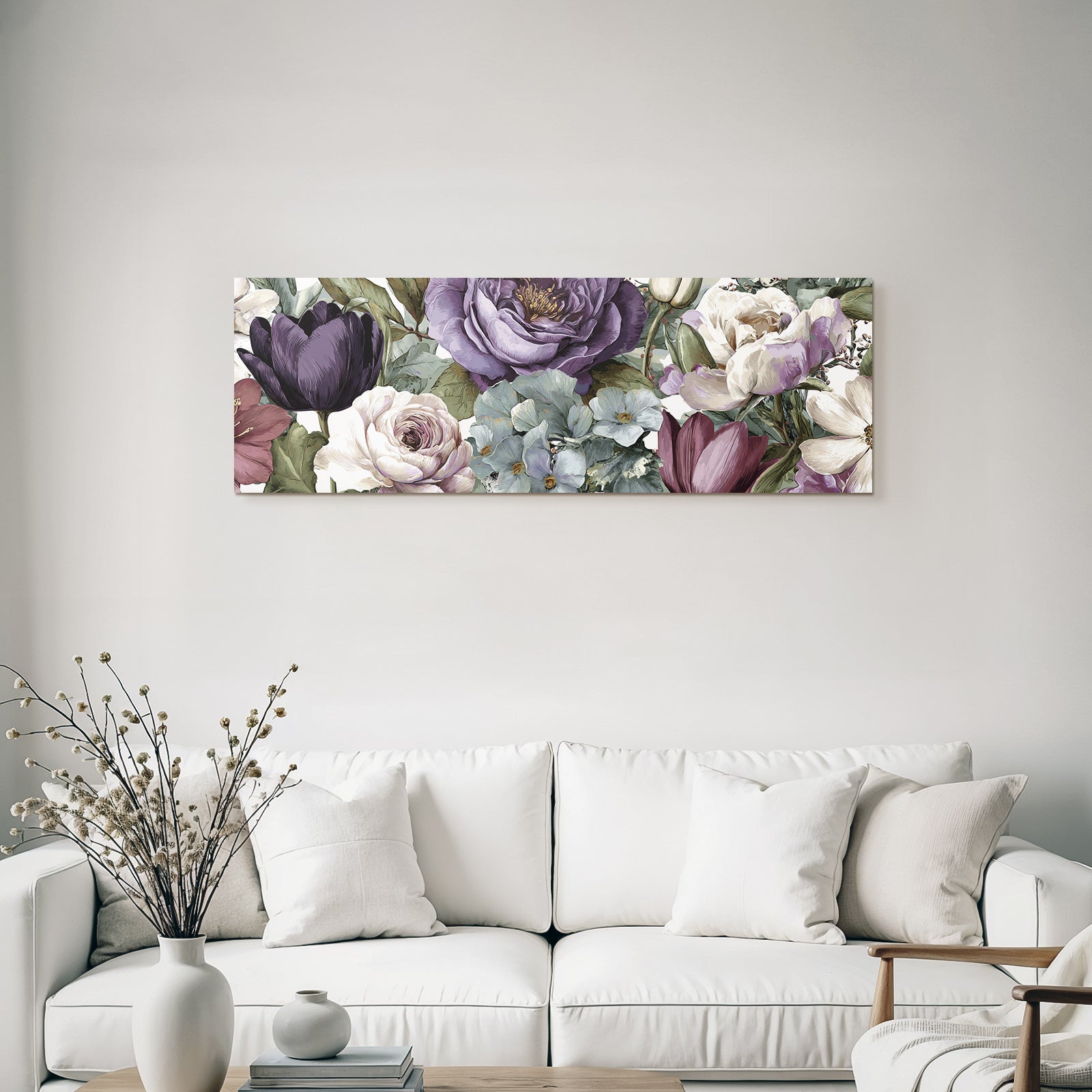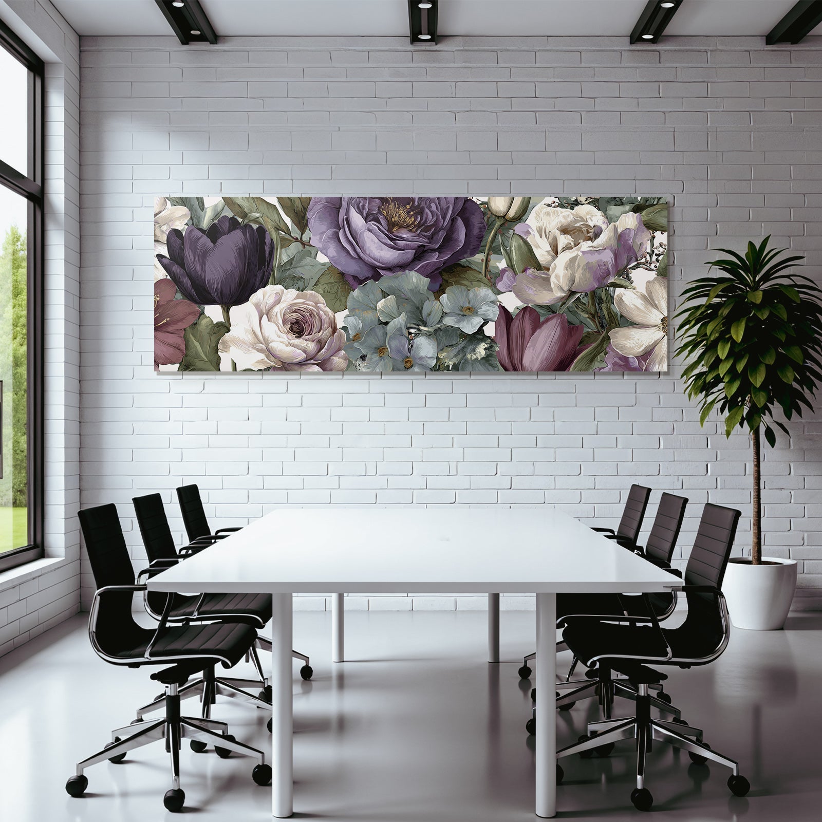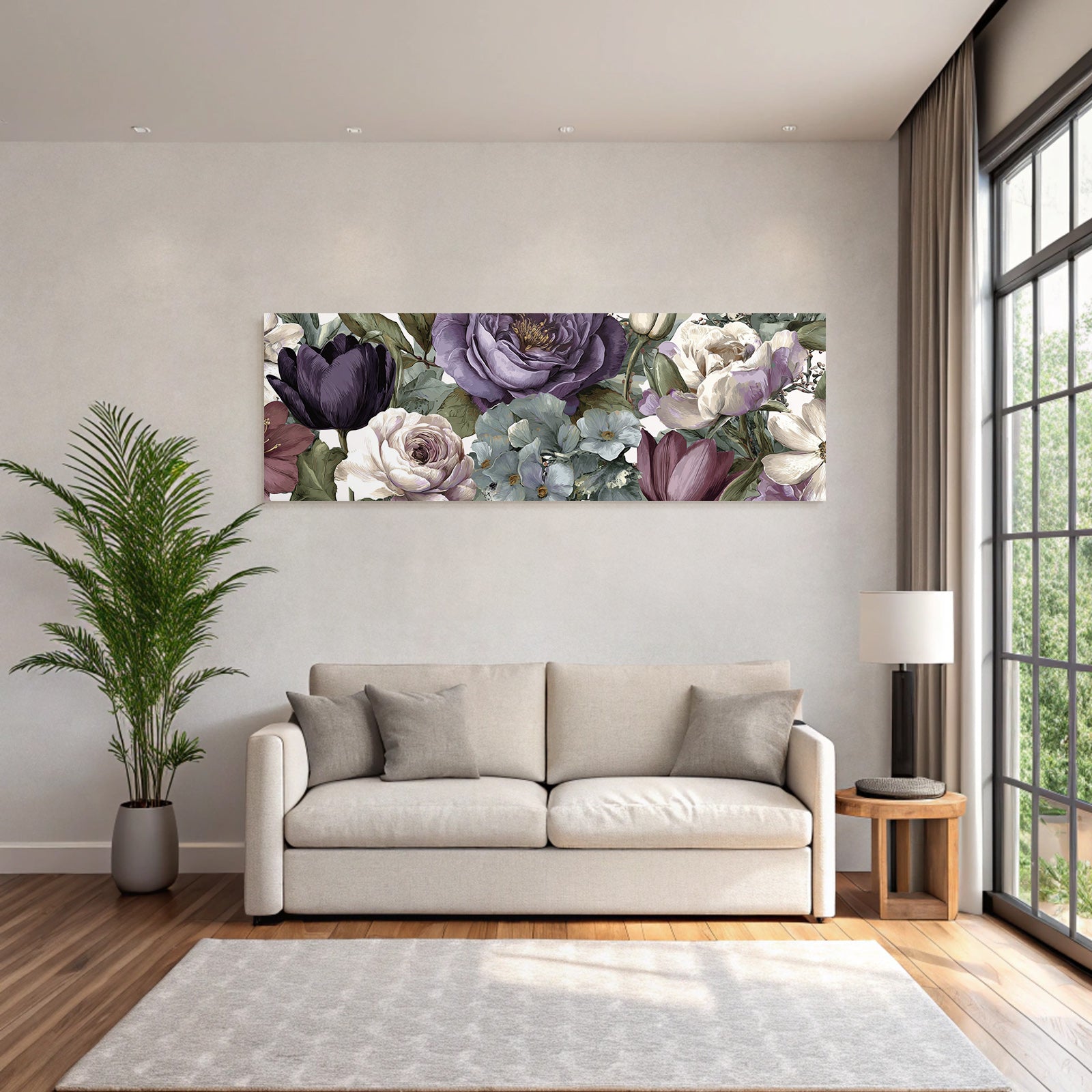 Ob Flur, Wohnraum oder Wartebereich – das Motiv „Frühlings Tulpen Rosen Muster“ im Stil Rosen Tulpen Lavendel wirkt durch den hochwertigen FameFrame besonders modern.