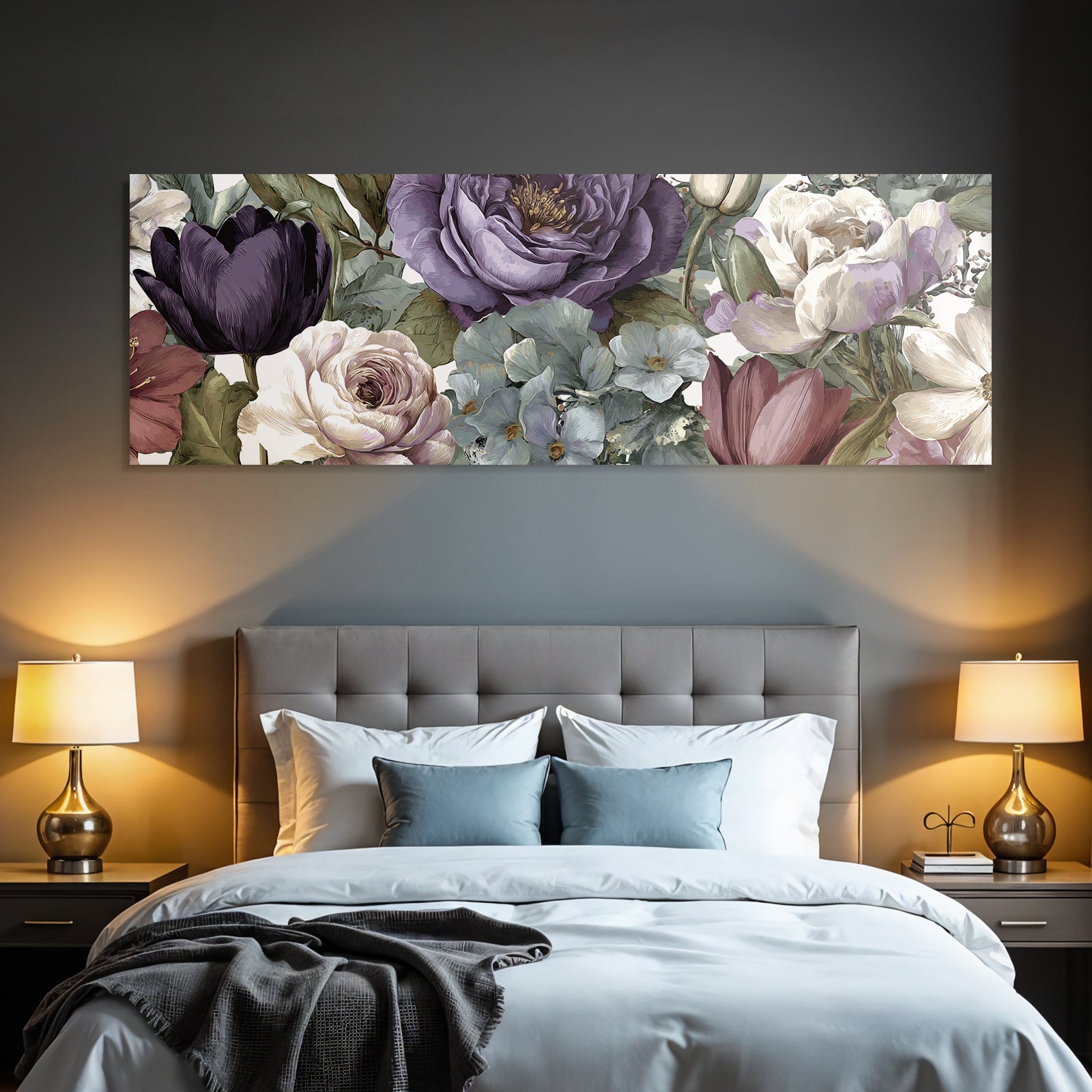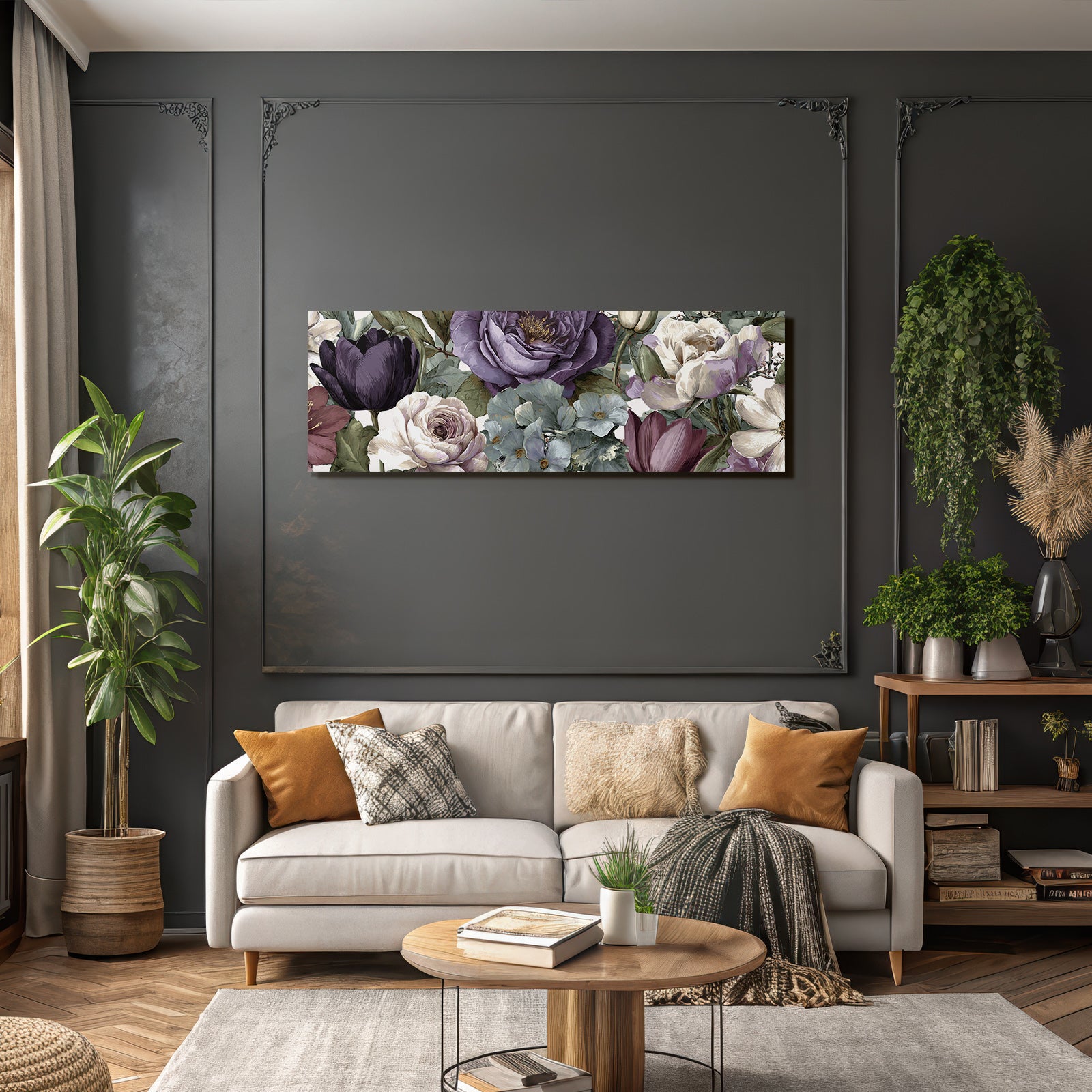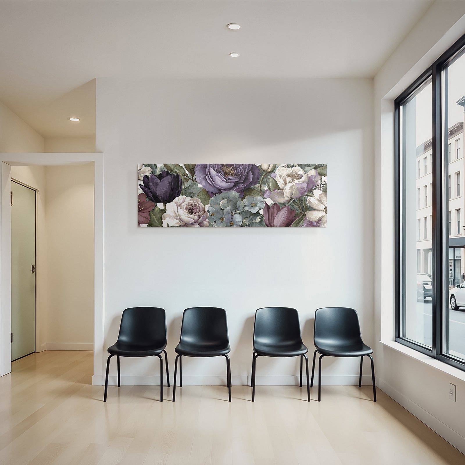 Ob Flur, Wohnraum oder Wartebereich – das Motiv „Frühlings Tulpen Rosen Muster“ im Stil Rosen Tulpen Lavendel wirkt durch den hochwertigen FameFrame besonders modern.
