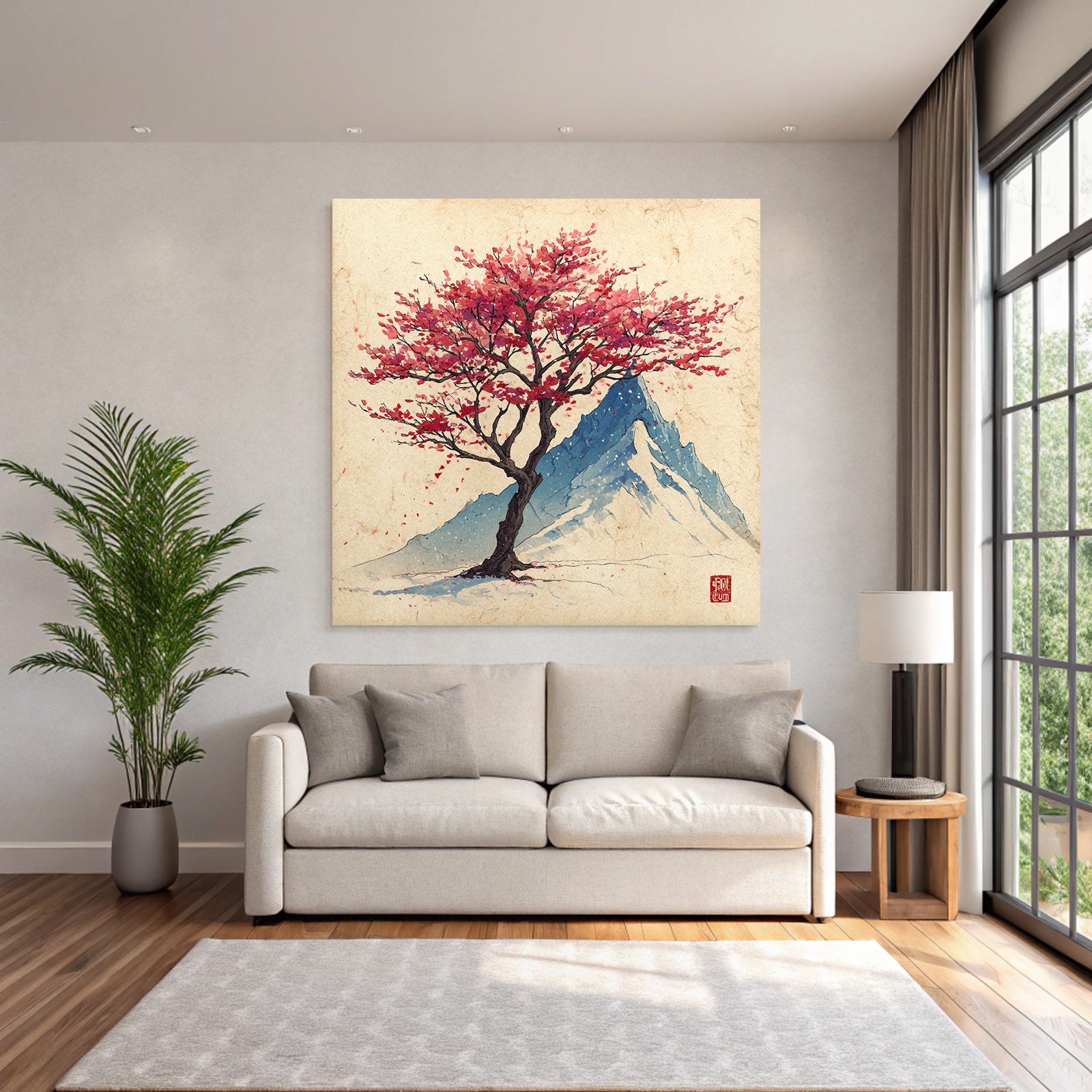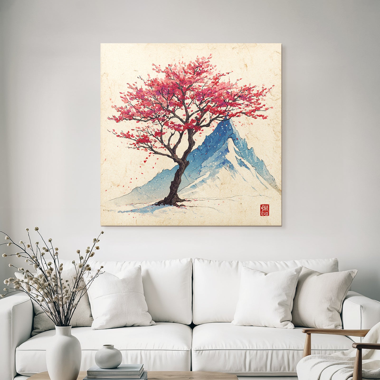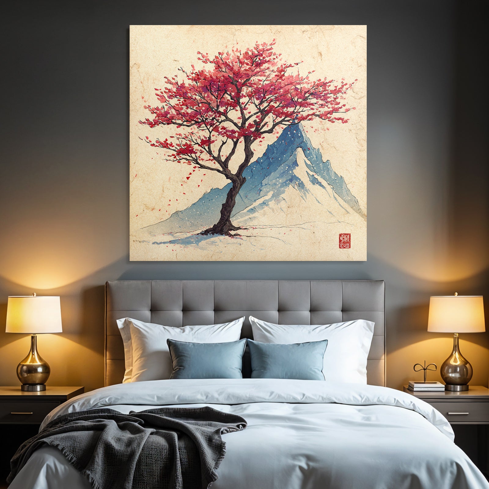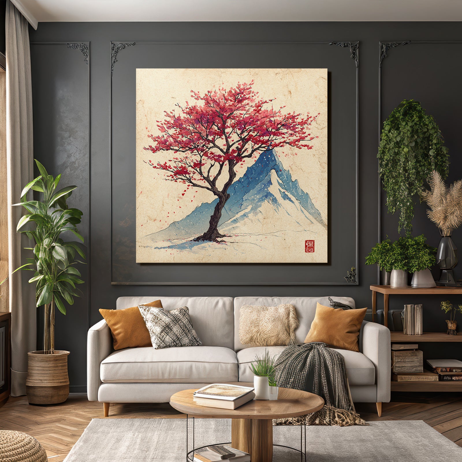 Verschönere Dein Zuhause mit diesem Werk im Stil Japanische Zierkirsche. Der Titel „Roter Baum Vor Blaüm Berg Wasserfarben Auf Altem Papier“ kommt im hochwertigen FameFrame perfekt zur Geltung.