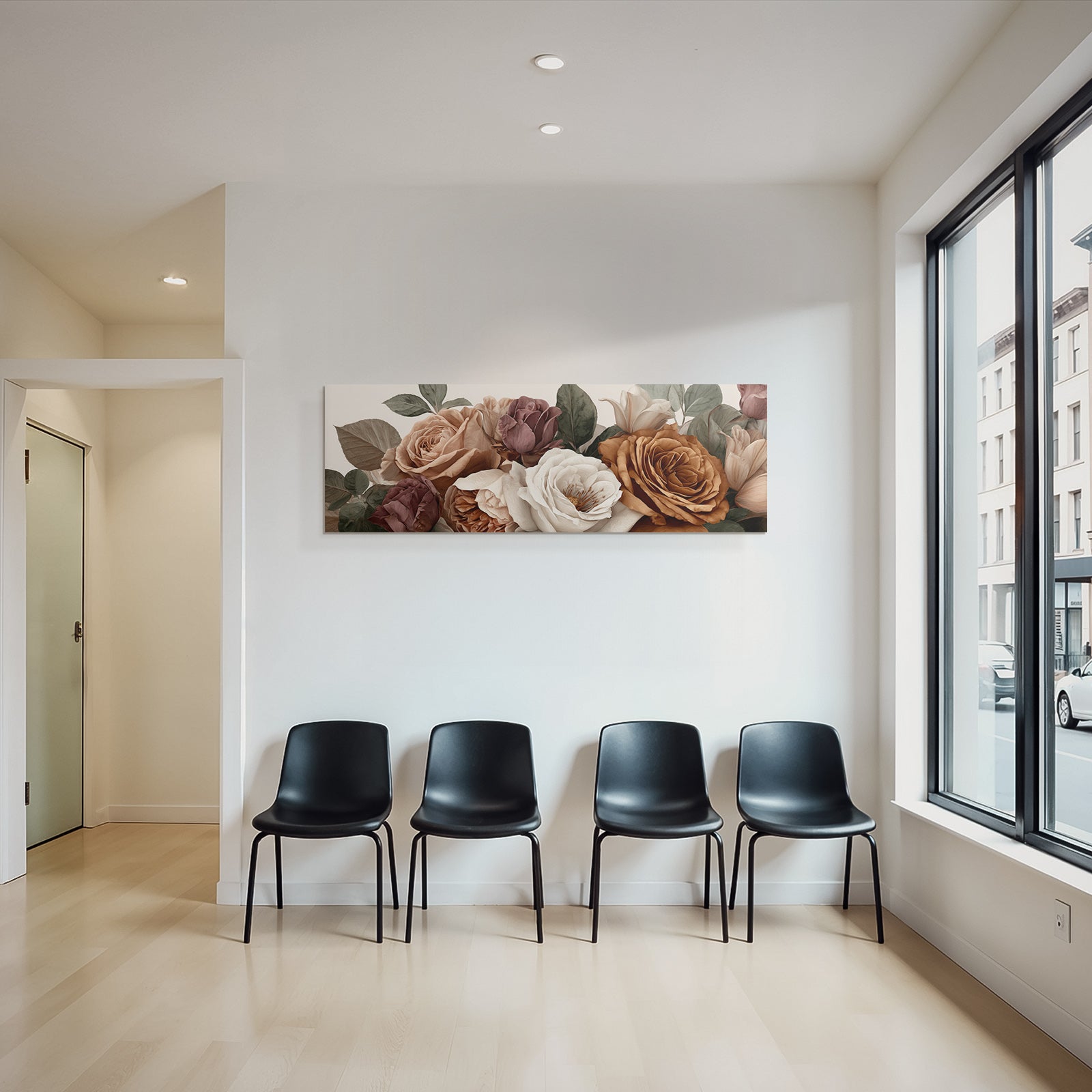 Ein einzigartiges Kunstwerk der Produktlinie FameFrame mit dem Titel „Sanftes Rosengesteck Mit Blättern In Beige Creme Terrakotta Und Mauve Im Malerischen Stil“, im Stil Rosen Tulpen Lavendel.