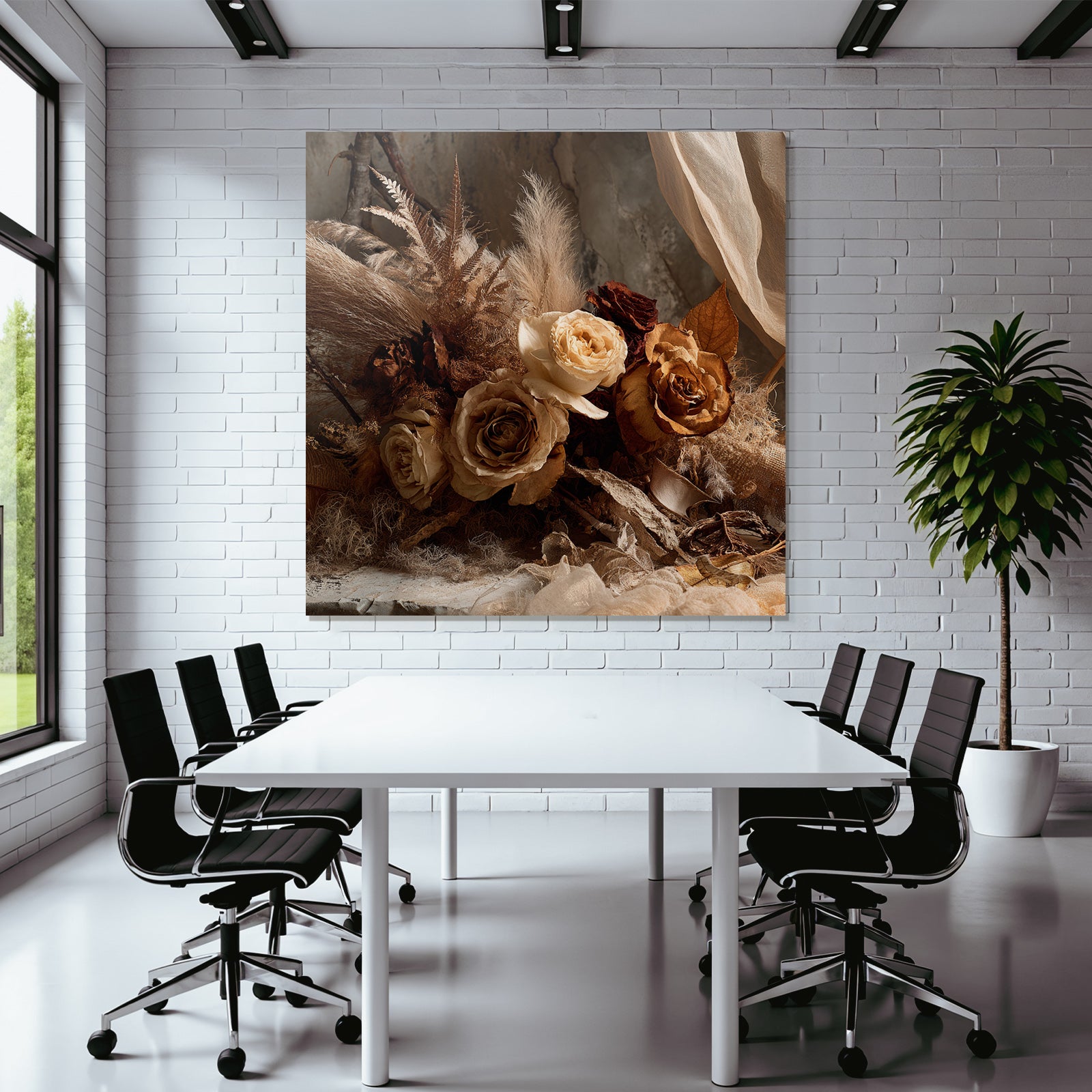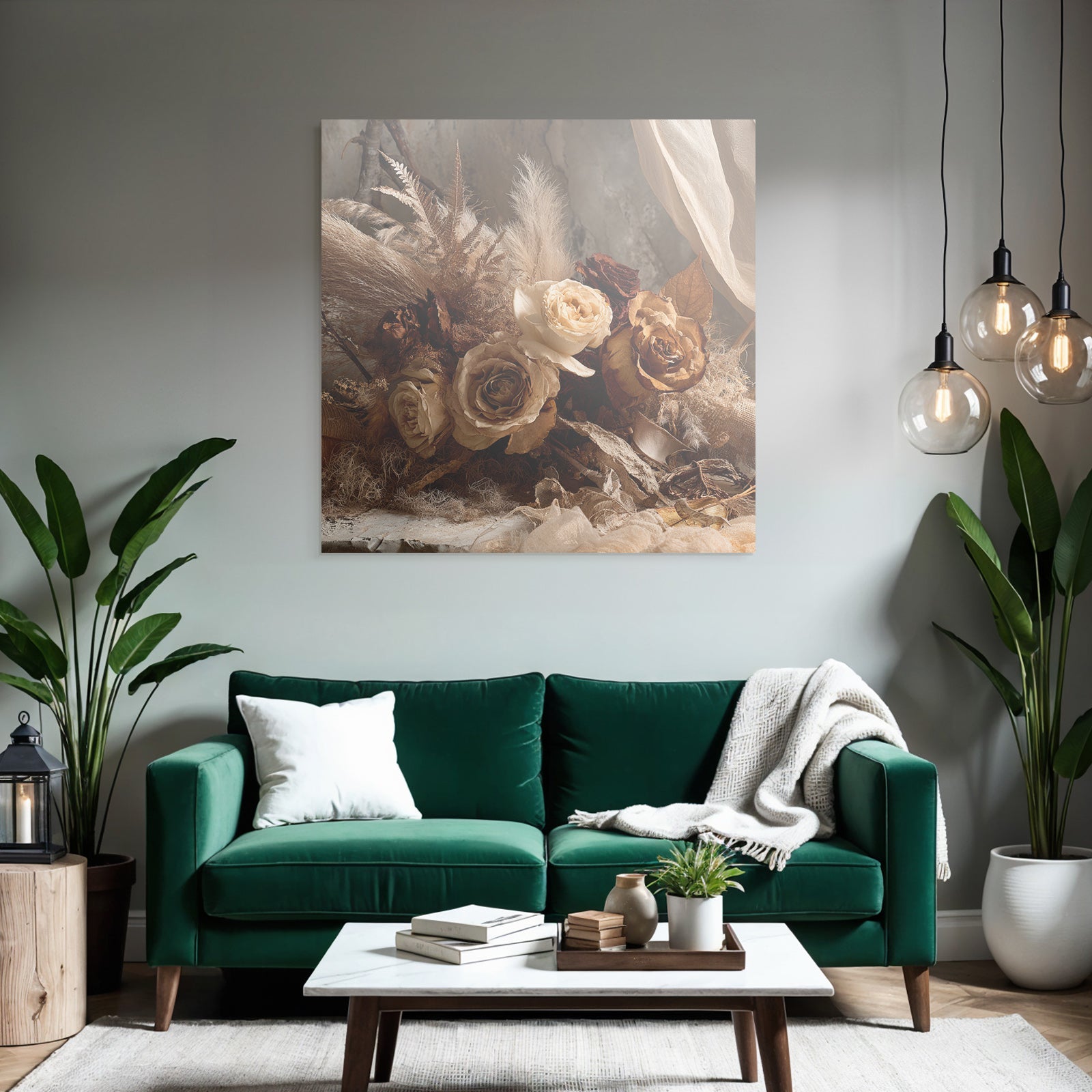 Für Liebhaber des Trockenblumen Retro Flowers-Looks: Das Kunstwerk „Trocken Retro Flowers Getrocknete Rosen Flower Arrangement Erdige Tonpalette Rustikaler Stil“ bringt die charakteristischen Merkmale dieses Stils brillant auf Stoff – perfektioniert durch den FameFrame.