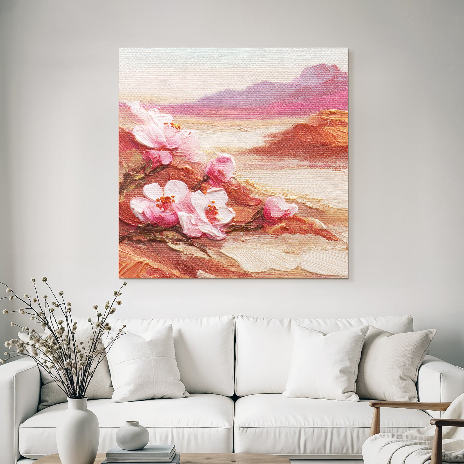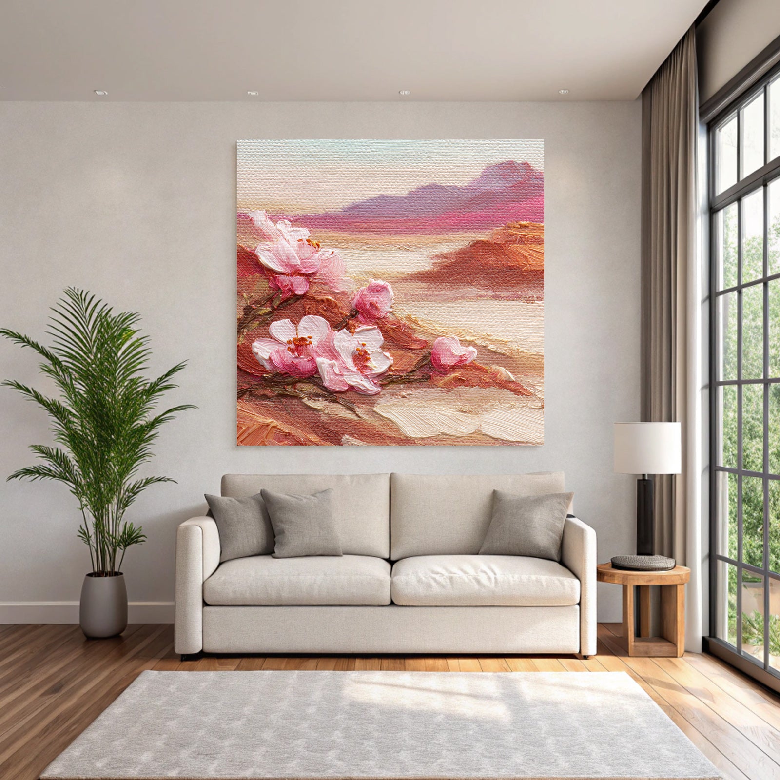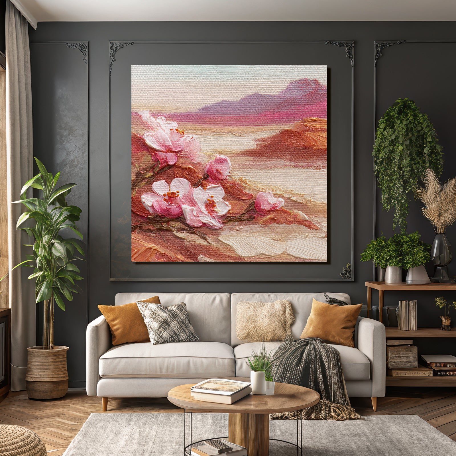 „Zarte Rosa Blüten Vor Pastellgebirge“ verbindet das Beste aus Japanische Zierkirsche mit modernem Textildruck – edel präsentiert im hochwertigen FameFrame.