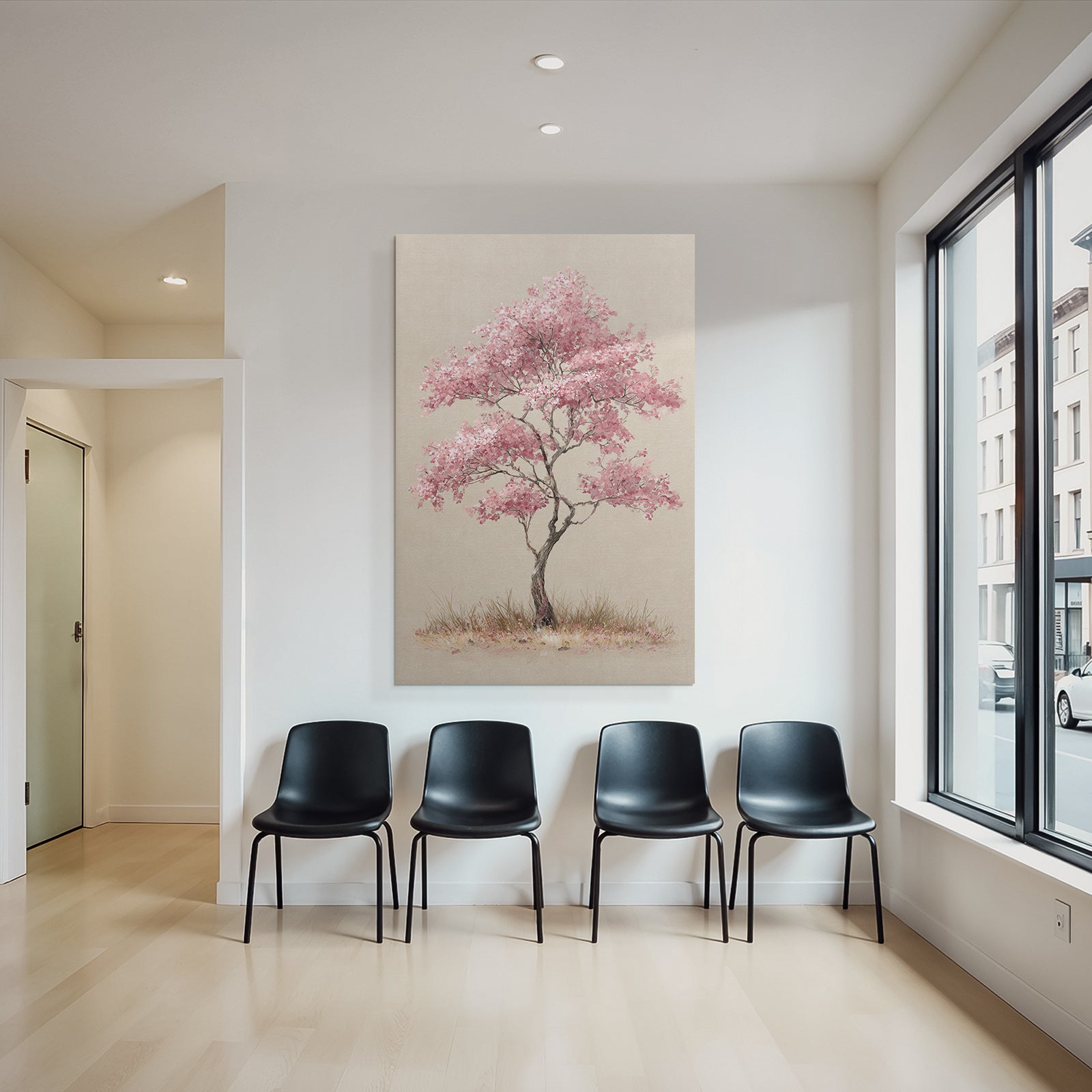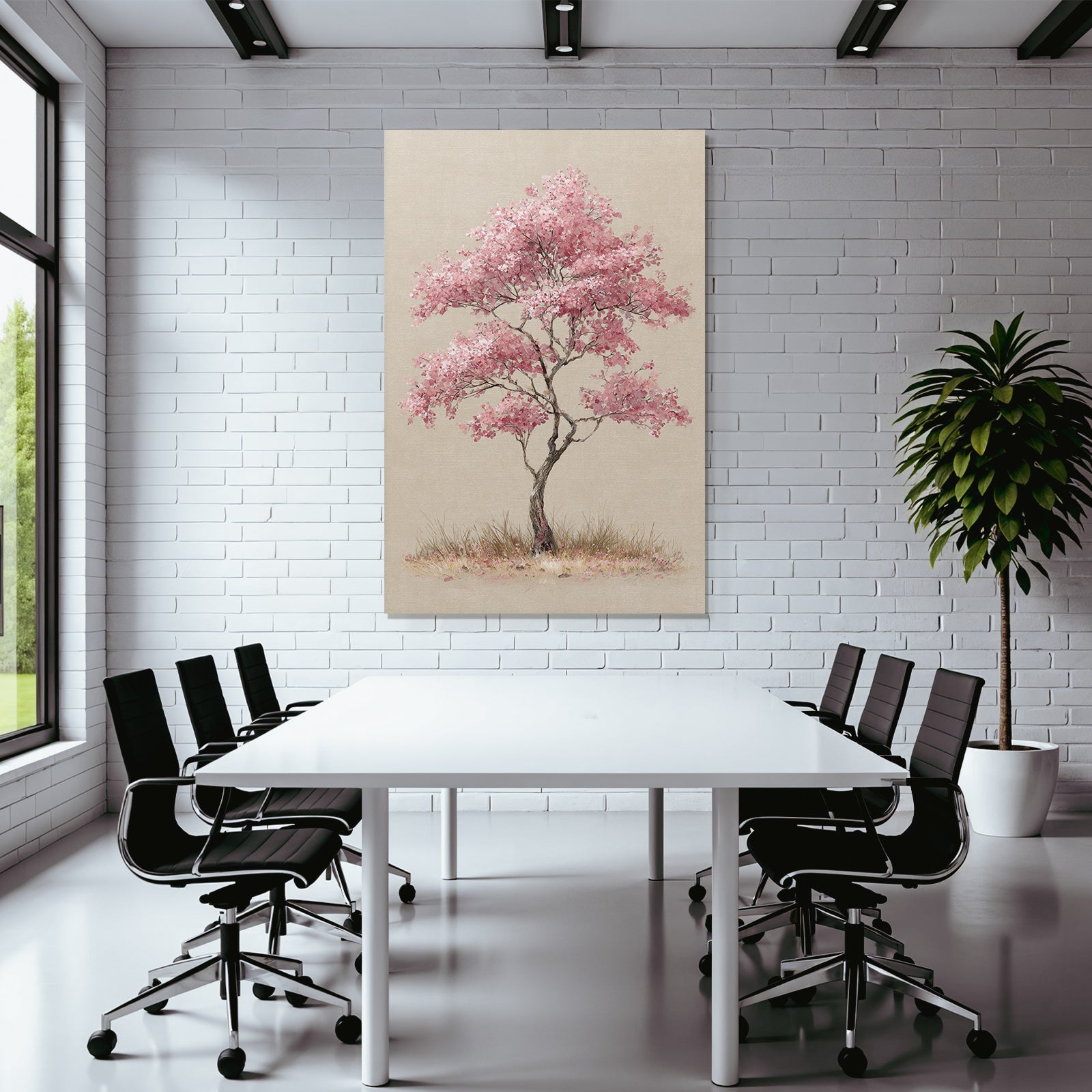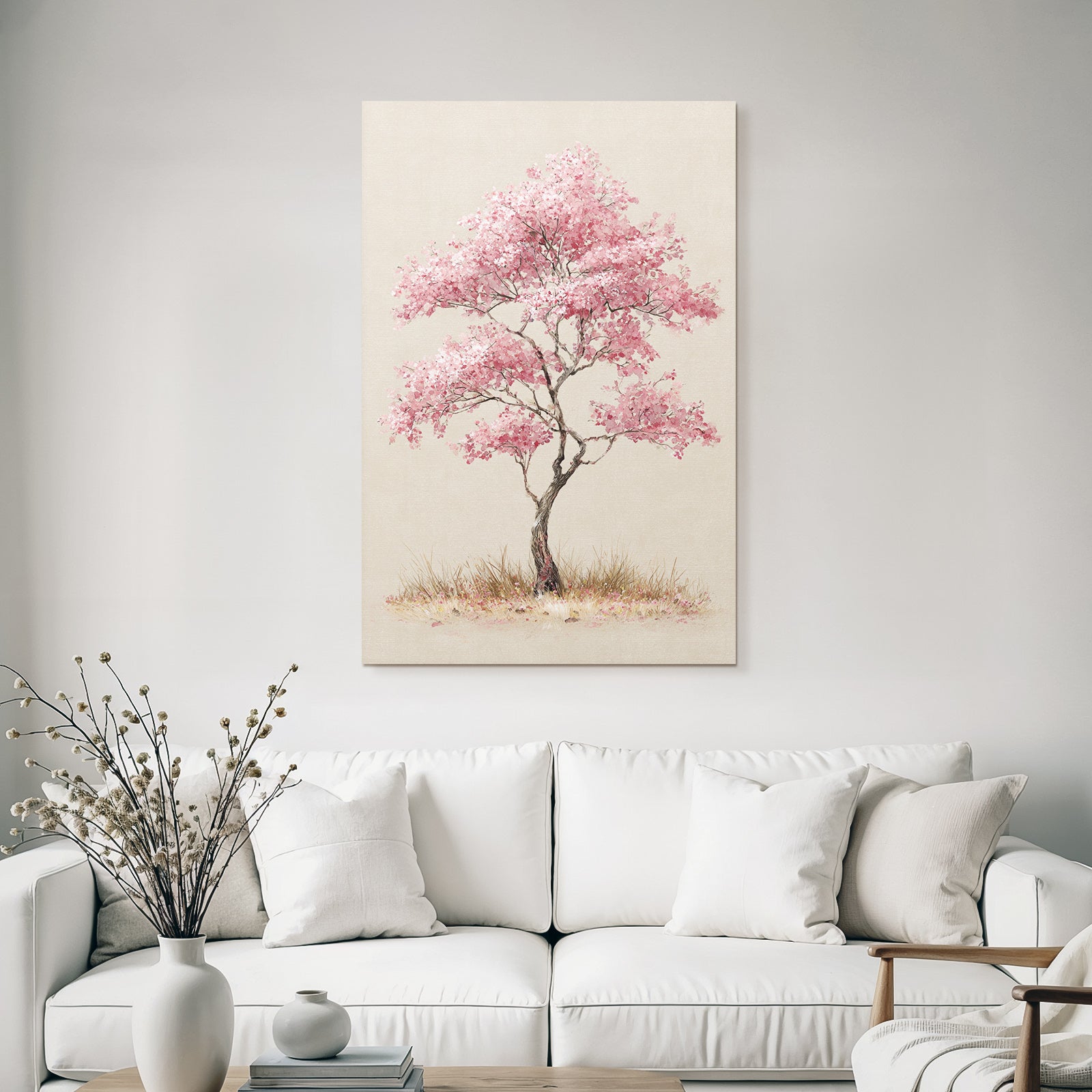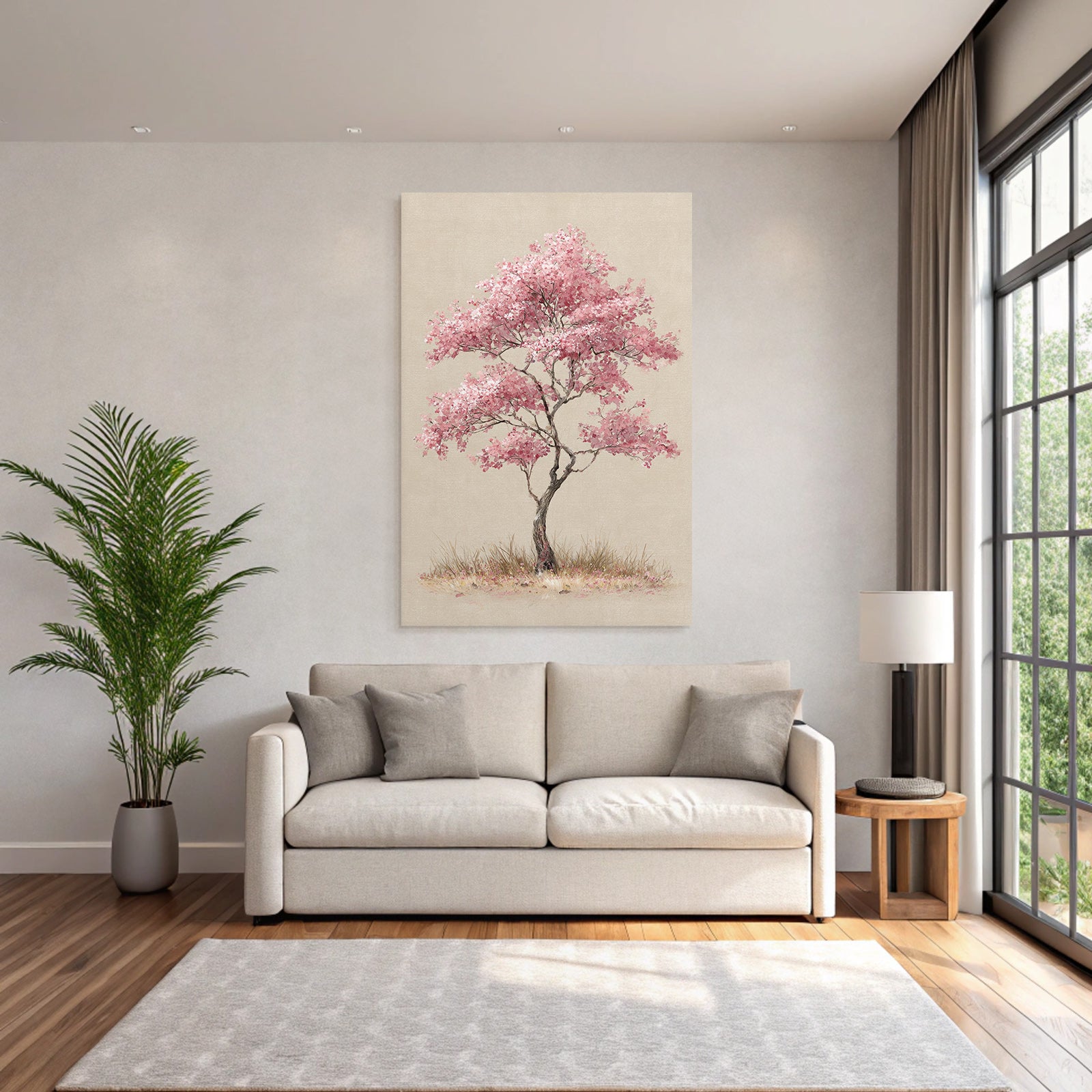 Ein Stück Japanische Zierkirsche für Deine vier Wände: Das Werk „Zartrosa Blütenbaum Auf Beigem Hintergrund“ im hochwertigen FameFrame bringt kreative Energie in jeden Raum.