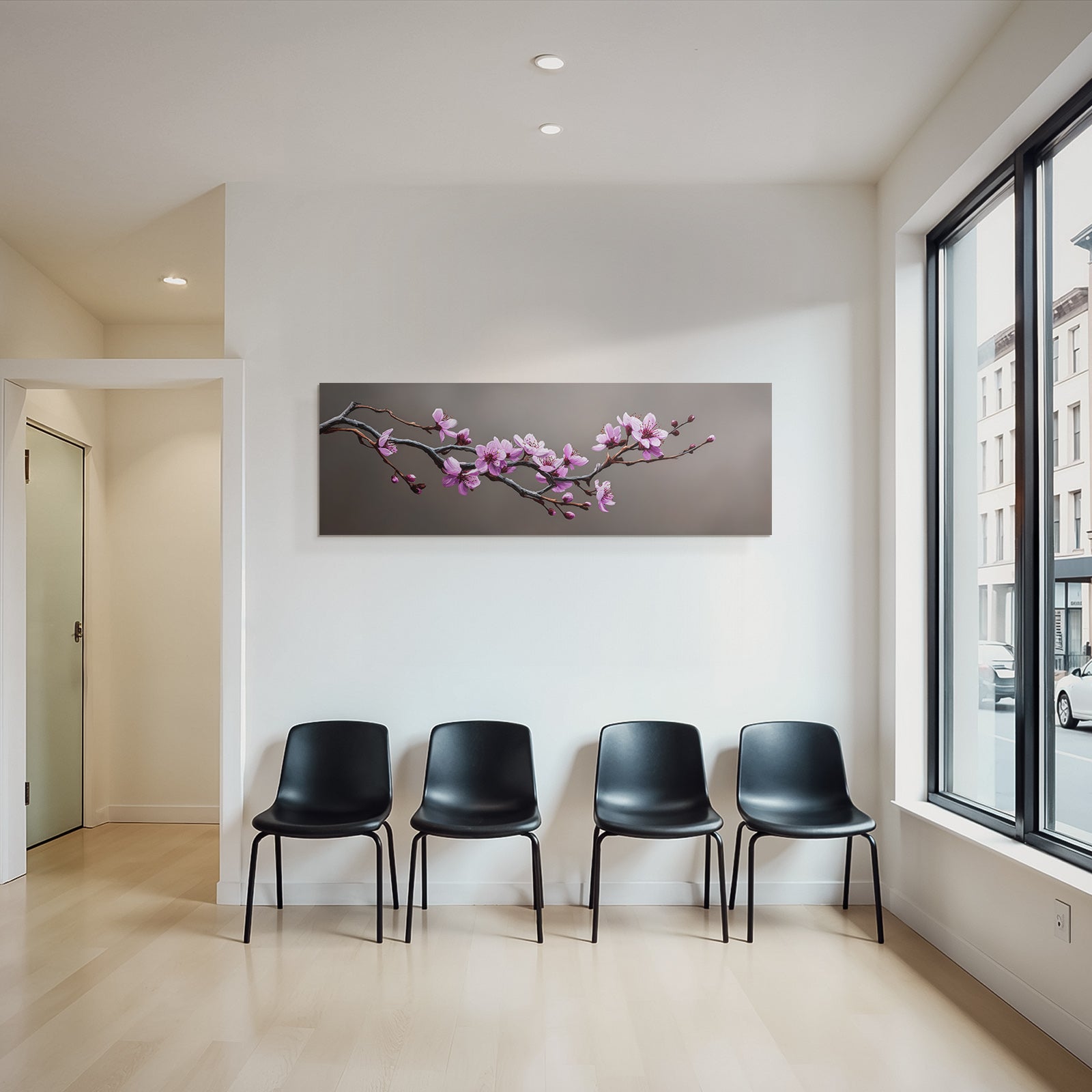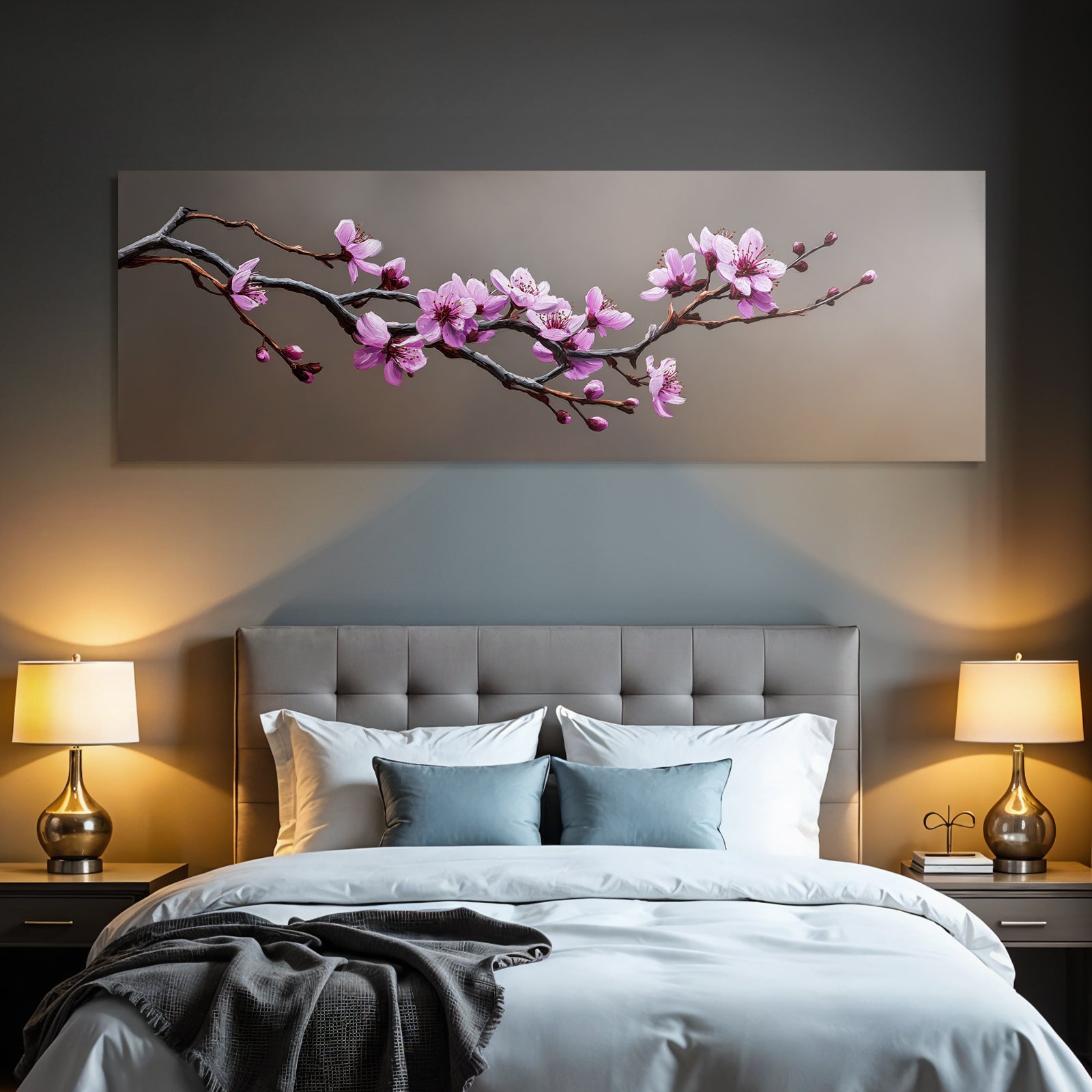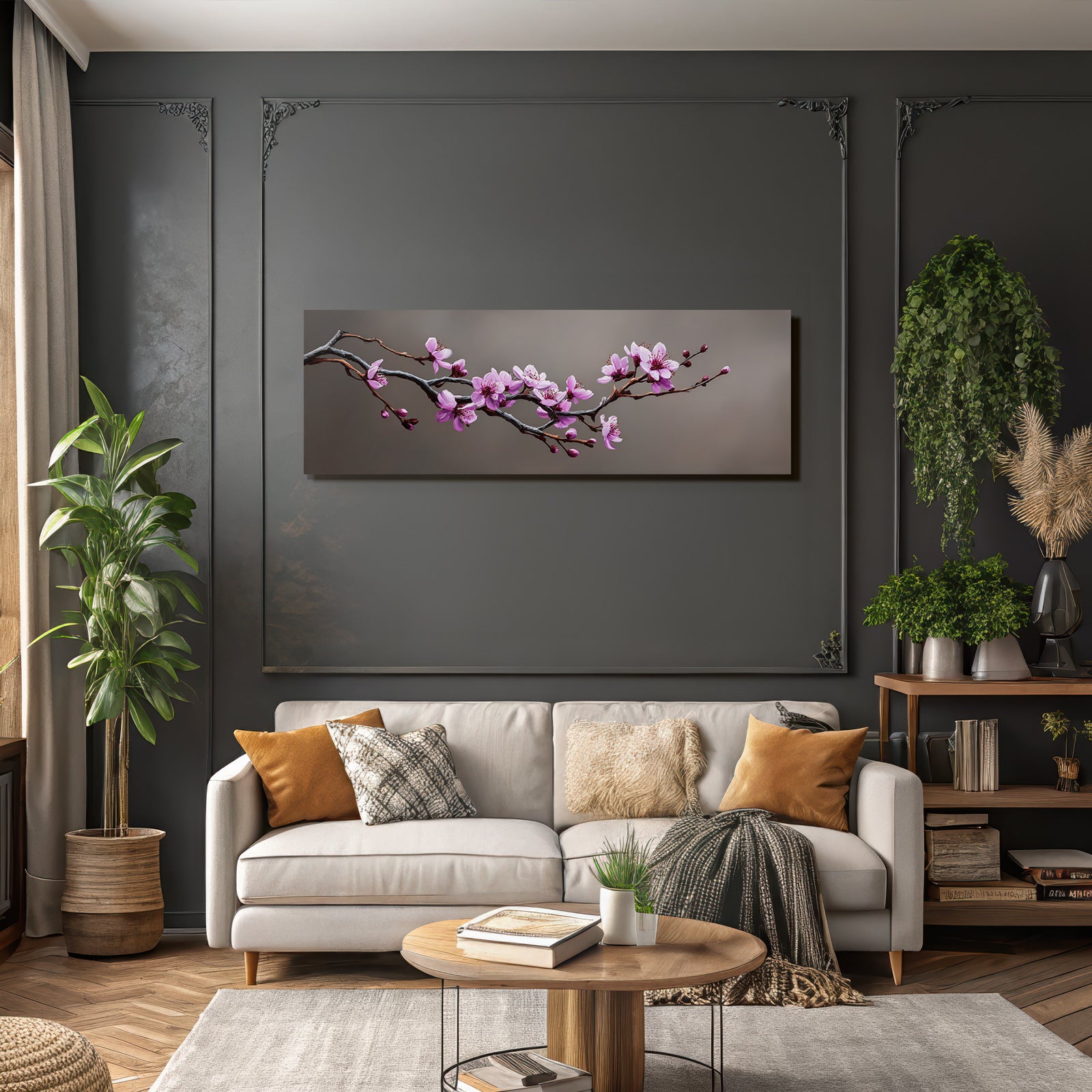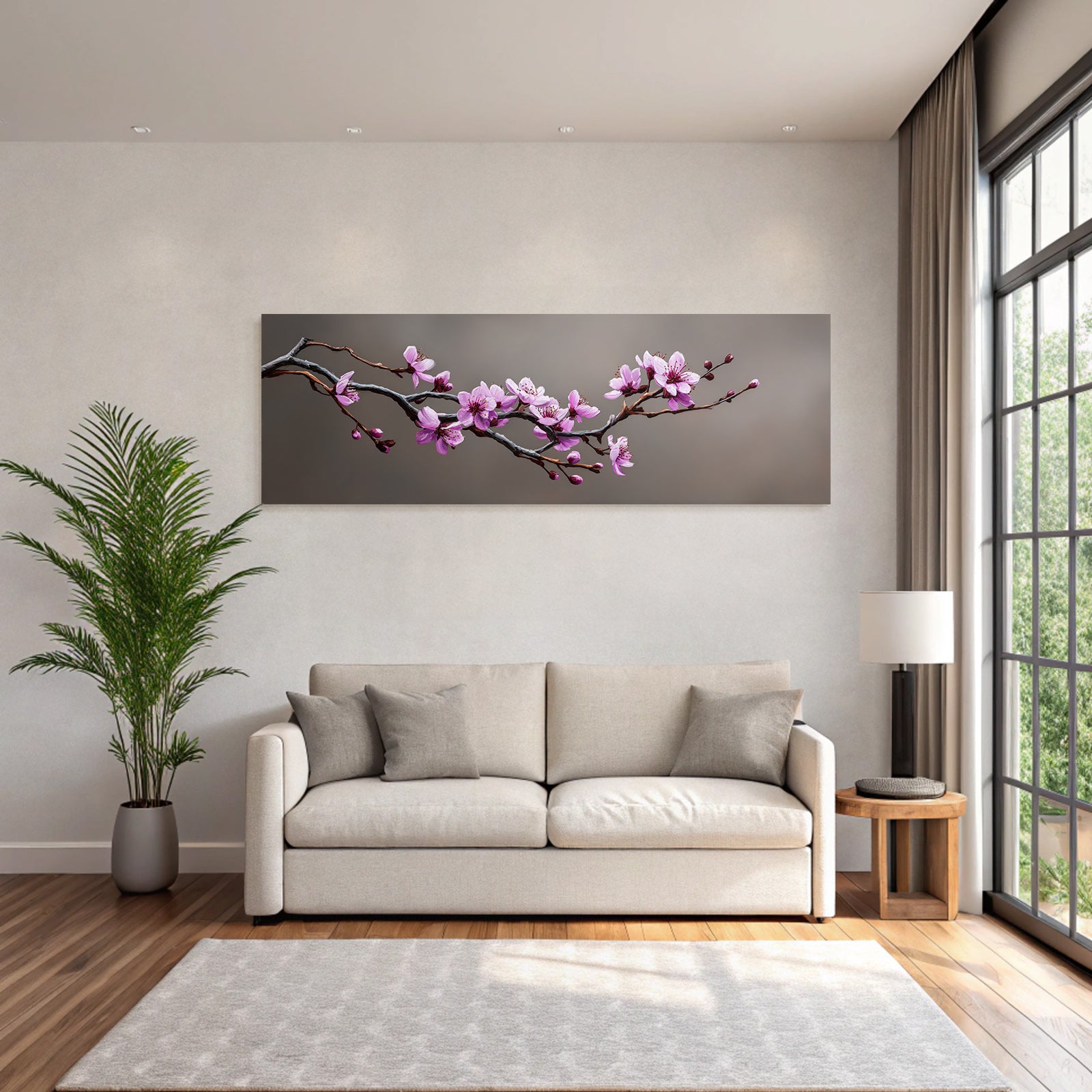 Bring die Atmosphäre von Japanische Zierkirsche in Dein Zuhause – mit „Zweig Mit Rosa Vor Gedämpftem Hintergrund“ auf Stoff im austauschbaren FameFrame.