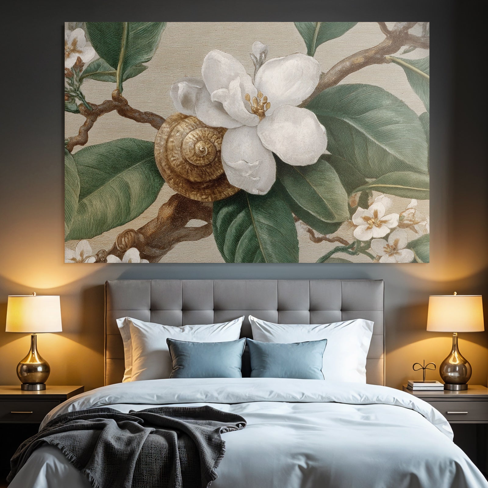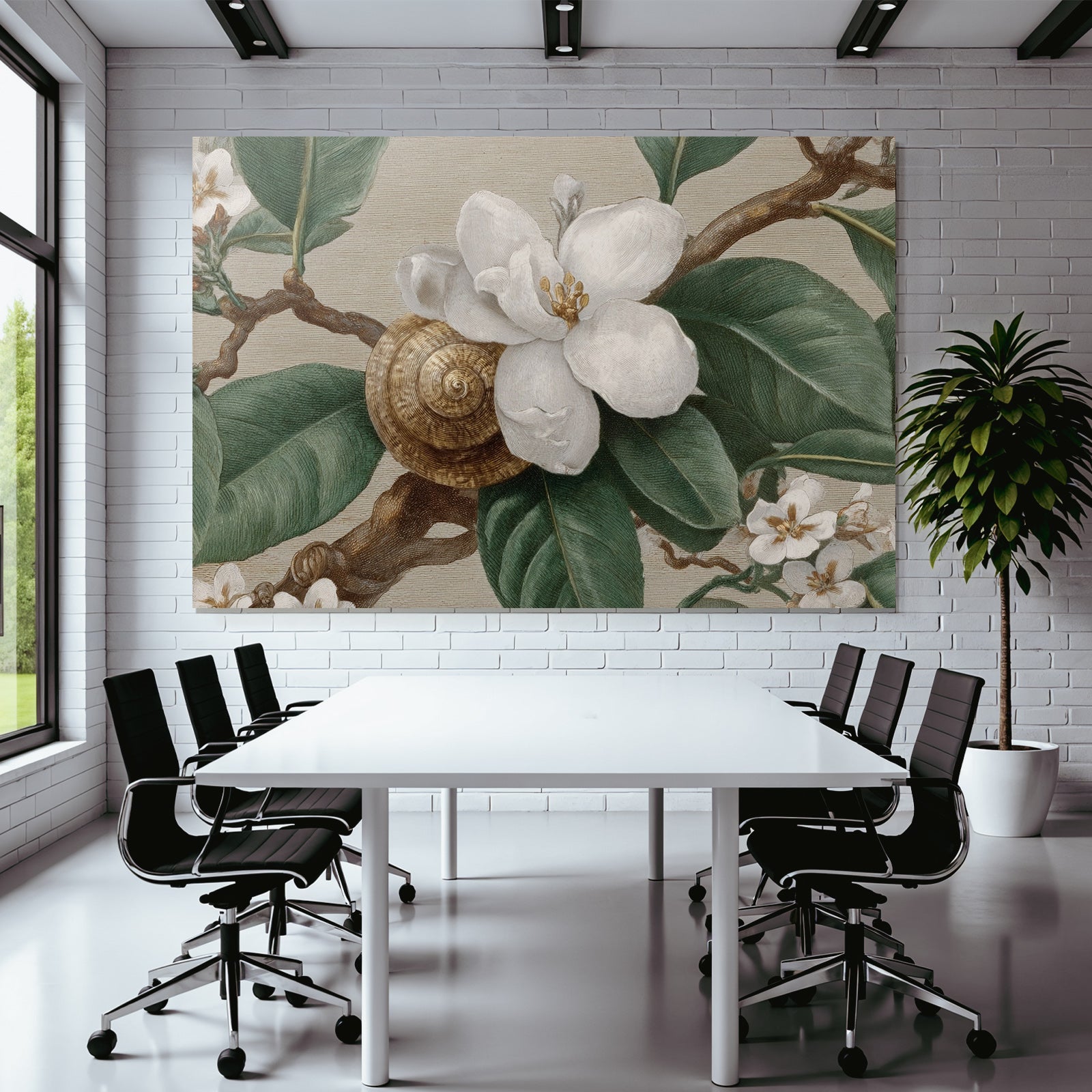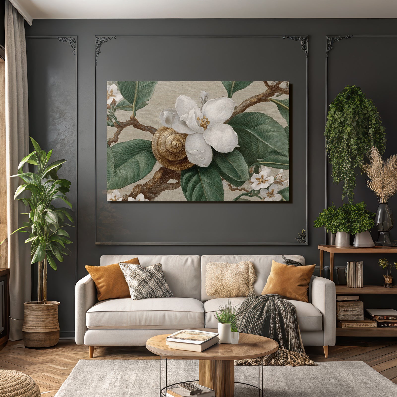 Die Kombination aus dem Motiv „Blühende Pflanze Mit Weissen Blüten Grünen Blättern Und Schneckenhaus“ und dem Stil Botanische Illustrationen schafft eine Brücke zwischen Klassik und Moderne. Der FameFrame vollendet dieses Zusammenspiel perfekt.