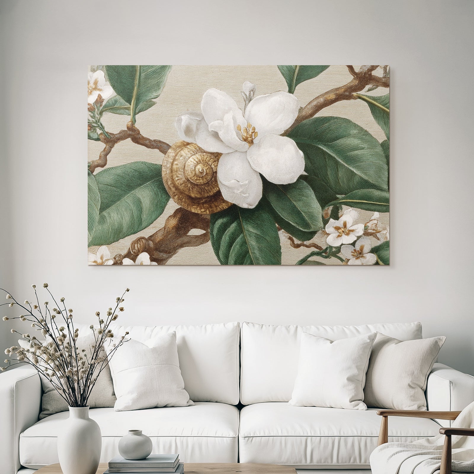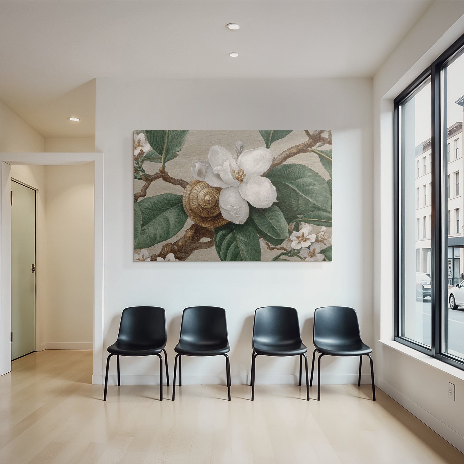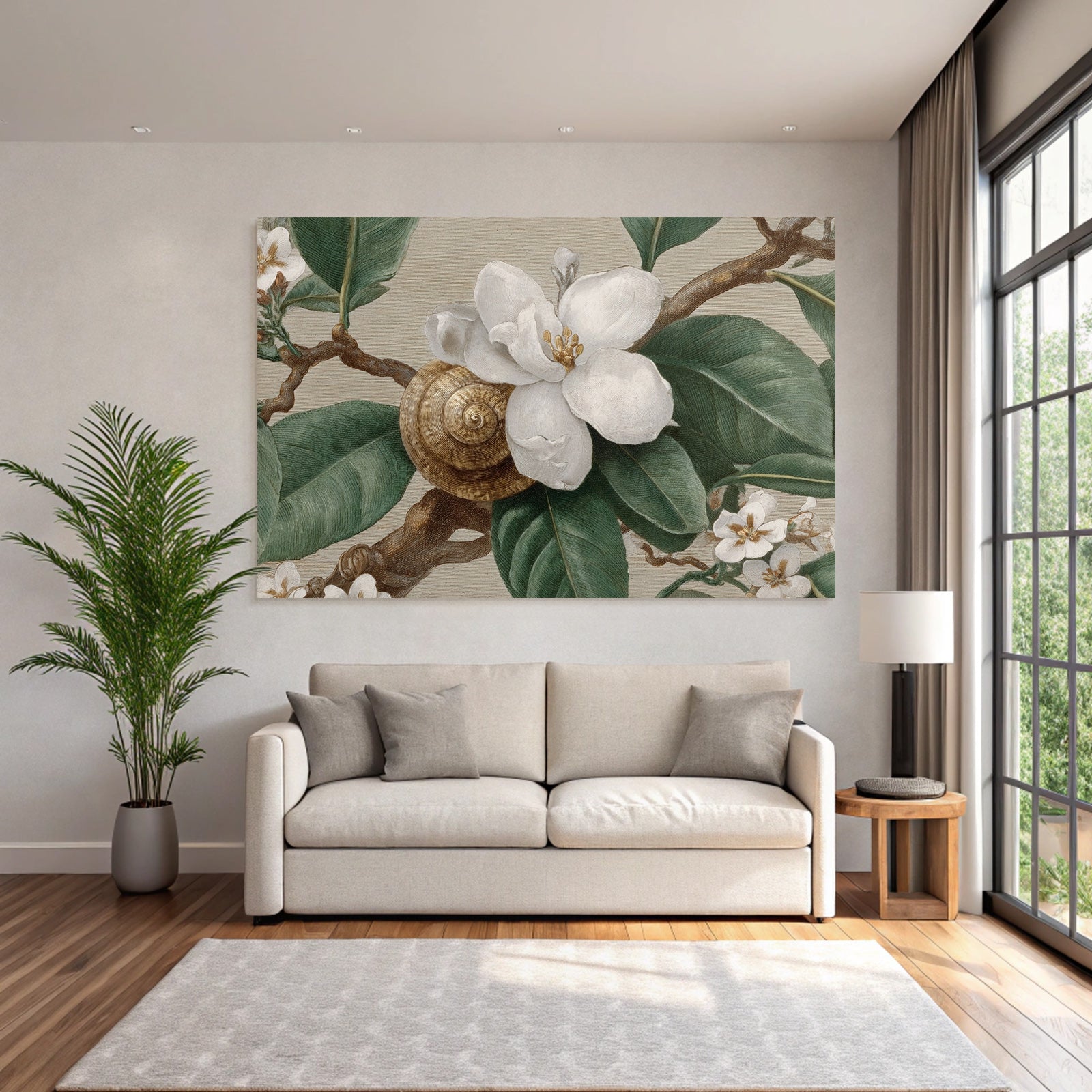Die Kombination aus dem Motiv „Blühende Pflanze Mit Weissen Blüten Grünen Blättern Und Schneckenhaus“ und dem Stil Botanische Illustrationen schafft eine Brücke zwischen Klassik und Moderne. Der FameFrame vollendet dieses Zusammenspiel perfekt.