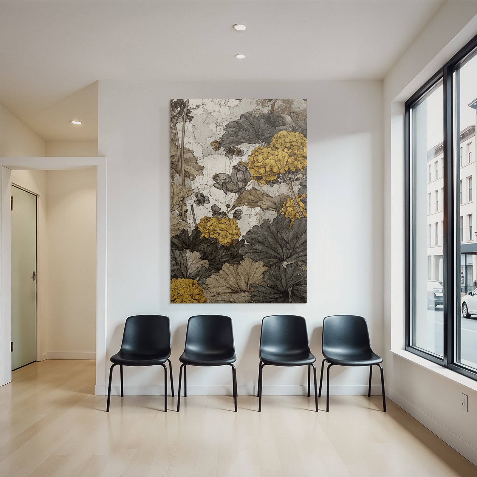 Perfekt für Ihr Wohnzimmer oder einen stilvollen Empfangsbereich: Das Werk „Botanische Illustration Mit Gelben Und Grünen Graün Blättern Auf Gealtertem Hintergrund“ im Stil Botanische Illustrationen wird im FameFrame zum Mittelpunkt des Raumes.