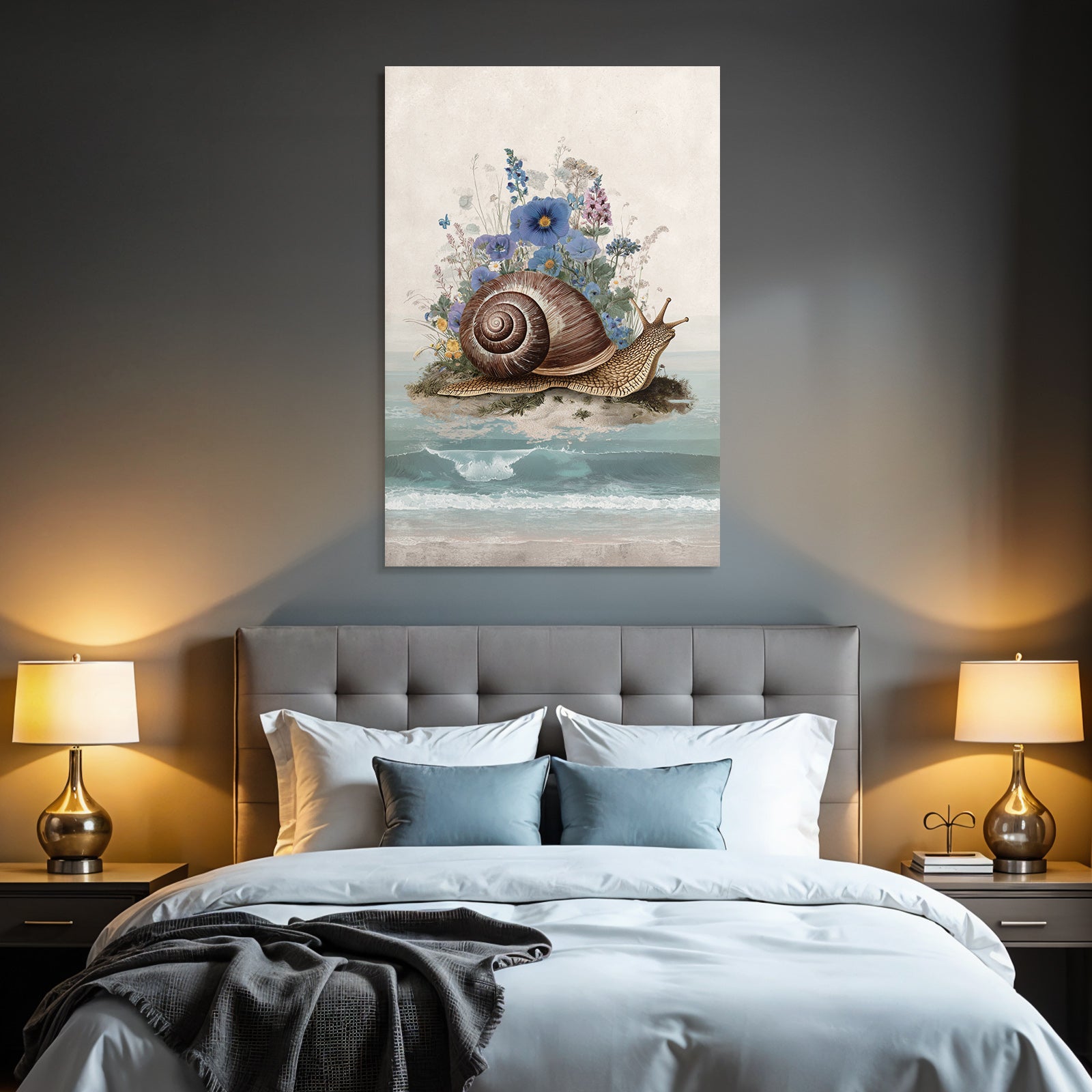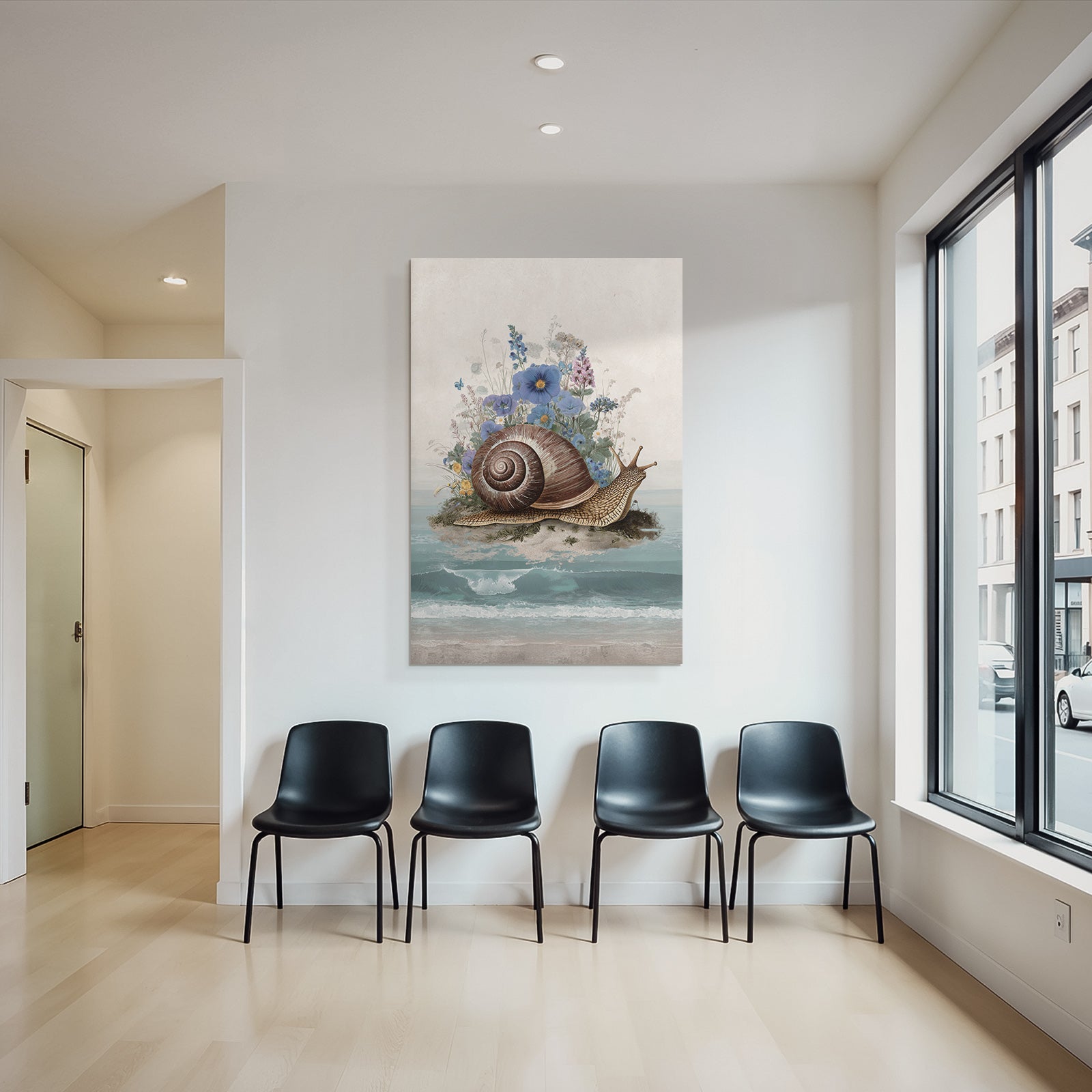 Setze stilvolle Akzente mit Kunst im Look von Botanische Illustrationen. Das Werk „Grosse Schnecke Am Strand Umgeben Von Bunten Und Wellen Im Hintergrund“ entfaltet im edlen FameFrame seine volle Wirkung.