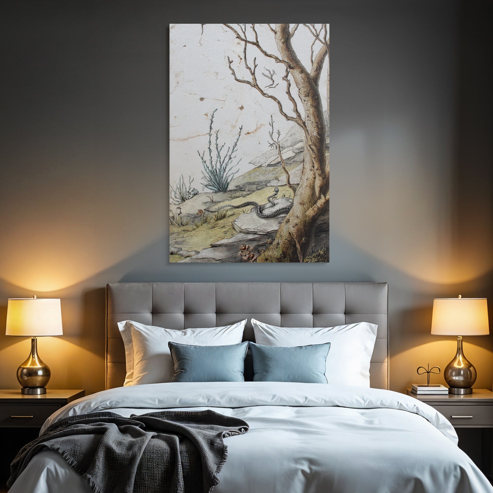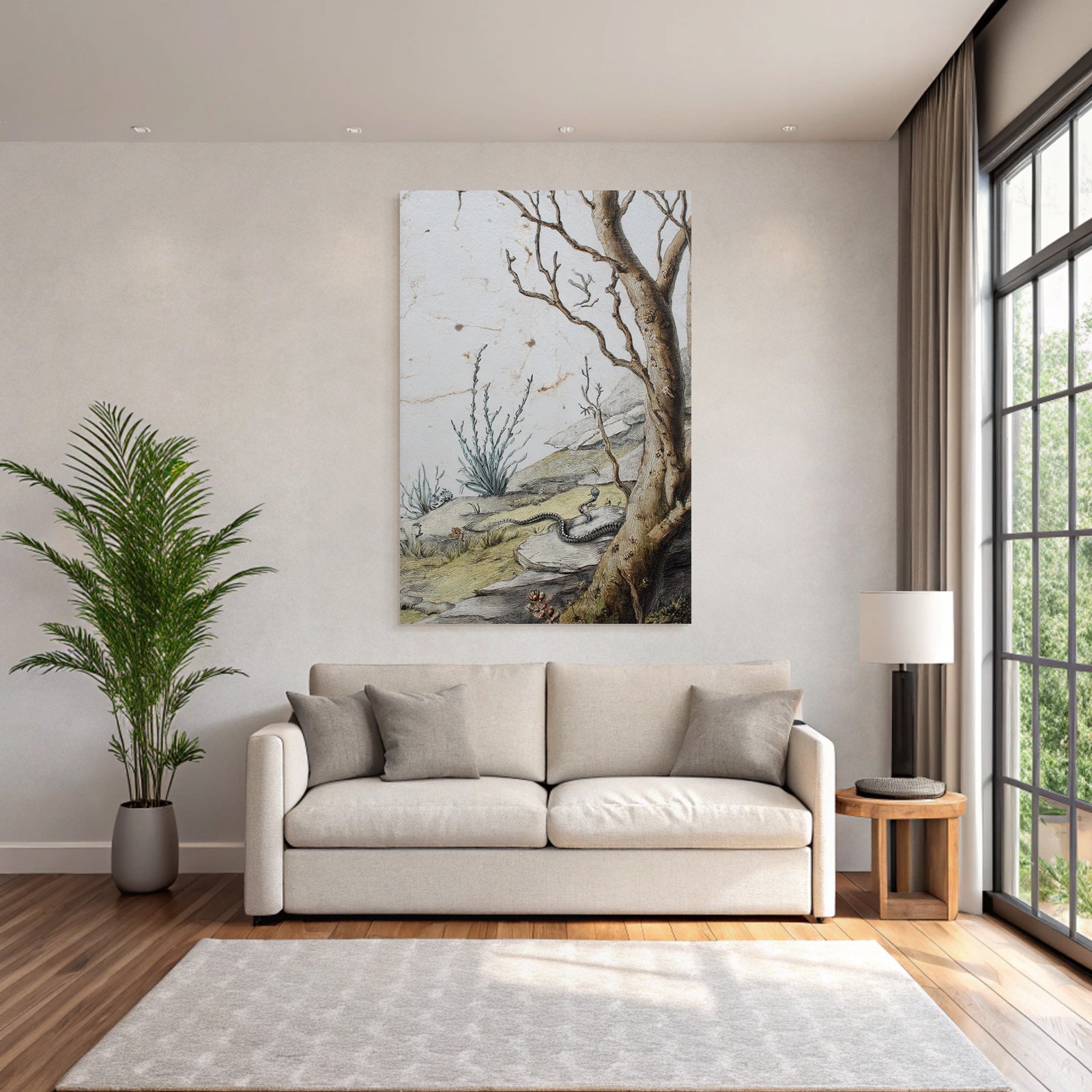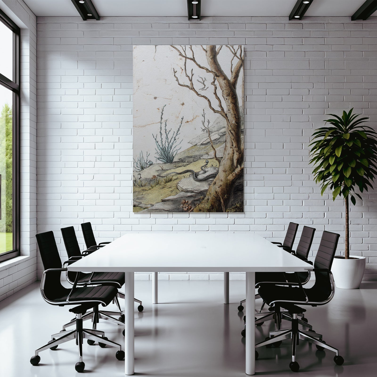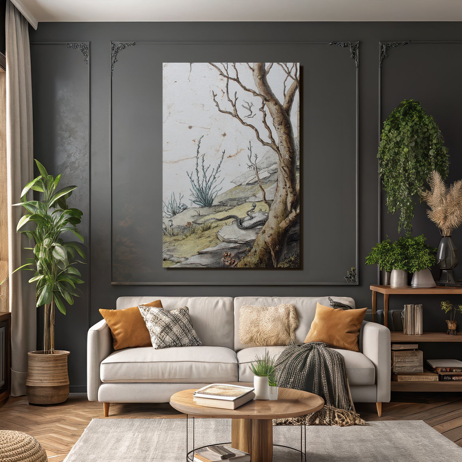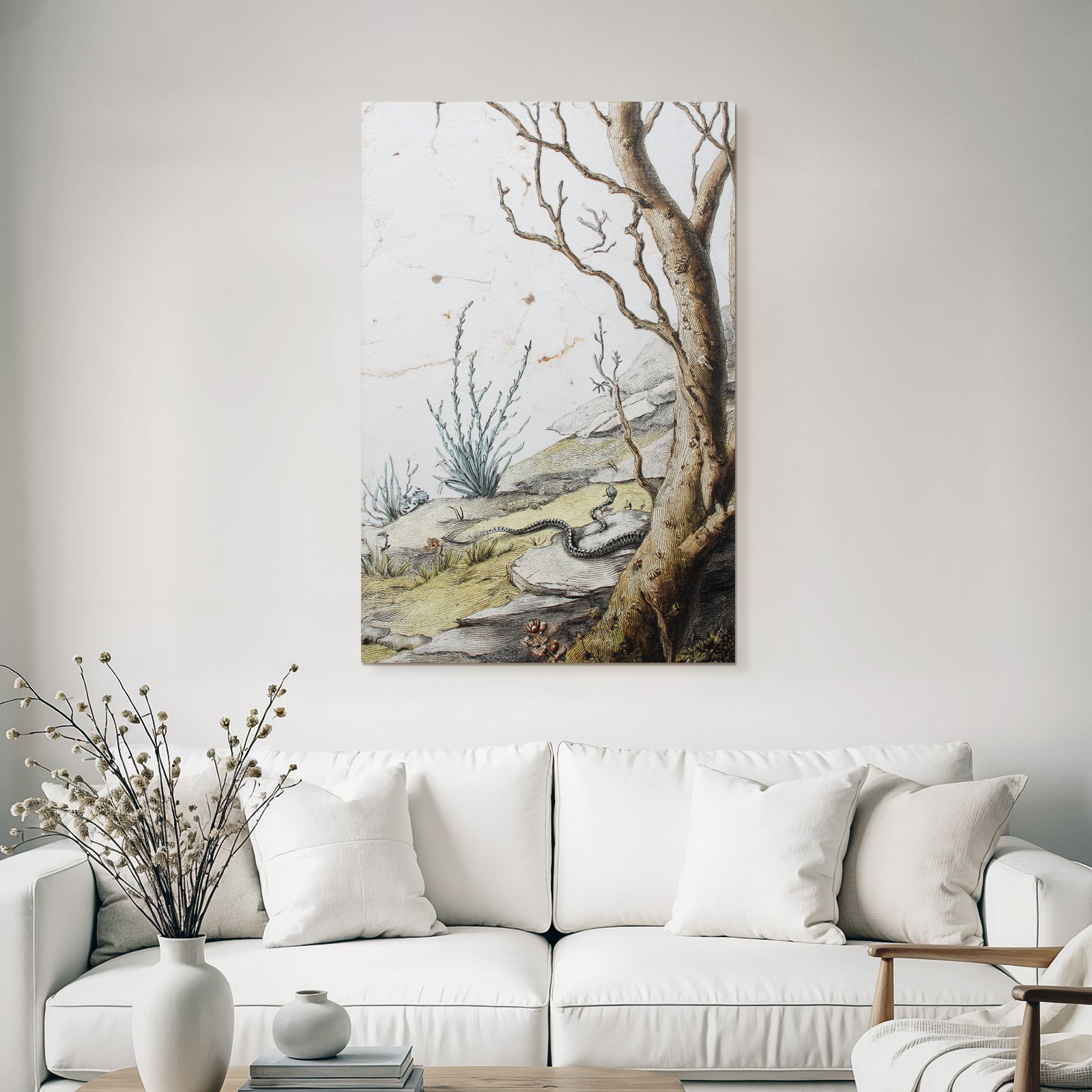 Einladend und professionell: Das Kunstwerk „Schlangendarstellung Im Wald“ im Stil Botanische Illustrationen verleiht Ihrer Praxis oder Ihrem Wartezimmer im FameFrame eine exklusive Note.