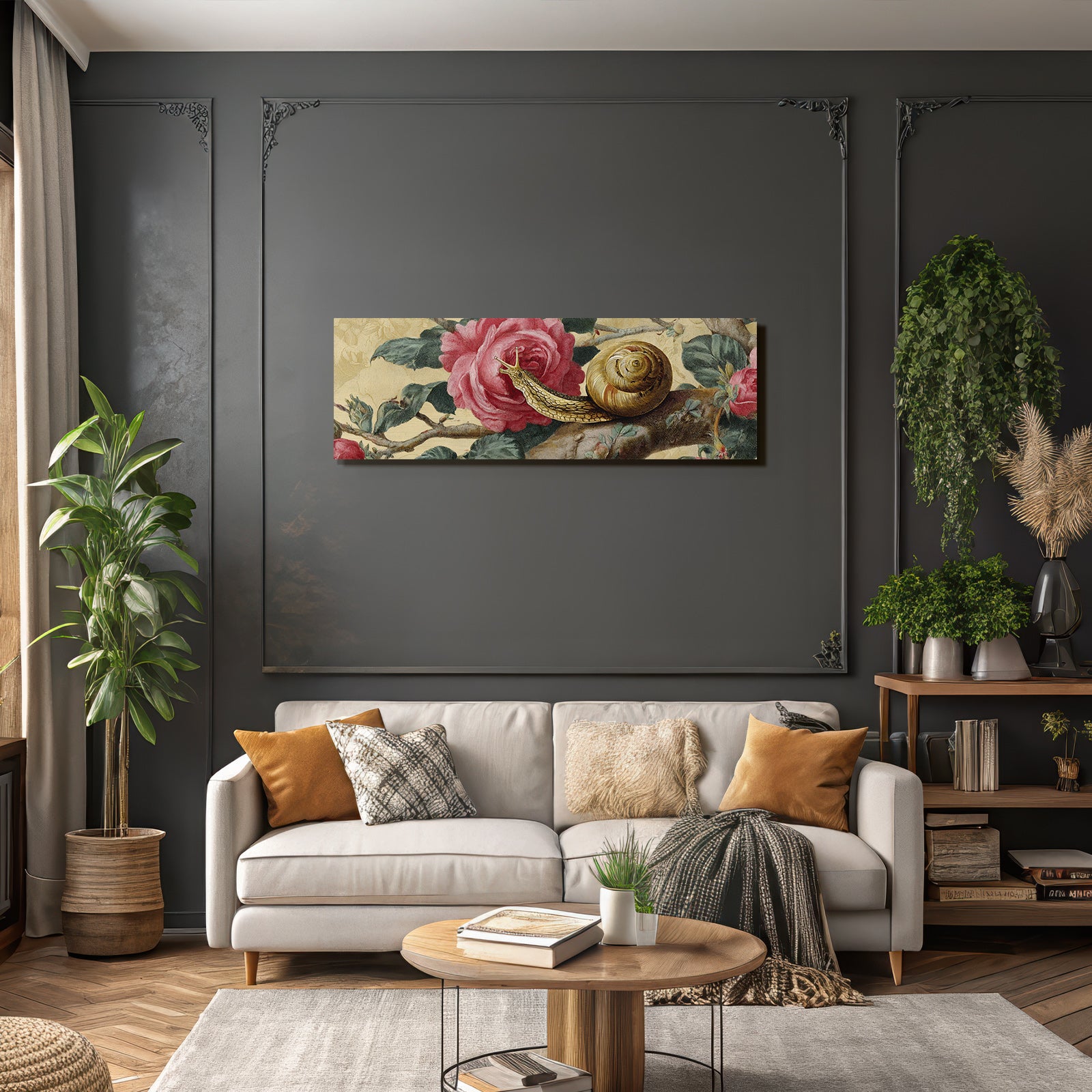Ein Highlight für jeden Besprechungsraum oder eine großzügige Lobby. Das Werk „Schnecke Und Rosen Mit Grünen Pflanzen“ im Stil Botanische Illustrationen demonstriert im FameFrame Stilbewusstsein und Klasse.