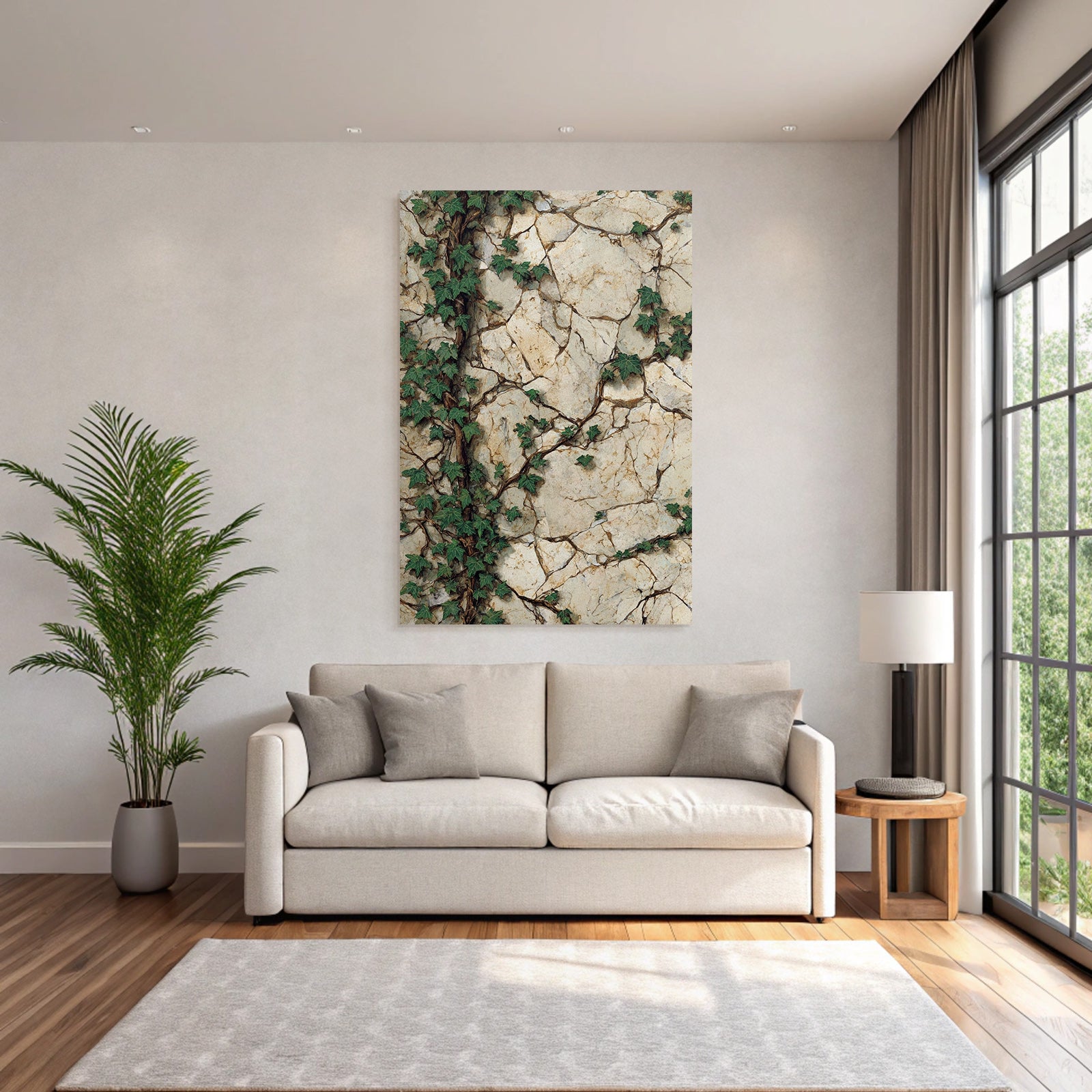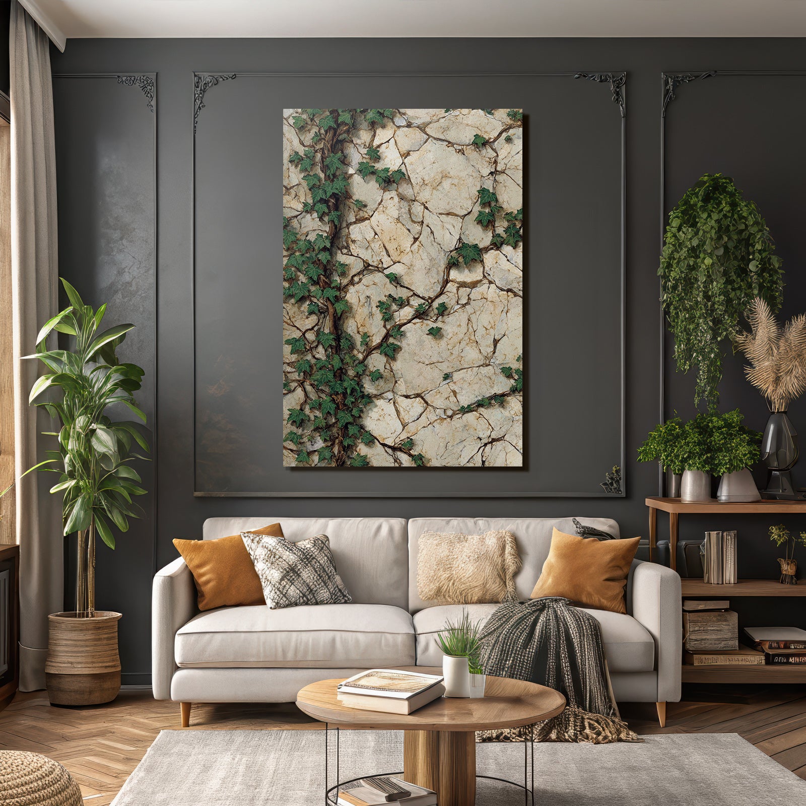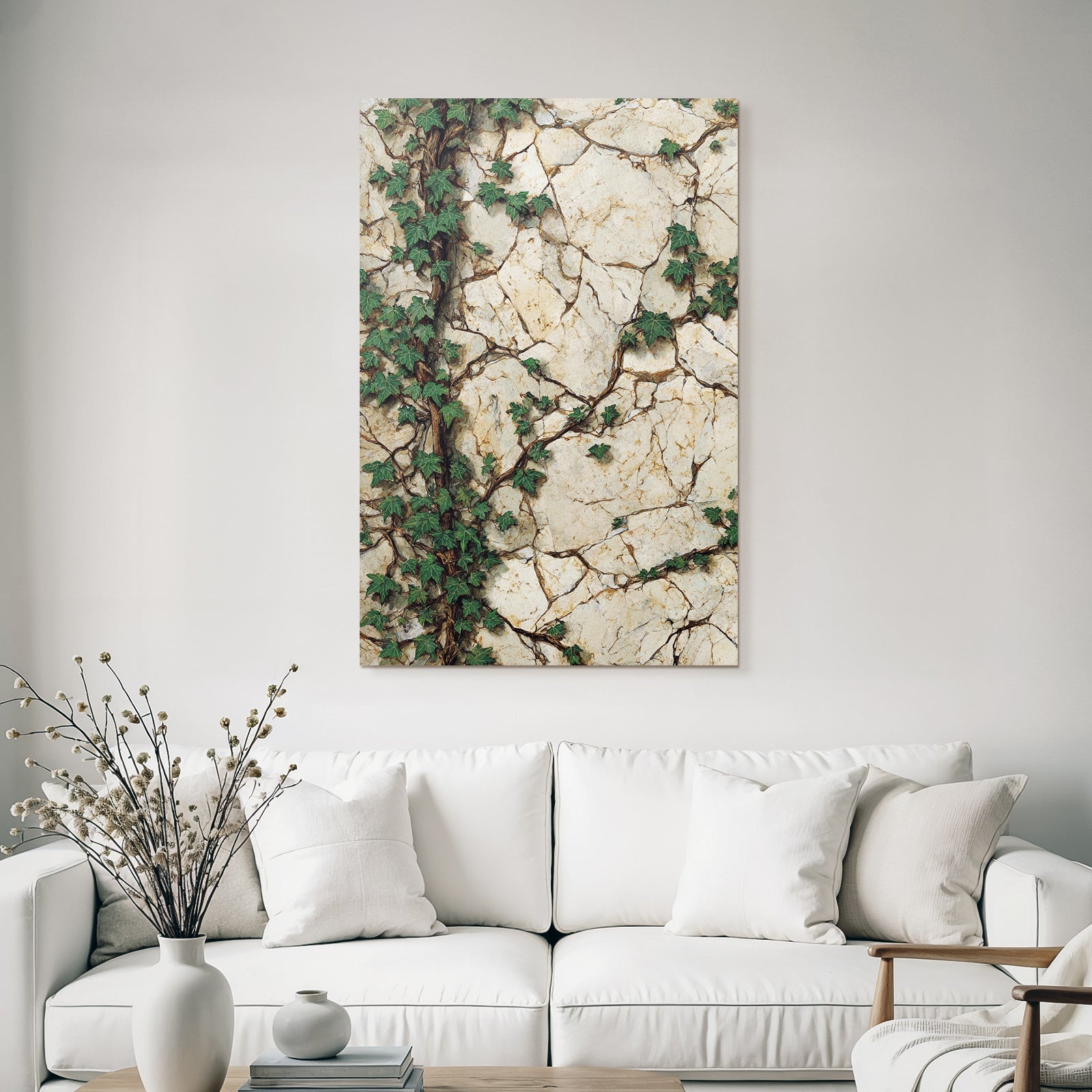 „Steinmaür Mit Rissen Und Efeu“ im Stil Botanische Illustrationen sorgt für stilvolle Ruhe im Schlafzimmer oder inspirierende Energie im Büro – perfekt im FameFrame inszeniert.