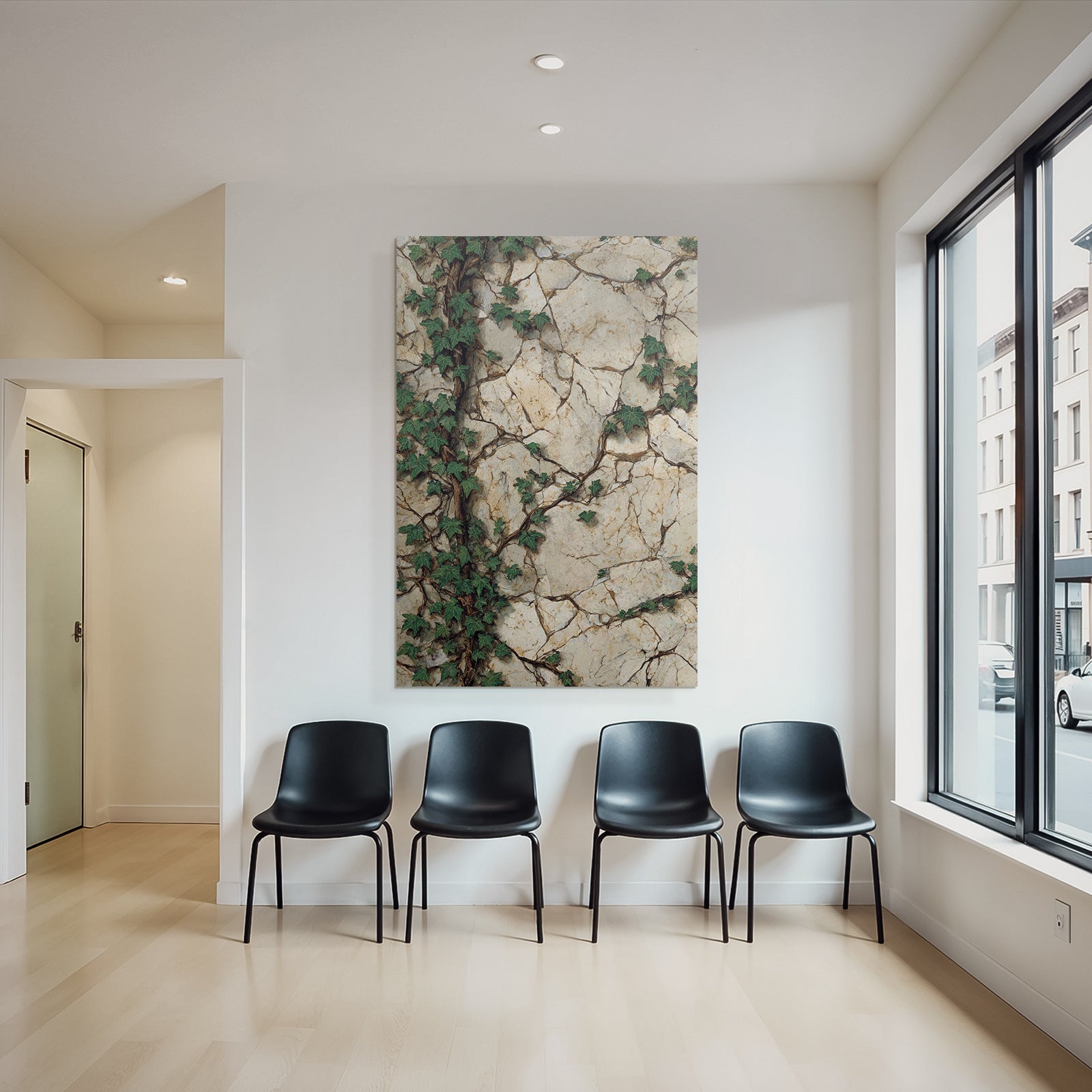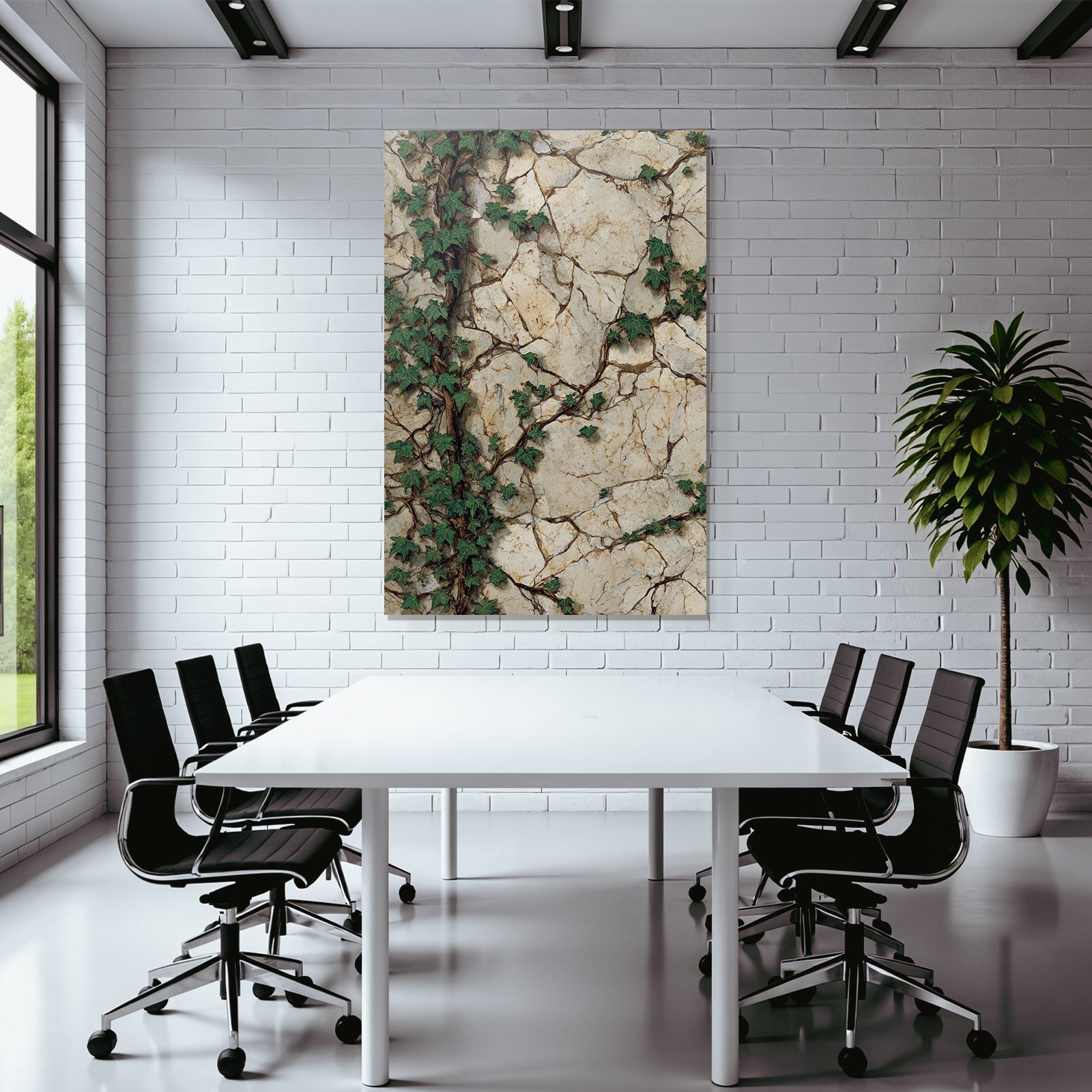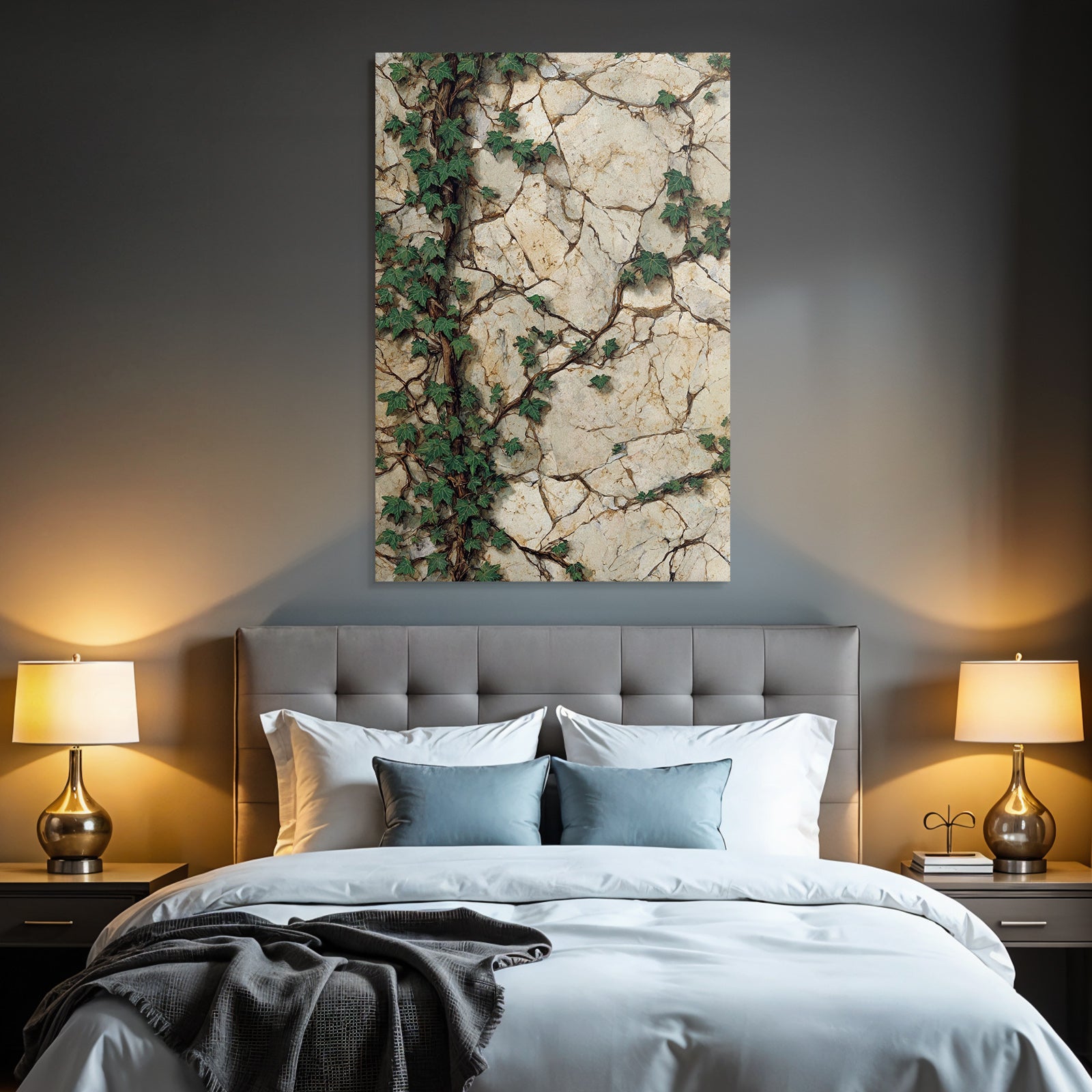 „Steinmaür Mit Rissen Und Efeu“ im Stil Botanische Illustrationen sorgt für stilvolle Ruhe im Schlafzimmer oder inspirierende Energie im Büro – perfekt im FameFrame inszeniert.