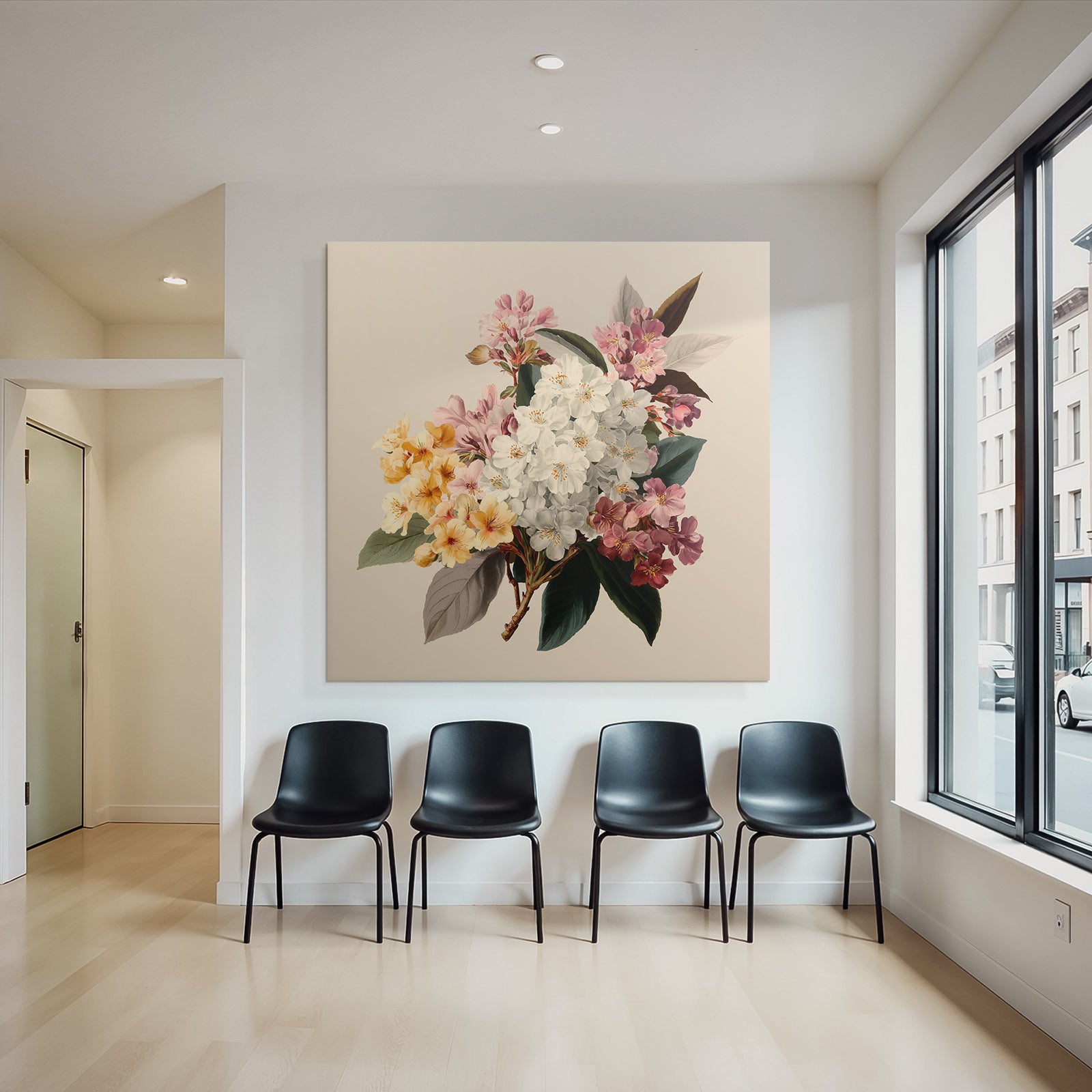 „Strauss Mit Bunten Blüten Und Grünen Blättern“ ist das Highlight für jede Wand. Als brillanter Textildruck im Stil Botanische Illustrationen wird es im FameFrame zu einem dynamischen und wandelbaren Kunstobjekt.