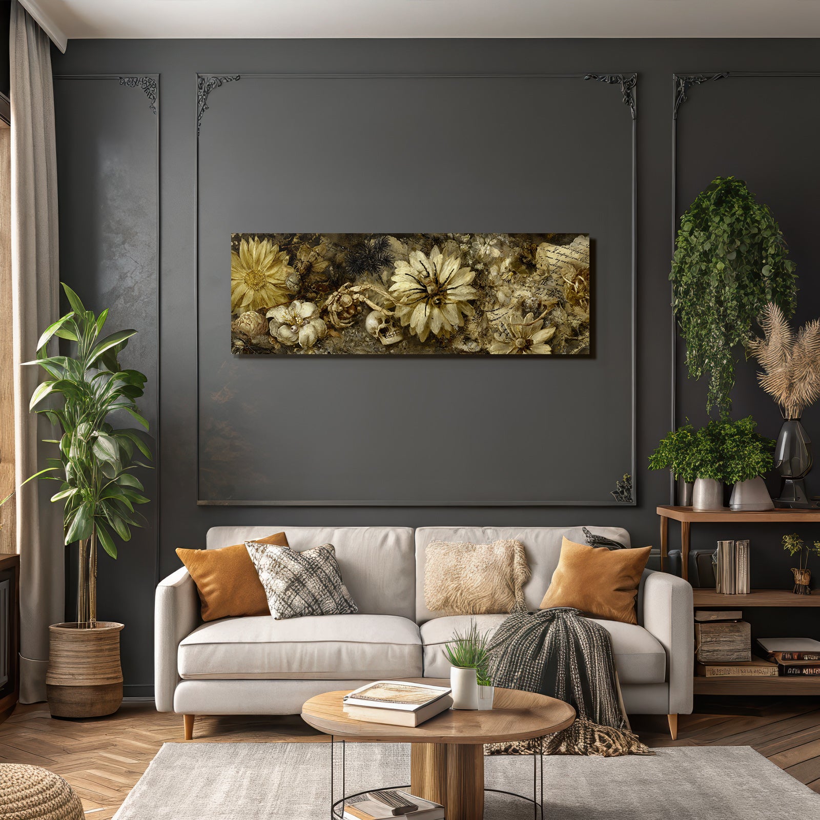 Verleihe Lobby, Wartezimmer oder Studio eine besondere Atmosphäre mit „„Blumen Insekten Schaedel Stillleben Vanitas Kunst““ im Stil Collagen – eindrucksvoll im FameFrame präsentiert.