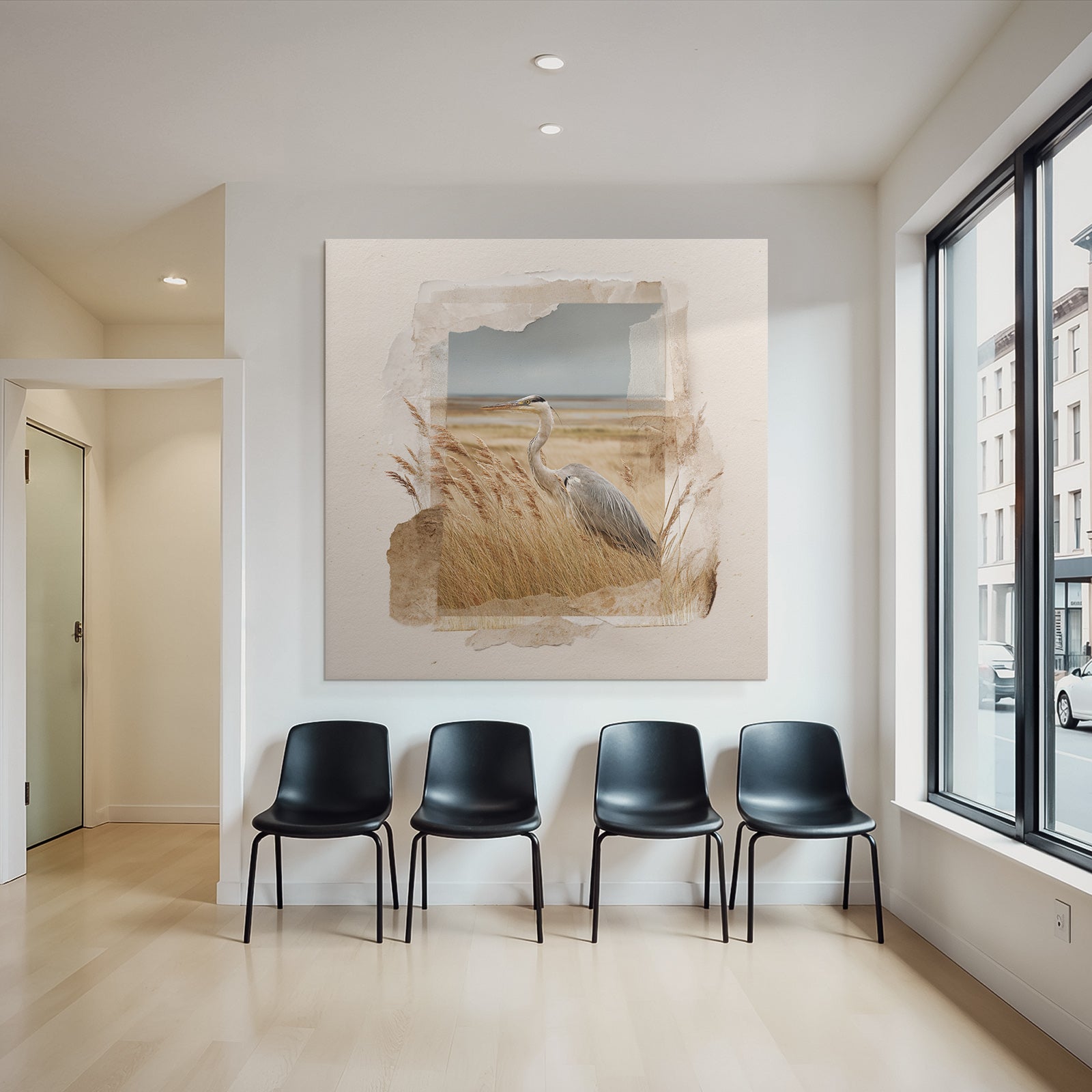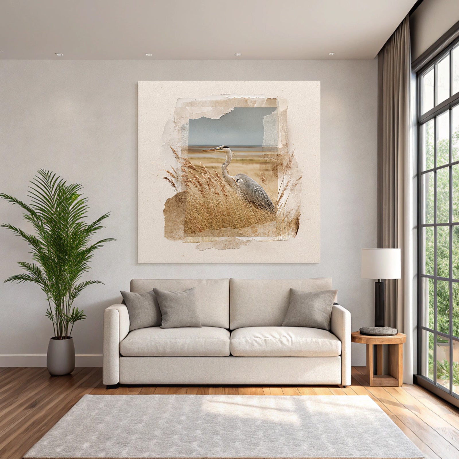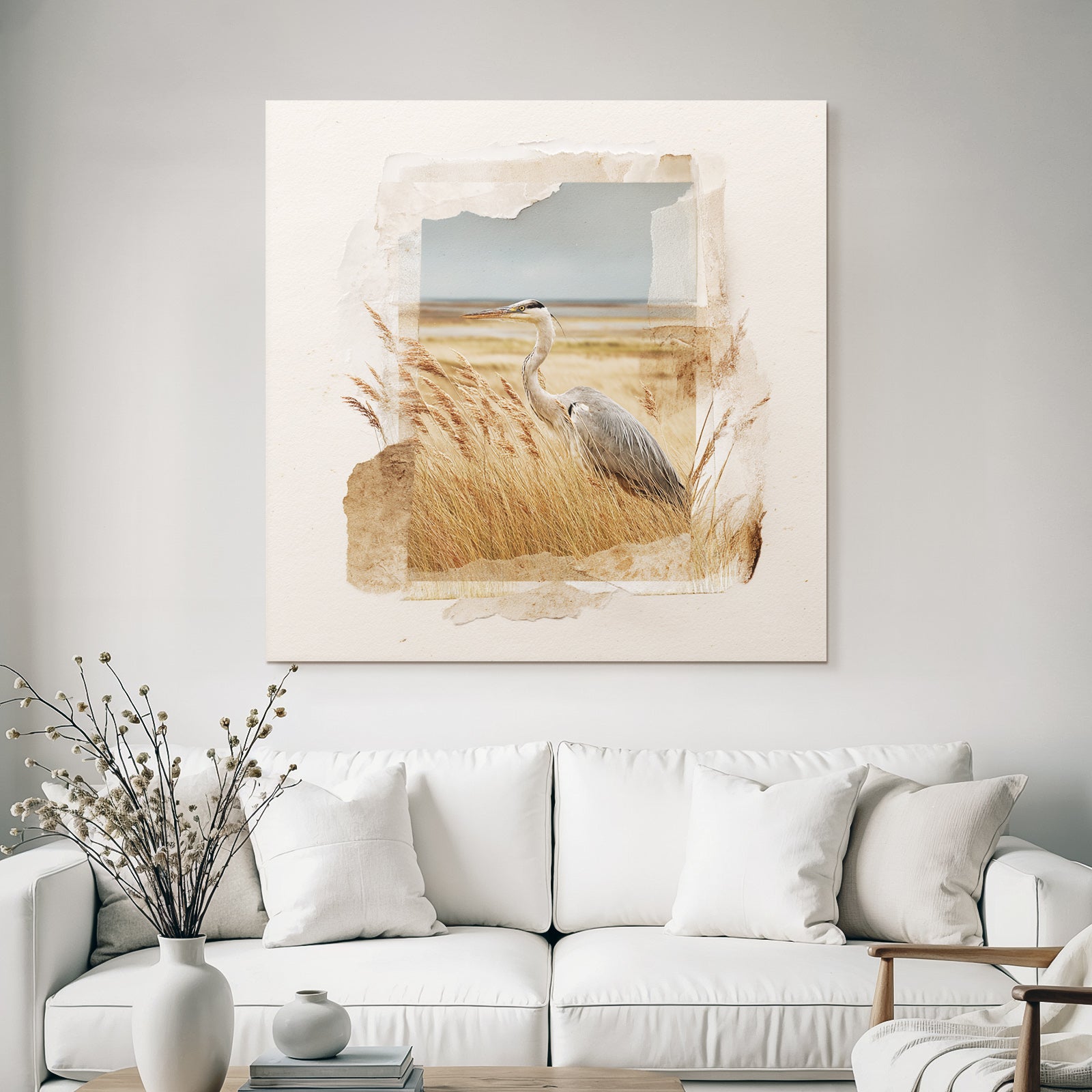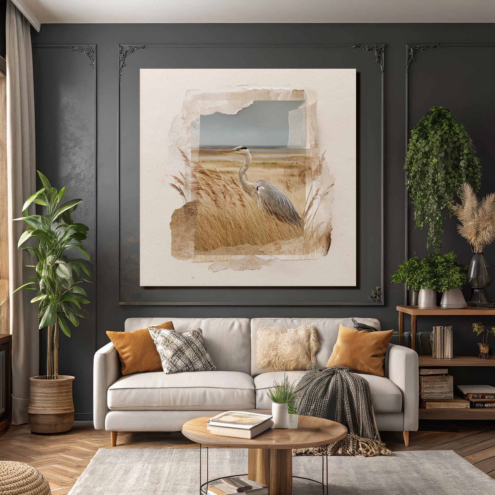 Setz ein Statement: „„Heron In Grass Naturlandschaft Kunst Stil““ im Stil Collagen wird im FameFrame zum echten Kunstobjekt an Deiner Wand.