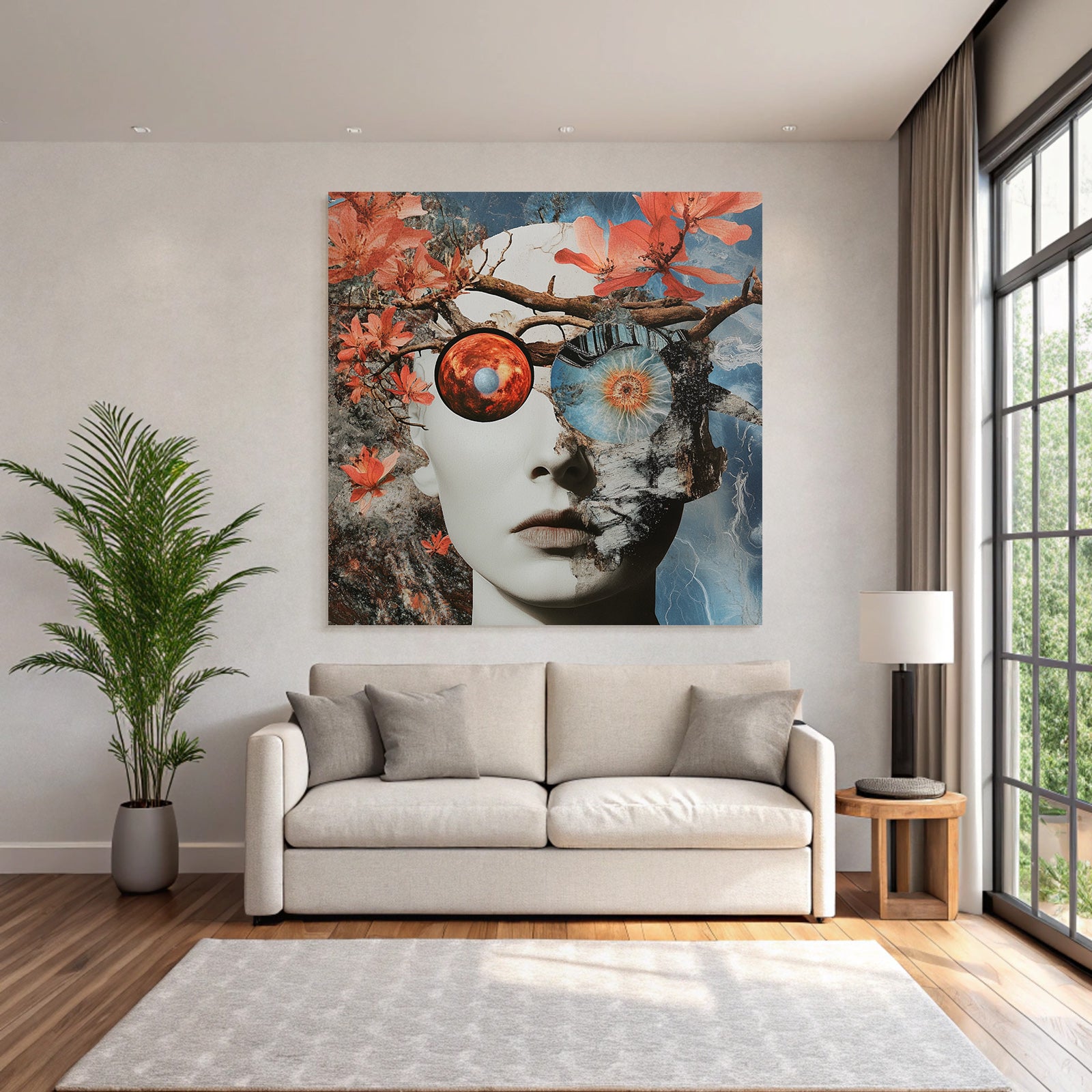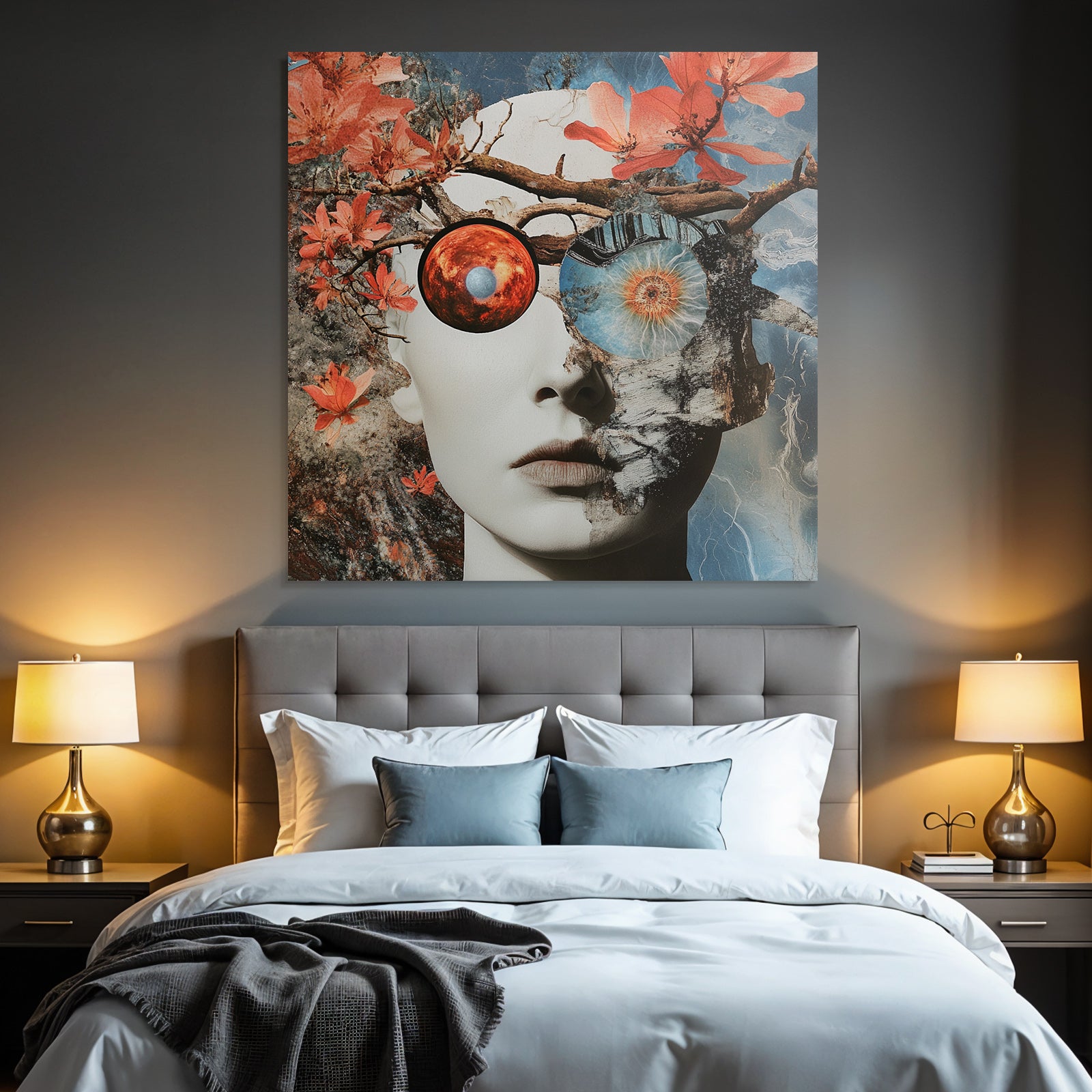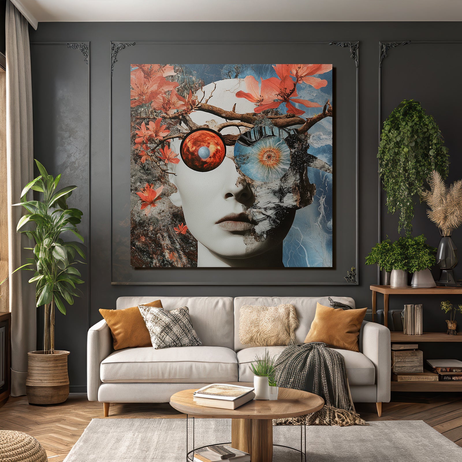 „„Menschliches Gesicht Natur Kosmos Transformation Dualitaet““ verbindet das Beste aus Collagen mit modernem Textildruck – edel präsentiert im hochwertigen FameFrame.