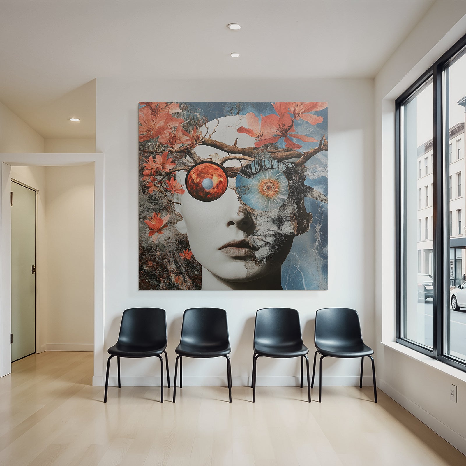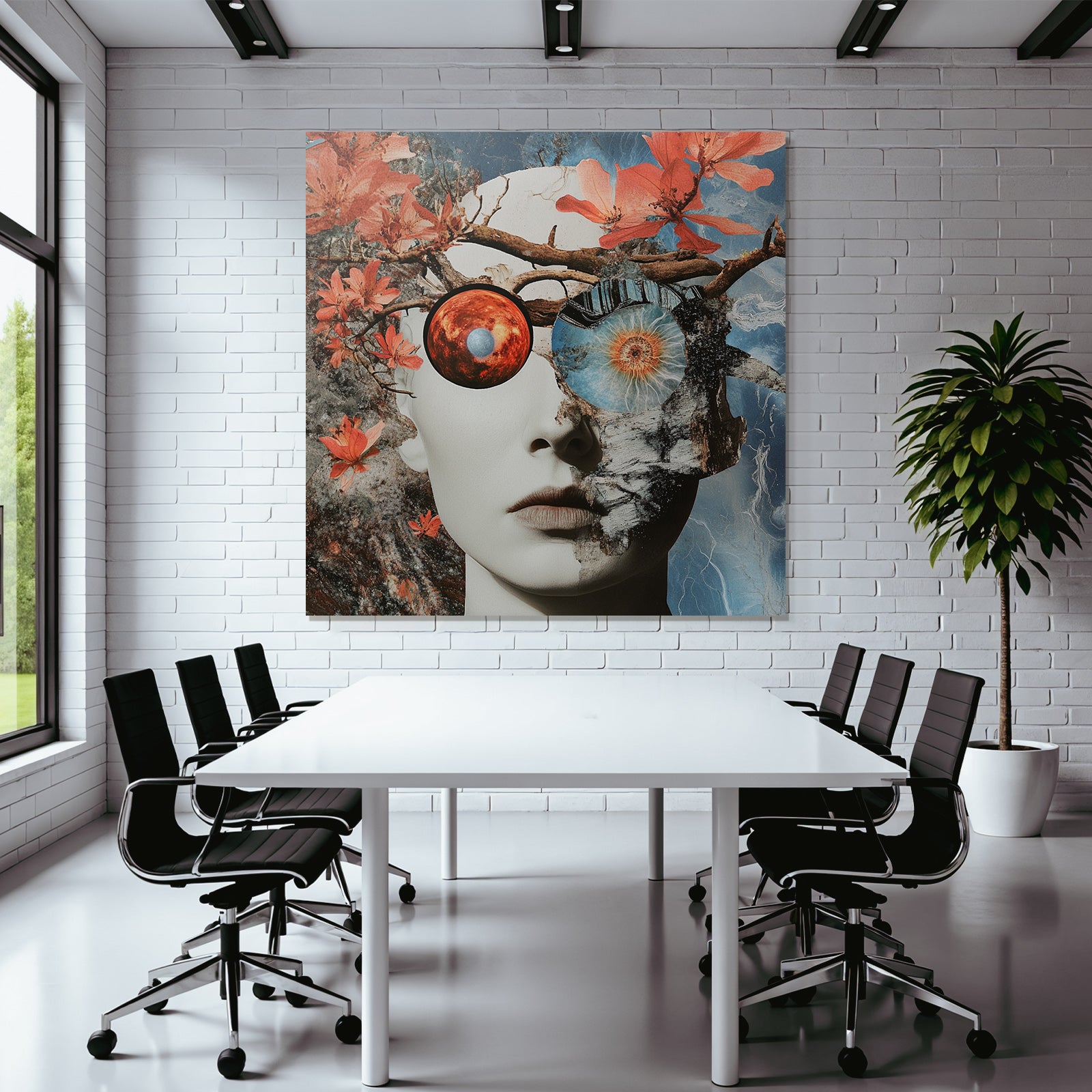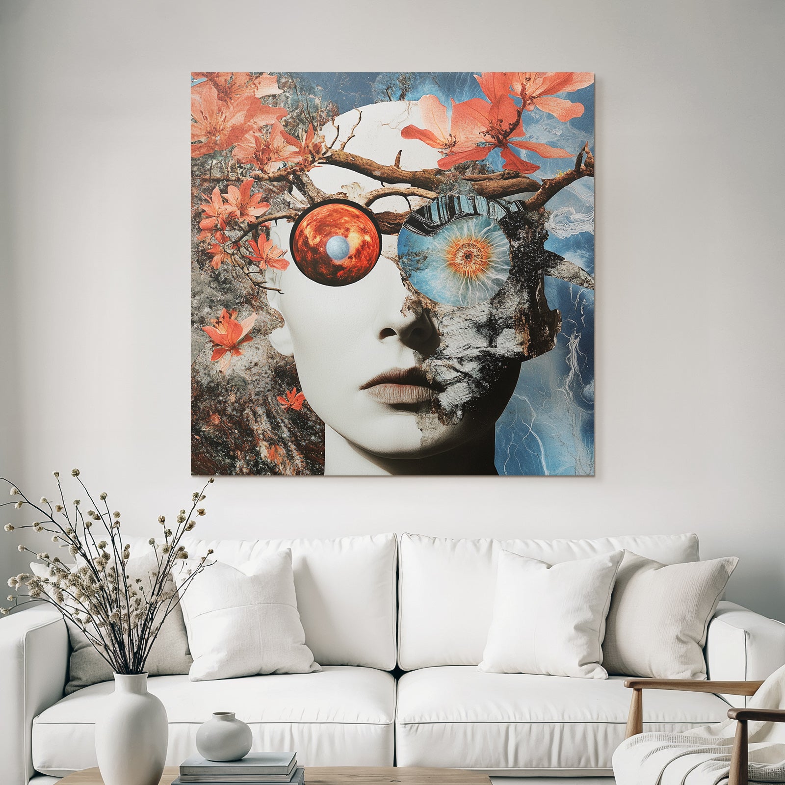 „„Menschliches Gesicht Natur Kosmos Transformation Dualitaet““ verbindet das Beste aus Collagen mit modernem Textildruck – edel präsentiert im hochwertigen FameFrame.