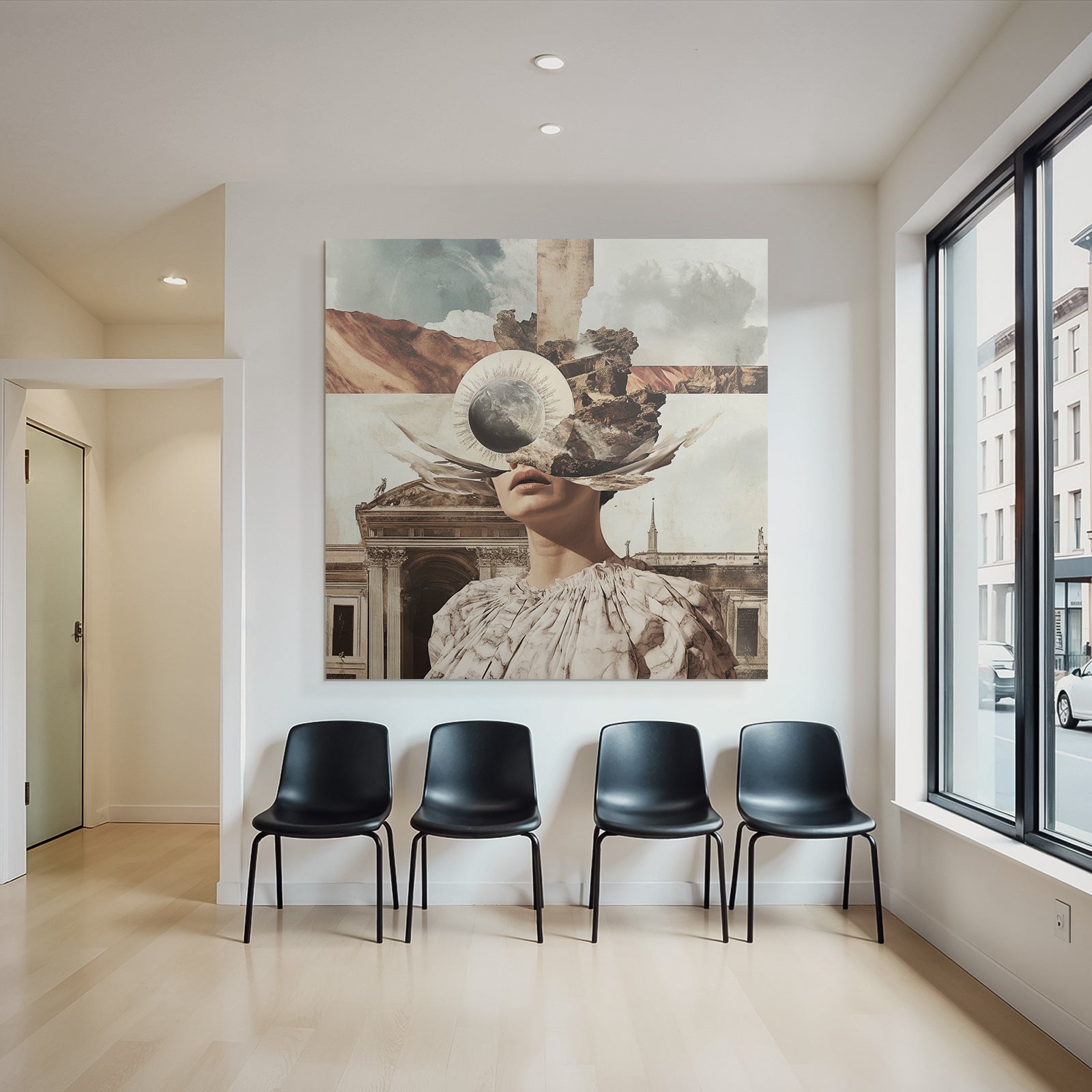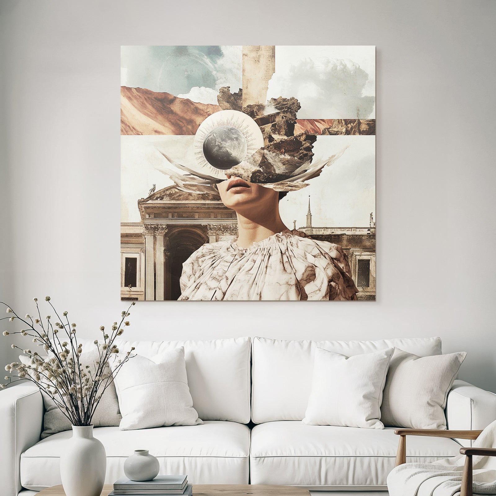 Ein einzigartiges Kunstwerk der Produktlinie FameFrame mit dem Titel „„Traumhafte Collage Imagination Natur Und Architektur““, im Stil Collagen.