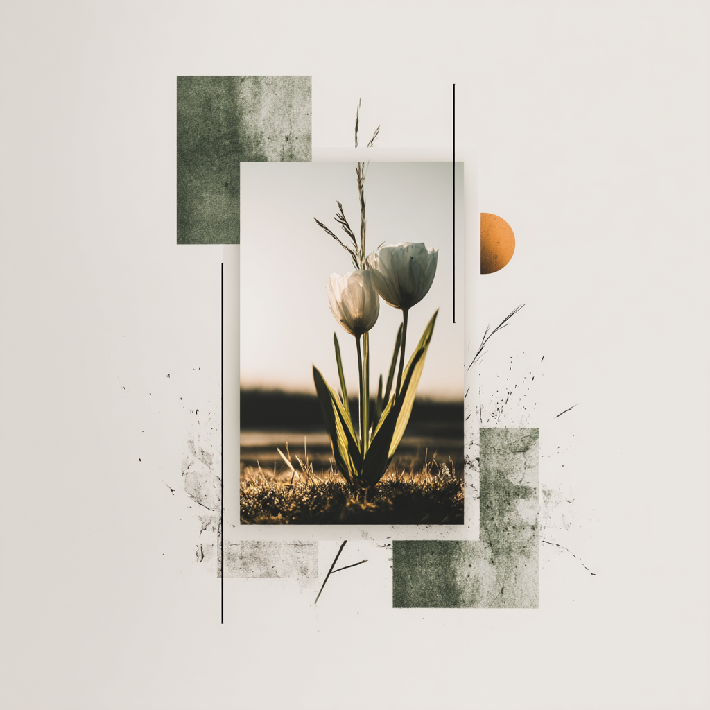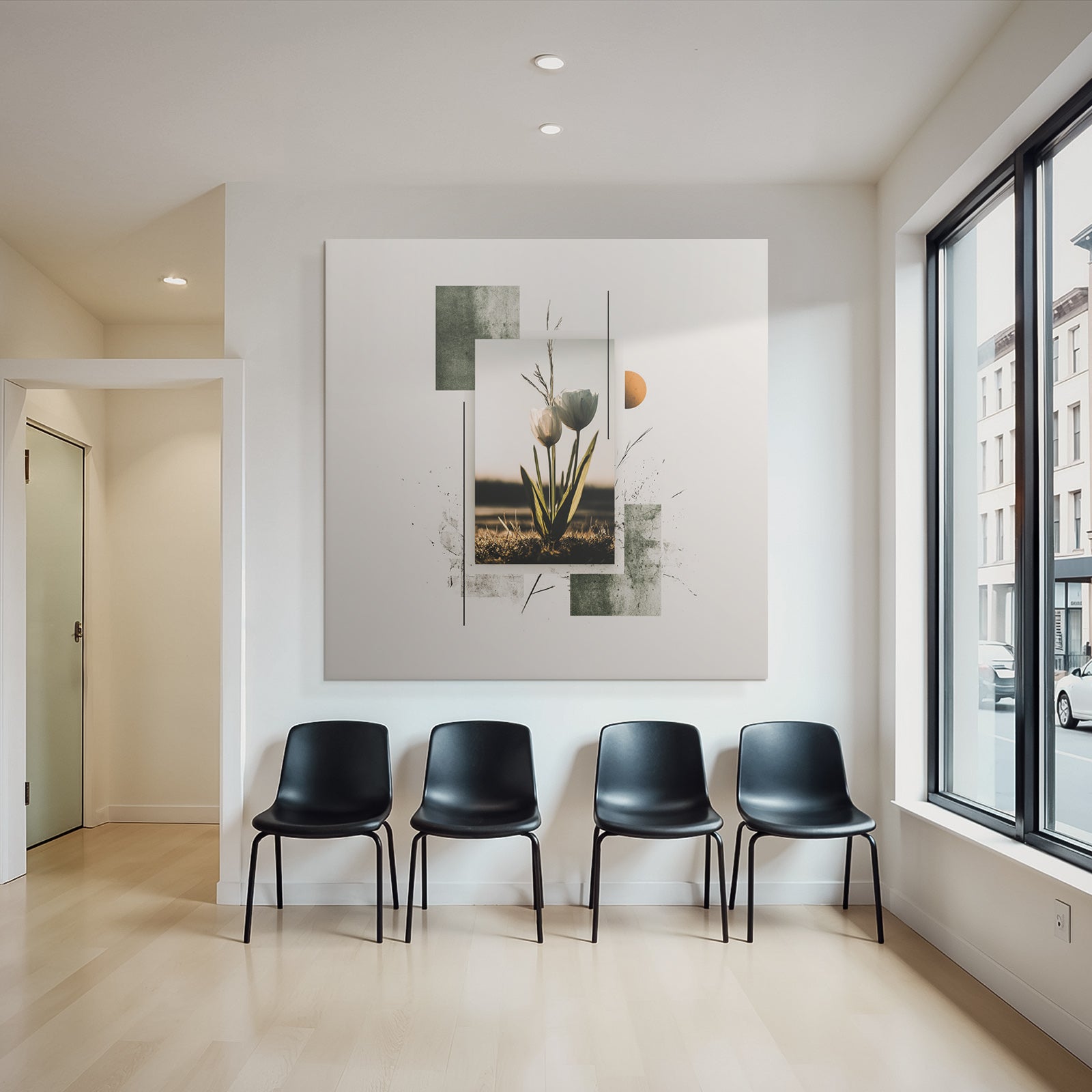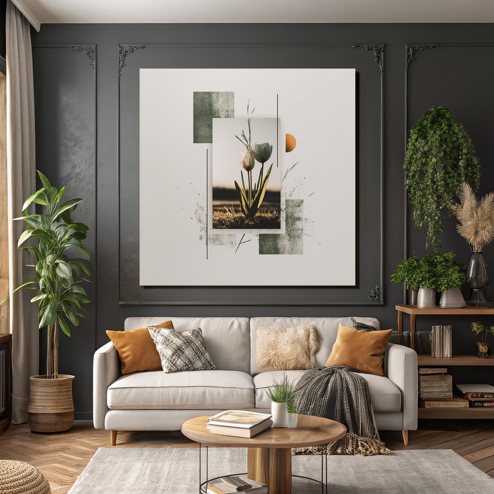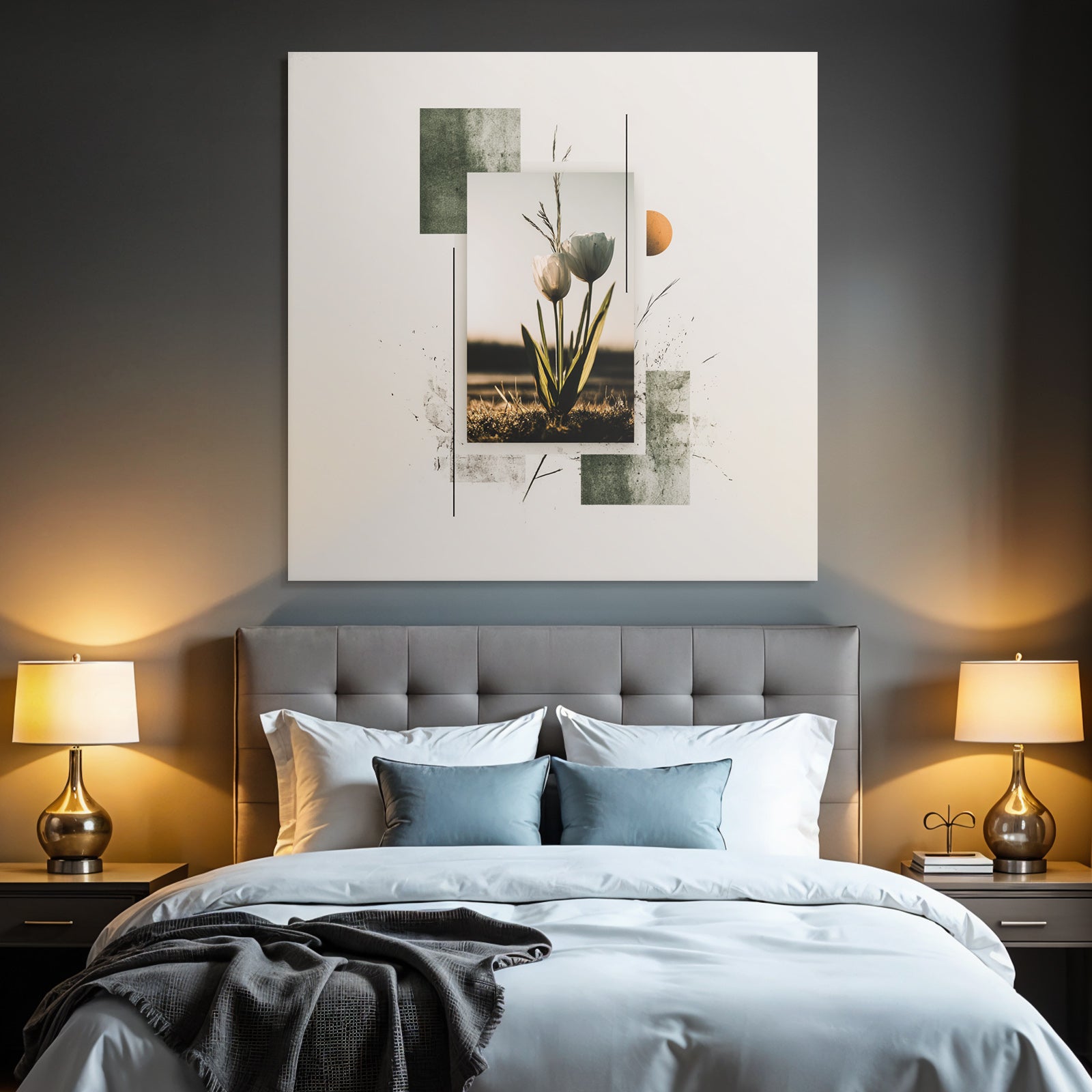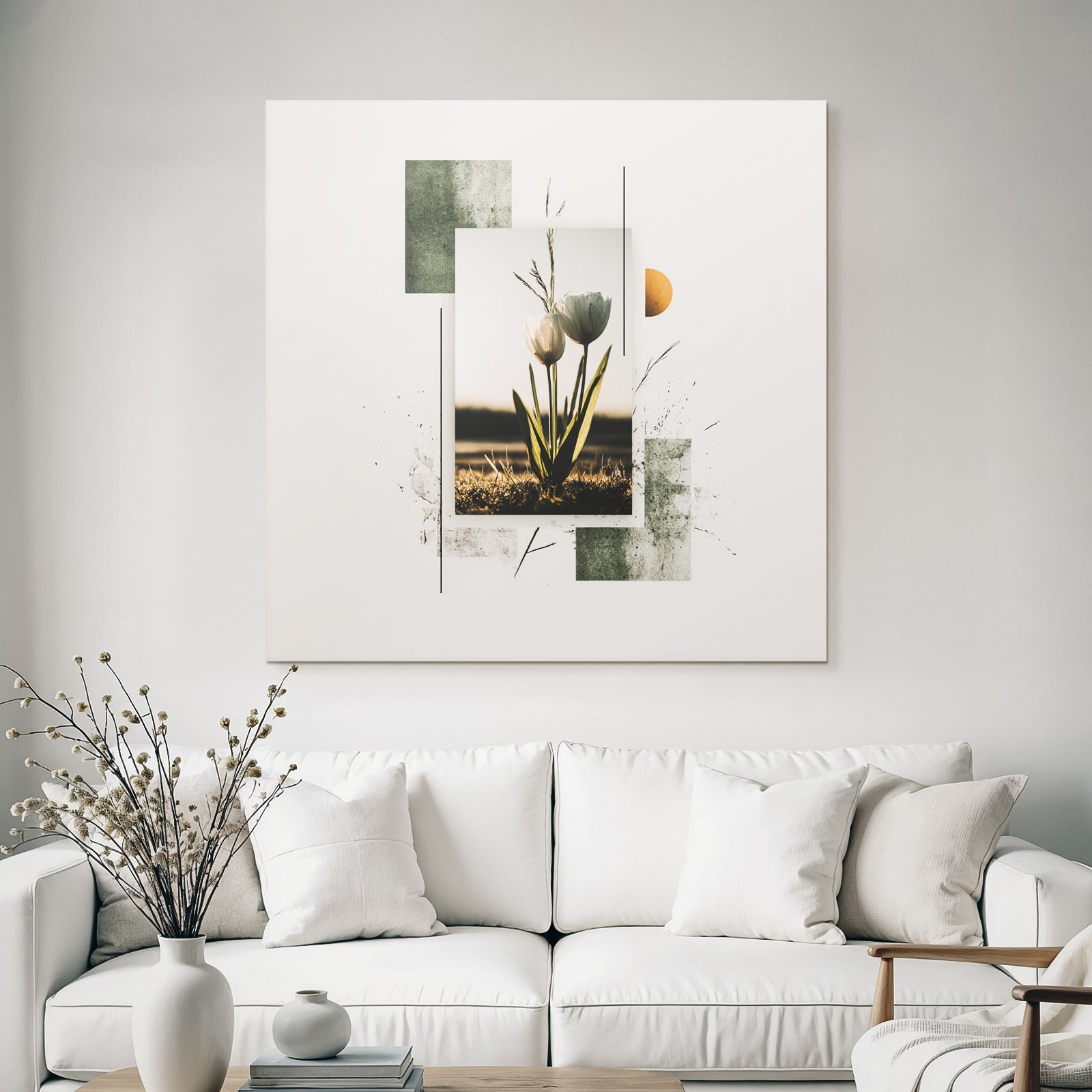 Mit Collagen-Elementen und klarer Wirkung verleiht „„Weisse Tulpen Geometrische Kunst Collage““ Deinem Raum Persönlichkeit – eingerahmt im exklusiven FameFrame.