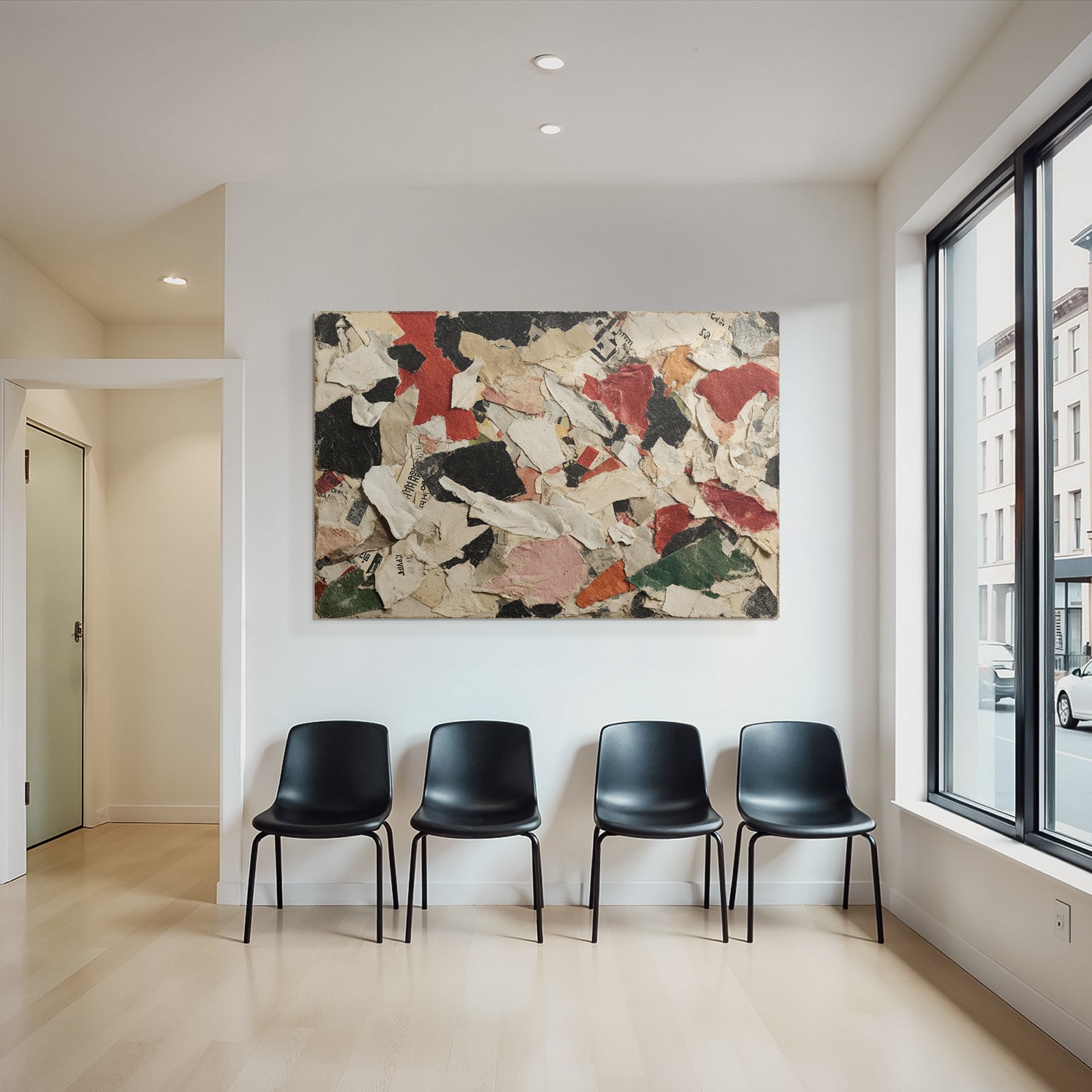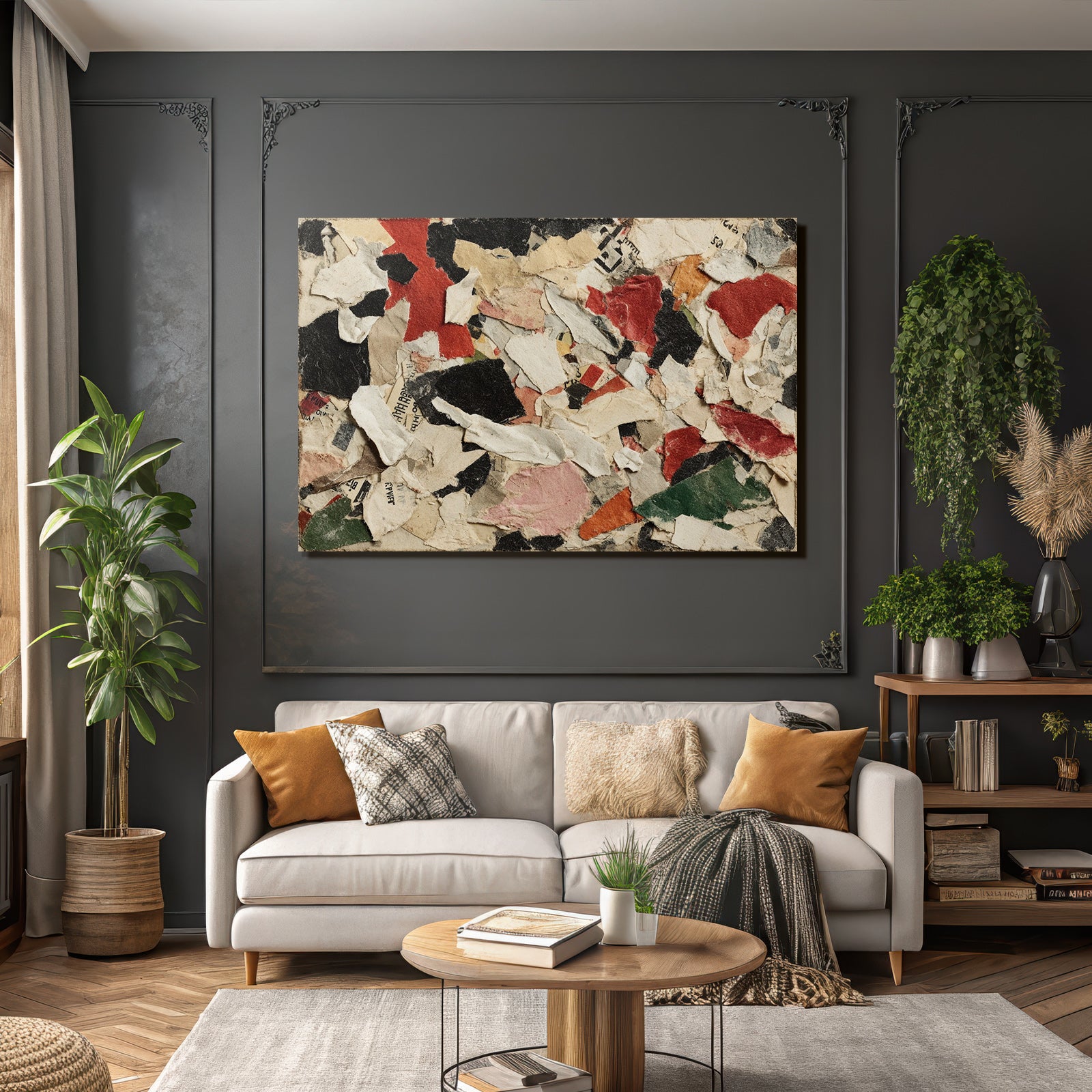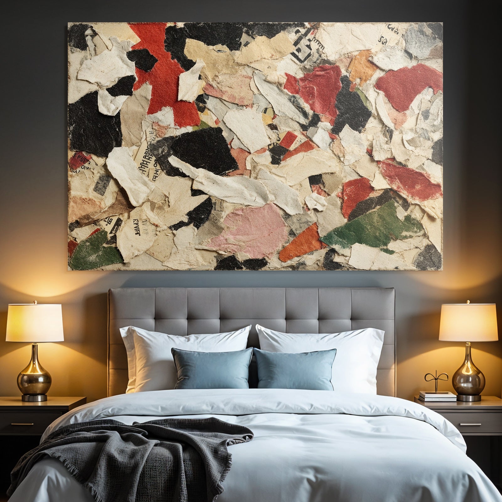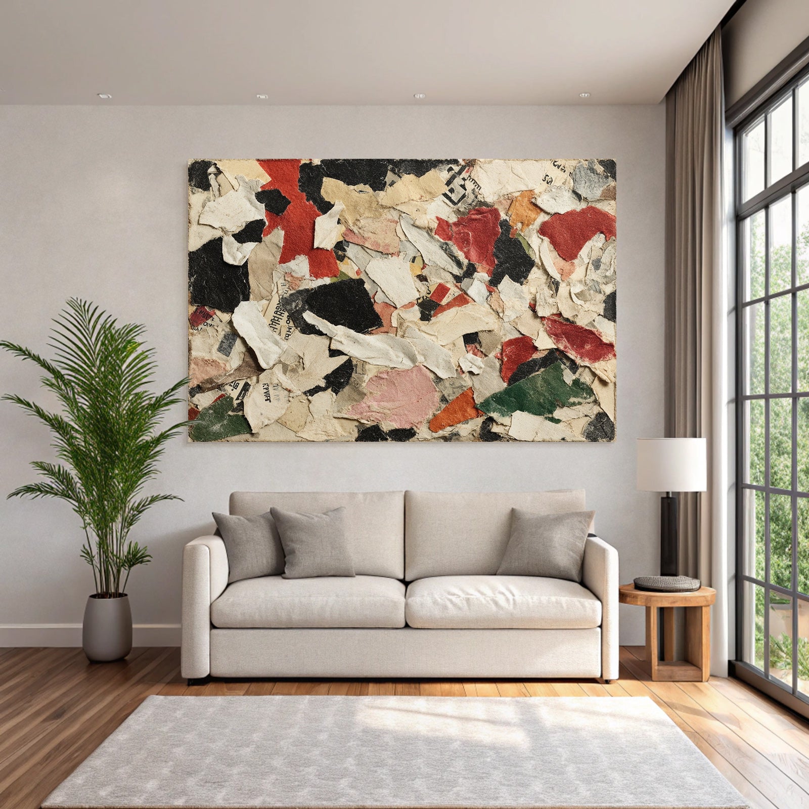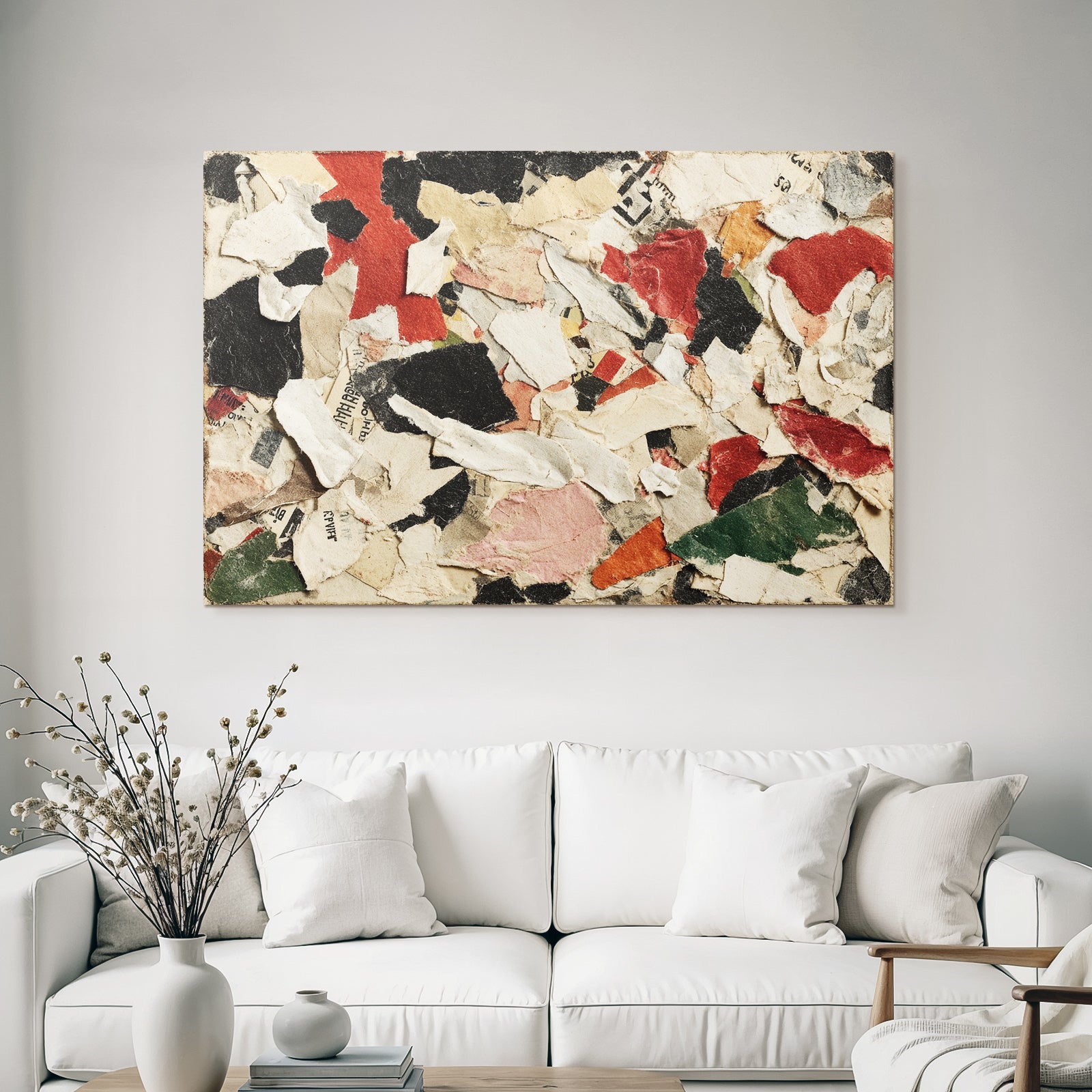 Mach mehr aus Deinem Wohnbereich oder Besprechungszimmer„Abstrakte Papiercollage Mit Farbig Gerissenen Streifen“ im Stil Dadaismus überzeugt als eleganter Textildruck im FameFrame™.
