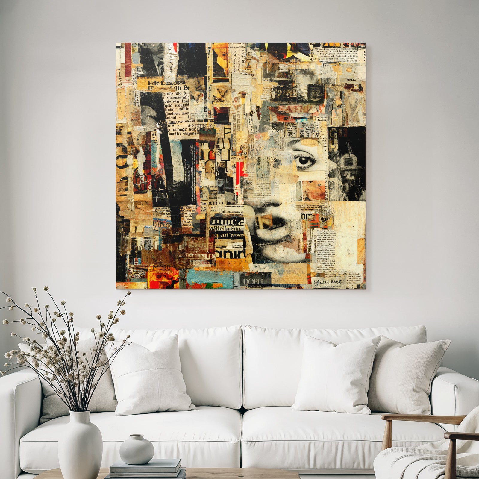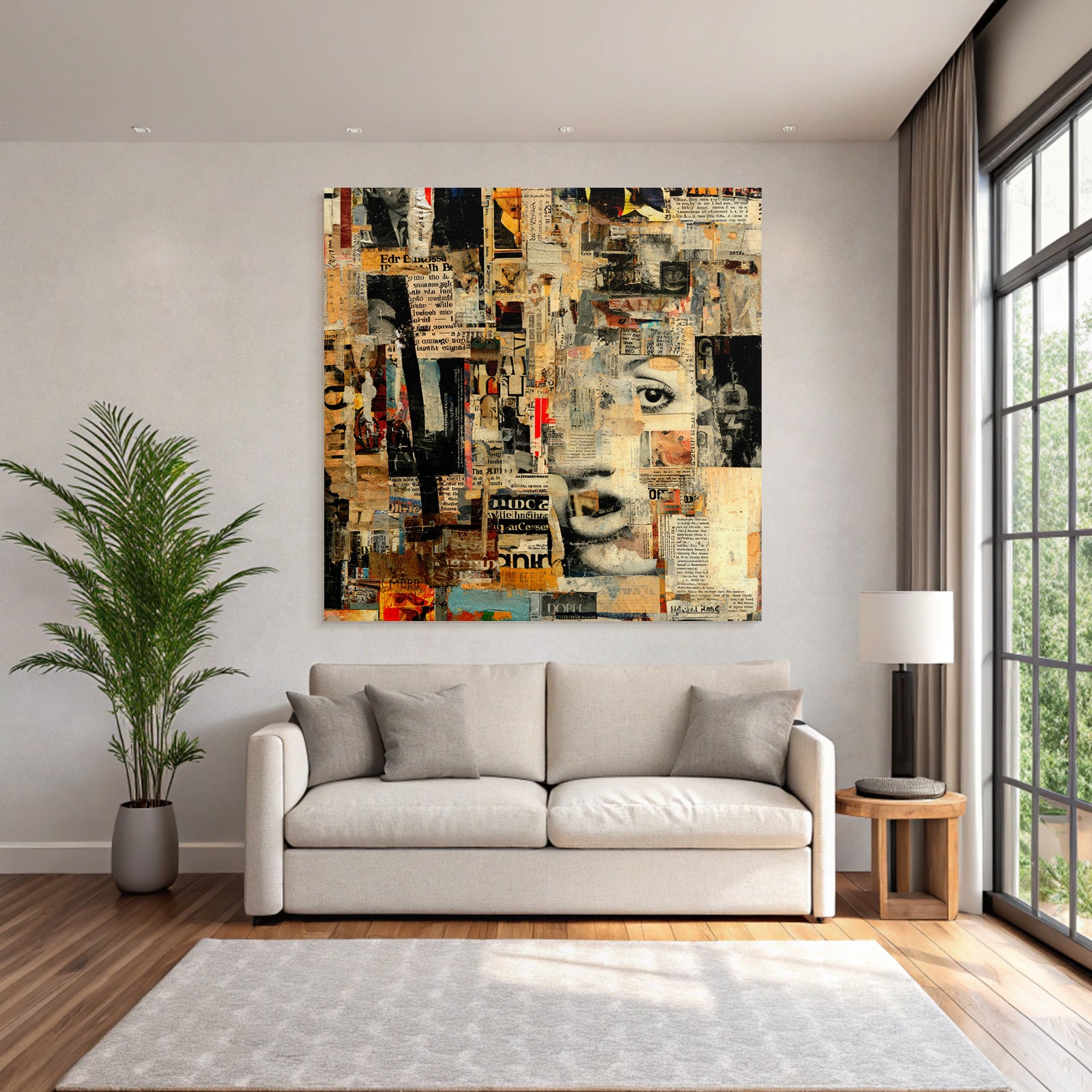 Dieses Kunstwerk zelebriert den Stil Dadaismus. Die klaren Linien (oder organischen Formen) von „Collage Kunstwerk Mit Zeitungstexturen Und Ausdrucksvollem Gesicht“ werden durch den minimalistischen FameFrame™ elegant betont.