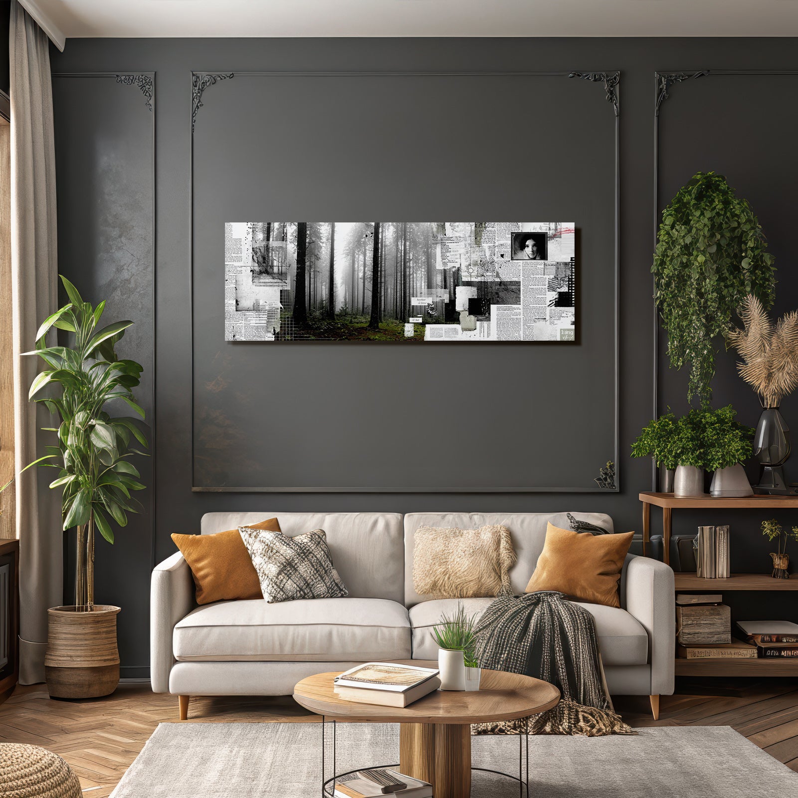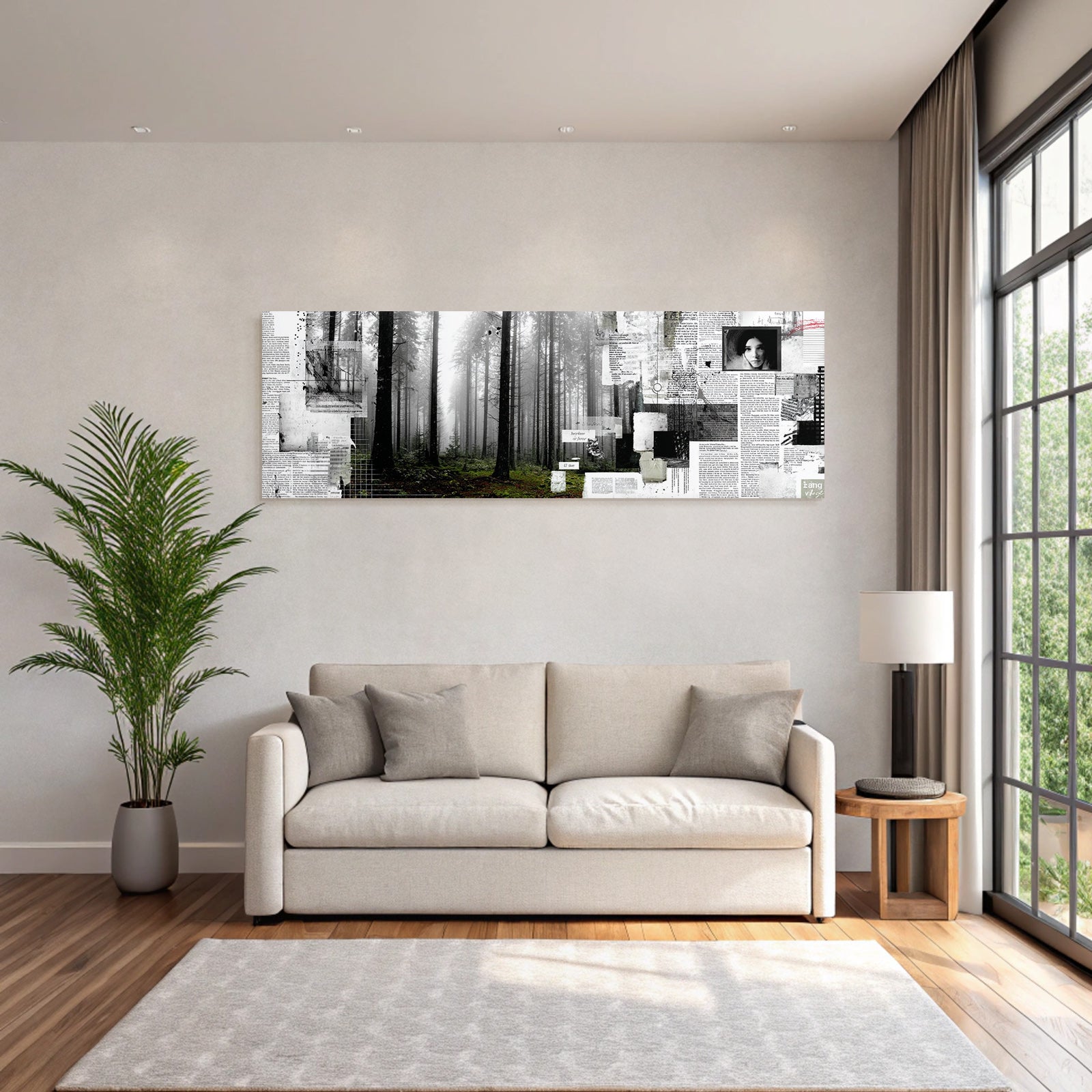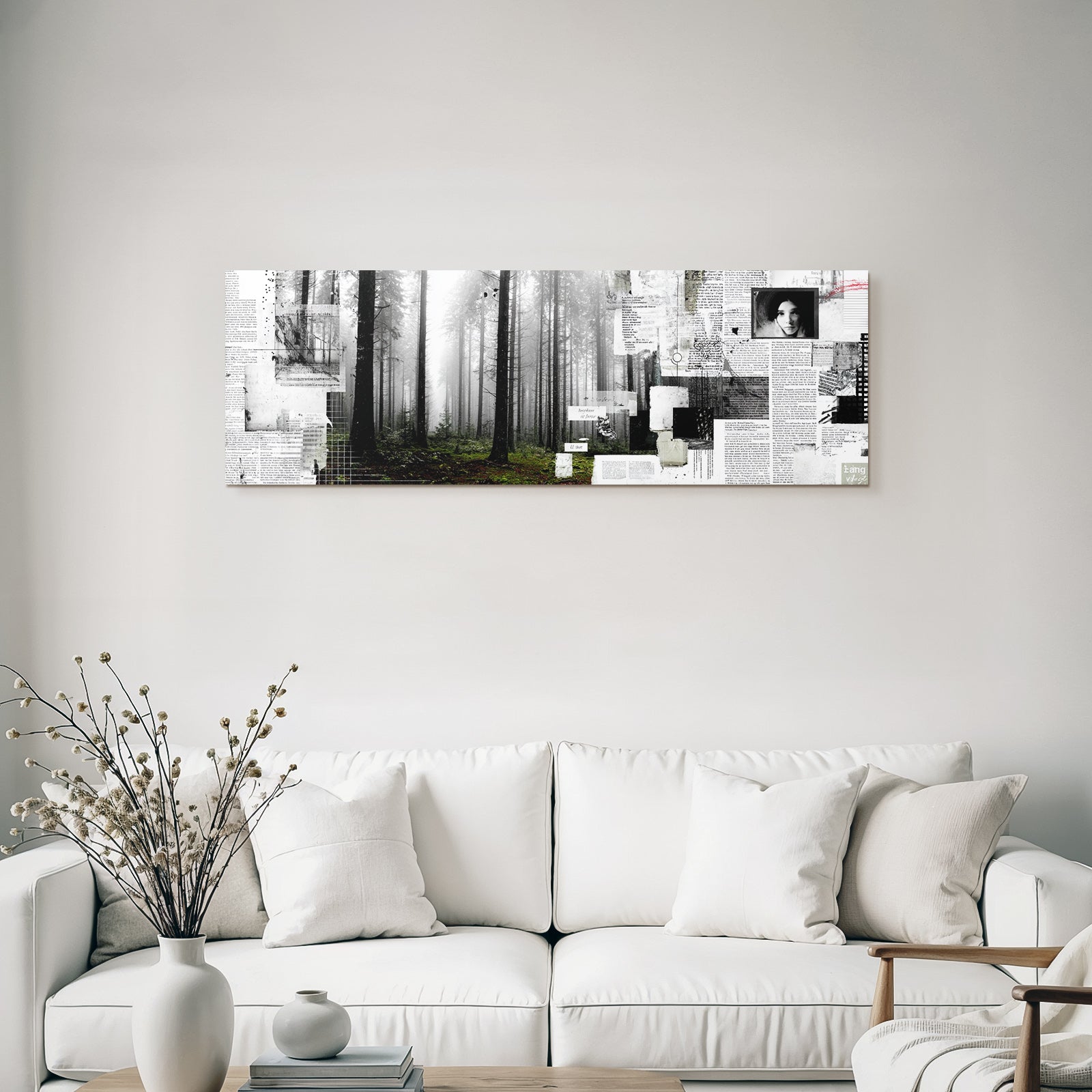 Dieses Kunstwerk zelebriert den Stil Dadaismus. Die klaren Linien (oder organischen Formen) von „Nebliger Wald Mit Textcollage Und Papierstruktur“ werden durch den minimalistischen FameFrame™ elegant betont.