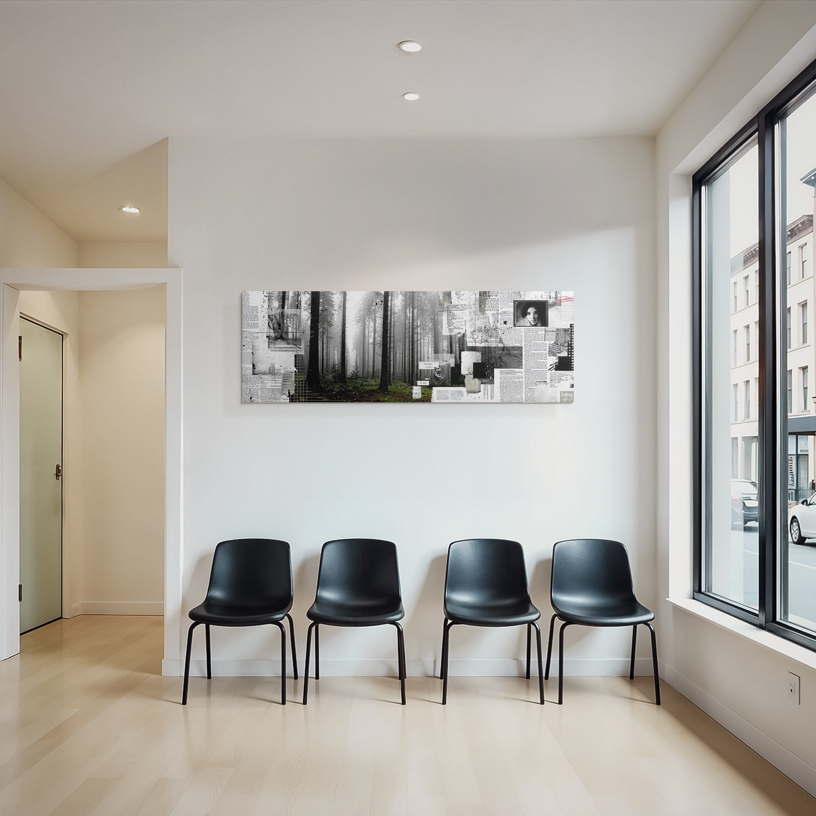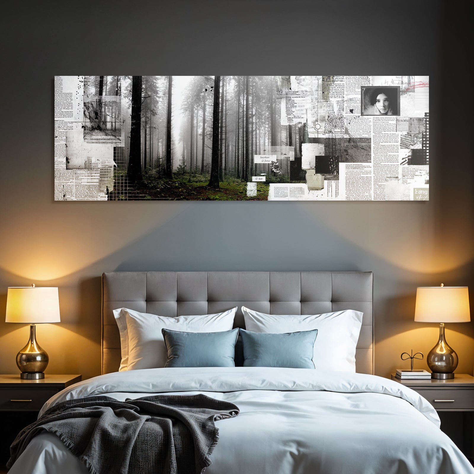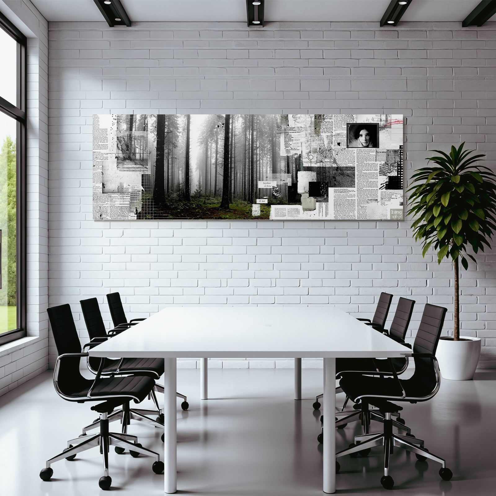 Dieses Kunstwerk zelebriert den Stil Dadaismus. Die klaren Linien (oder organischen Formen) von „Nebliger Wald Mit Textcollage Und Papierstruktur“ werden durch den minimalistischen FameFrame™ elegant betont.