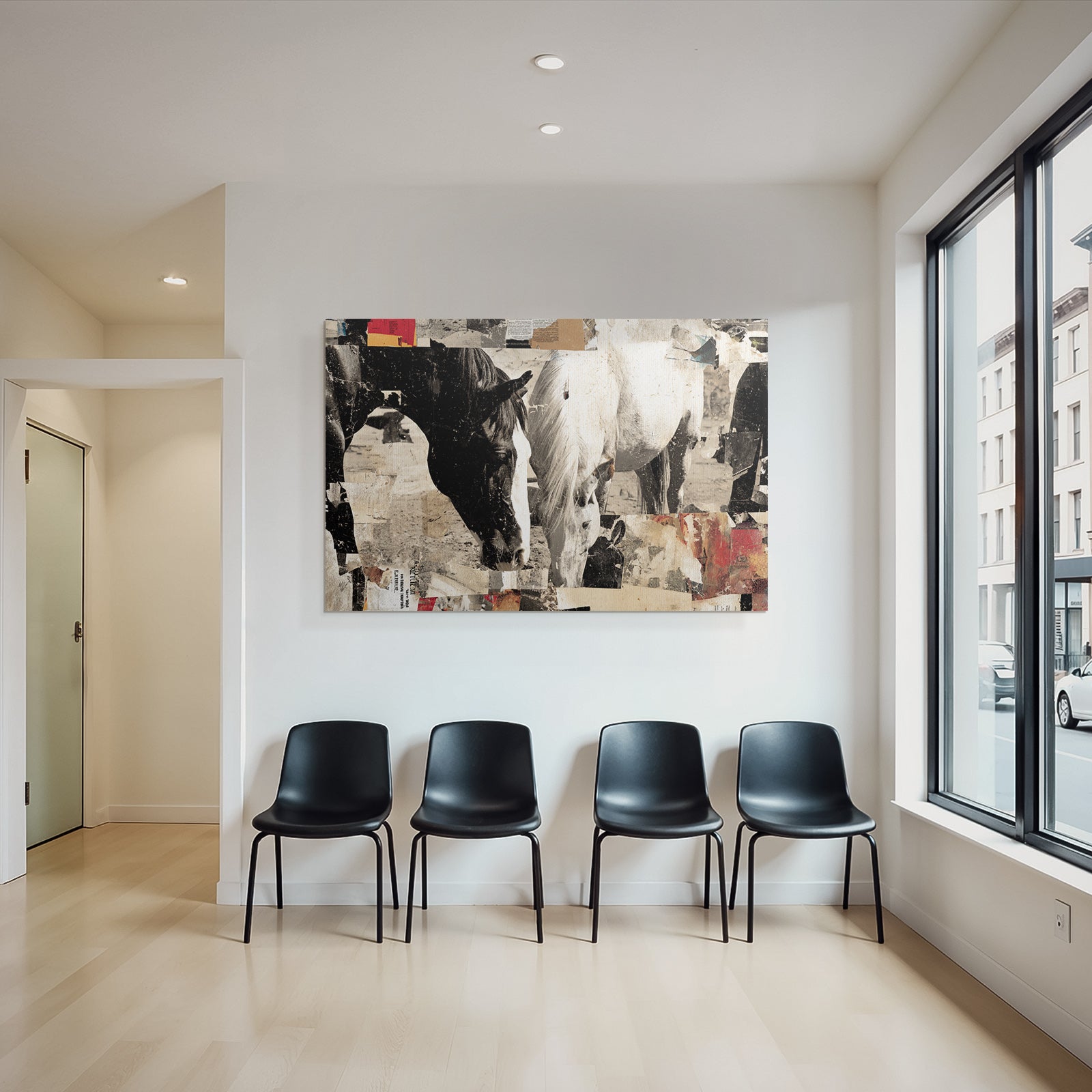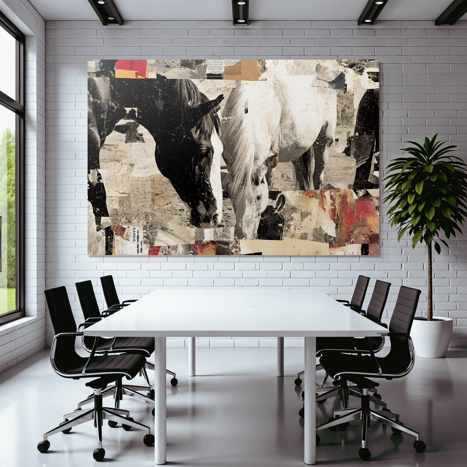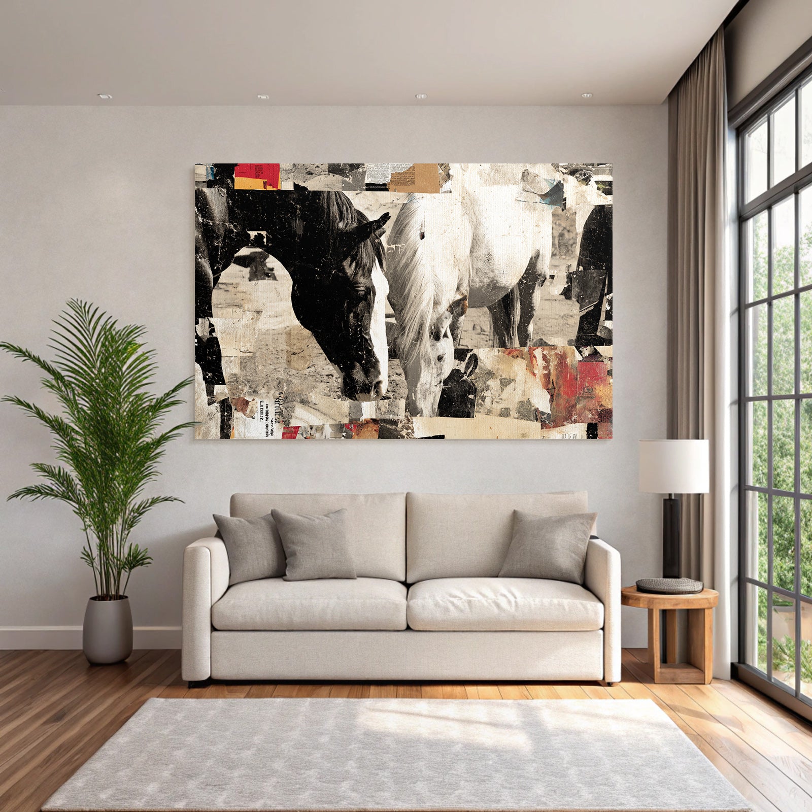 Mach mehr aus Deinem Wohnbereich oder Besprechungszimmer – „Schwarz Weiss Pferde Kunstvolle Kollage“ im Stil Dadaismus überzeugt als eleganter Textildruck im FameFrame™.