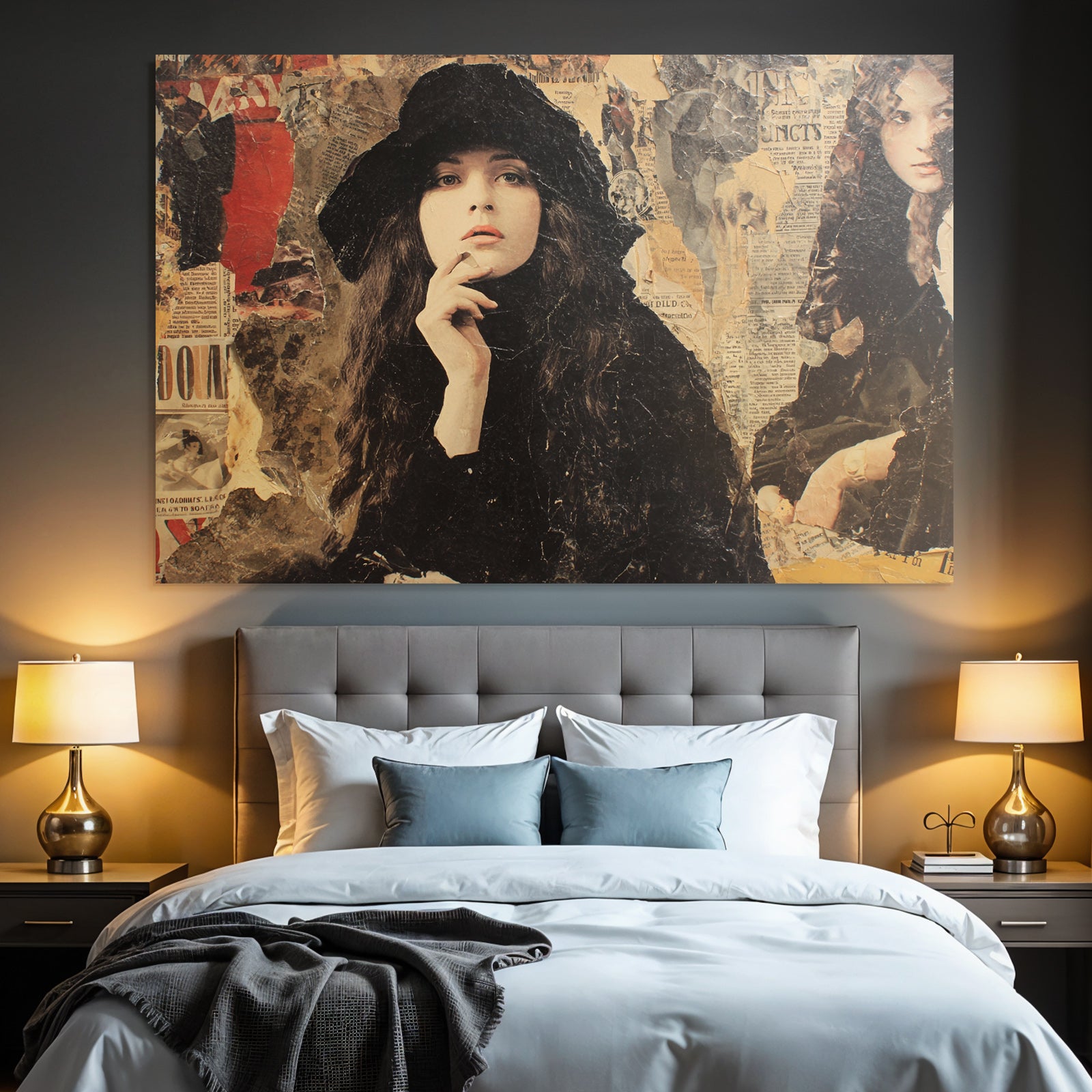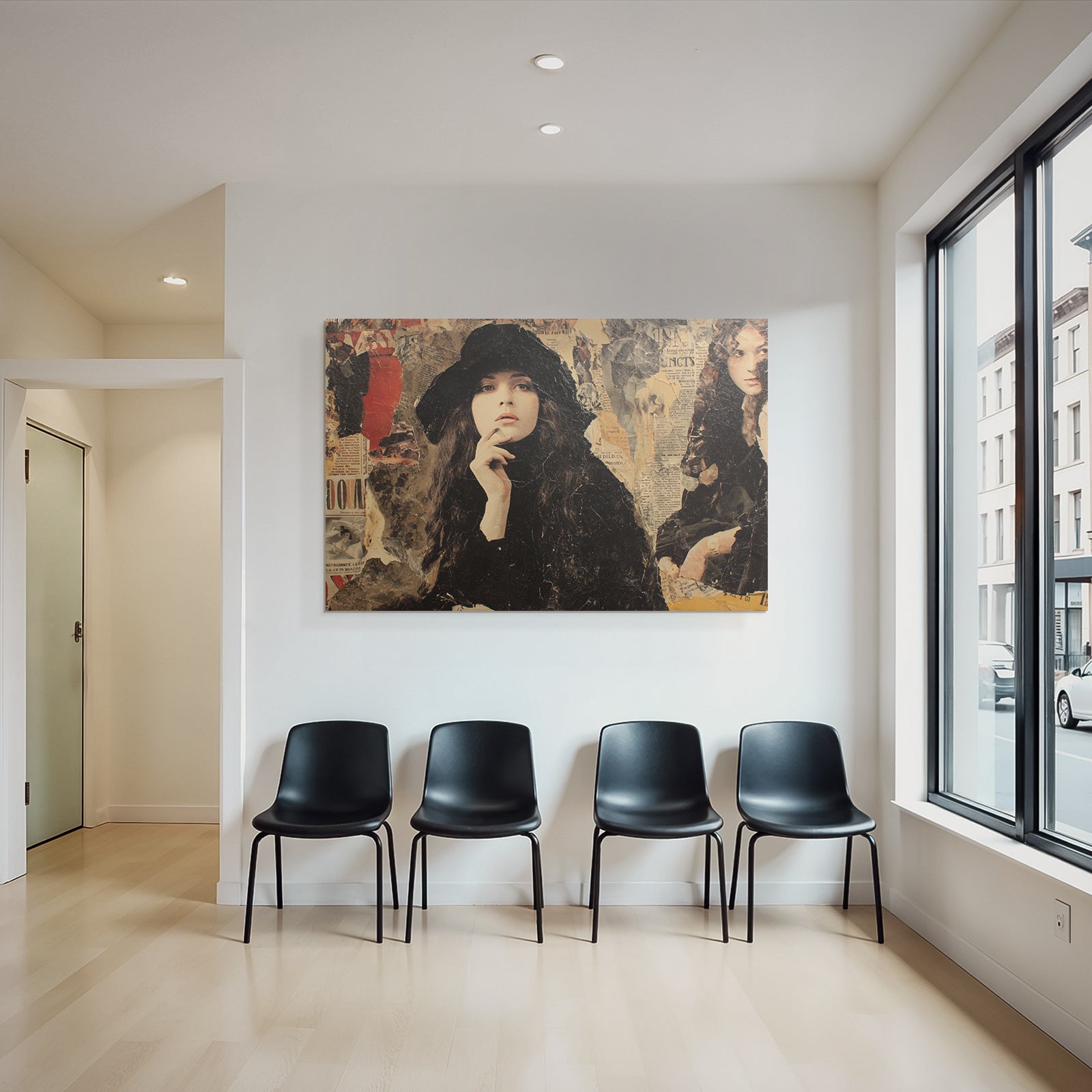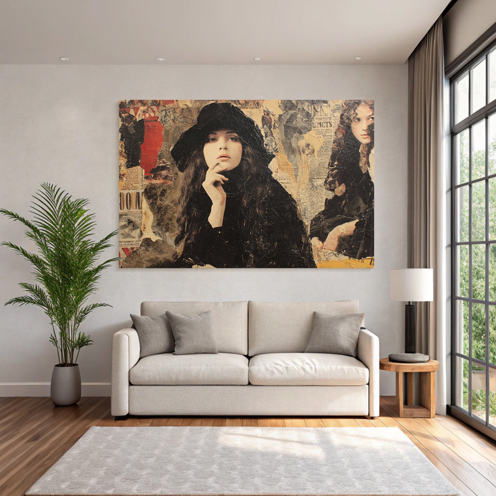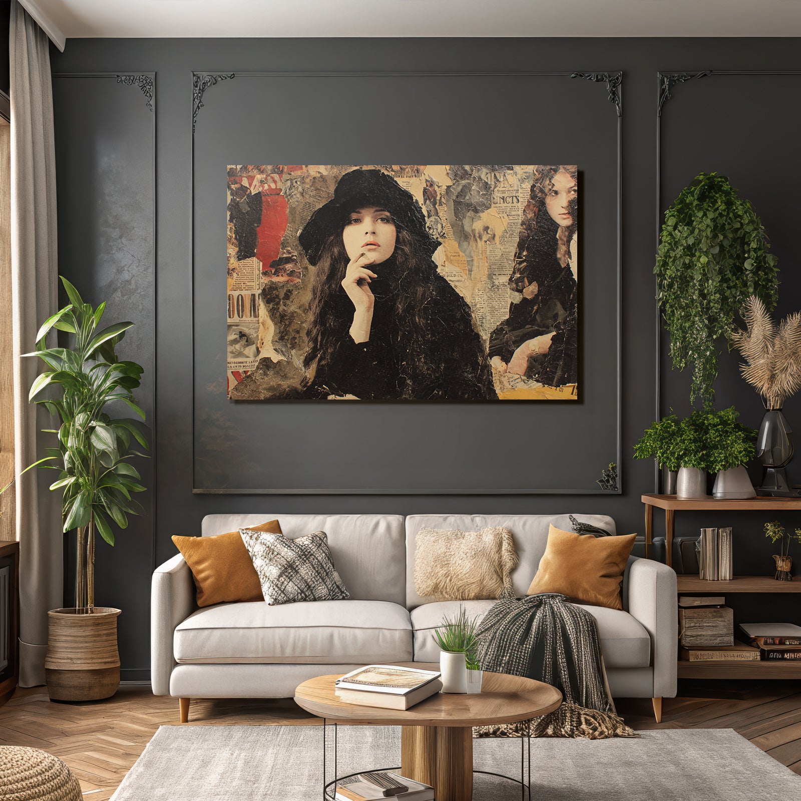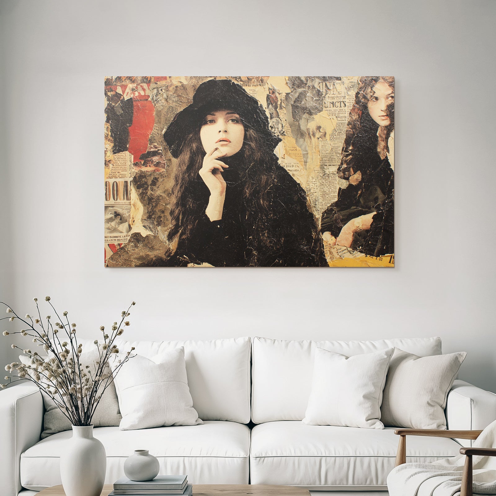Ein Stück Dadaismus für Deine vier Wände: Das Werk „Stilisierte Fraüncollage Mit Hut Und Zeitungstexturen“ im hochwertigen FameFrame™ bringt kreative Energie in jeden Raum.
