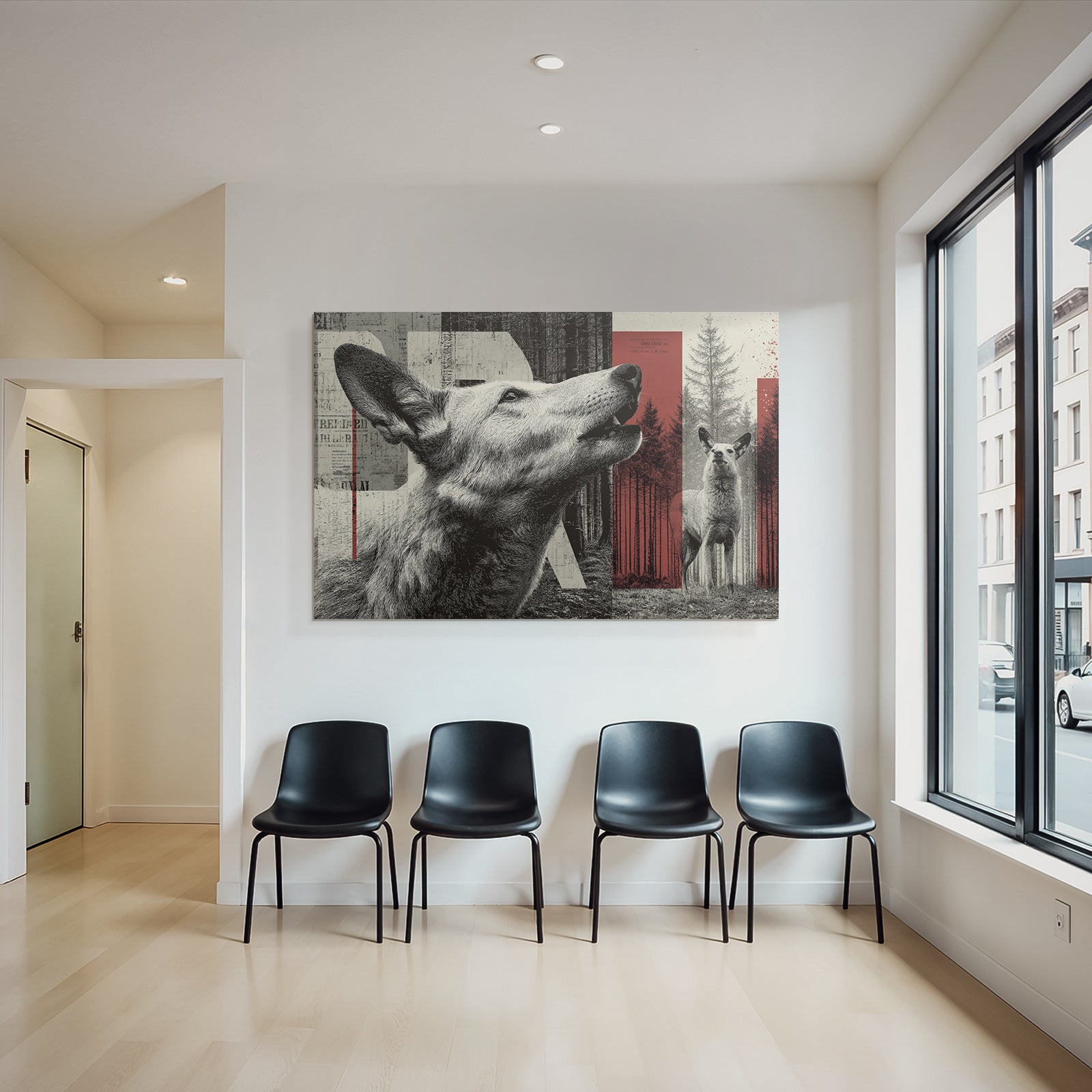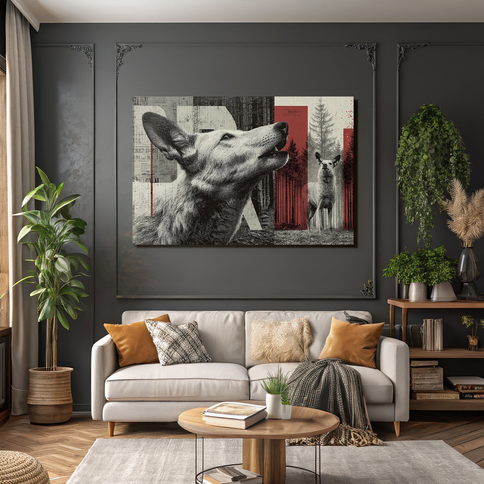 Wenn Sie den Dadaismus-Look schätzen, werden Sie „Stilisierte Hund Und Hirschillustration Im Wald“ lieben. Im exklusiven FameFrame™ wird dieses Motiv zum zentralen Element Ihrer Raumgestaltung.
