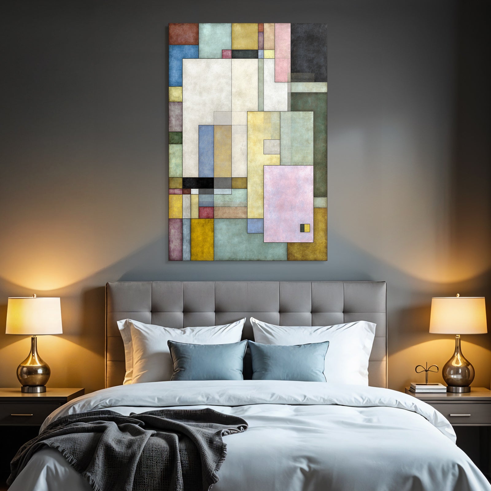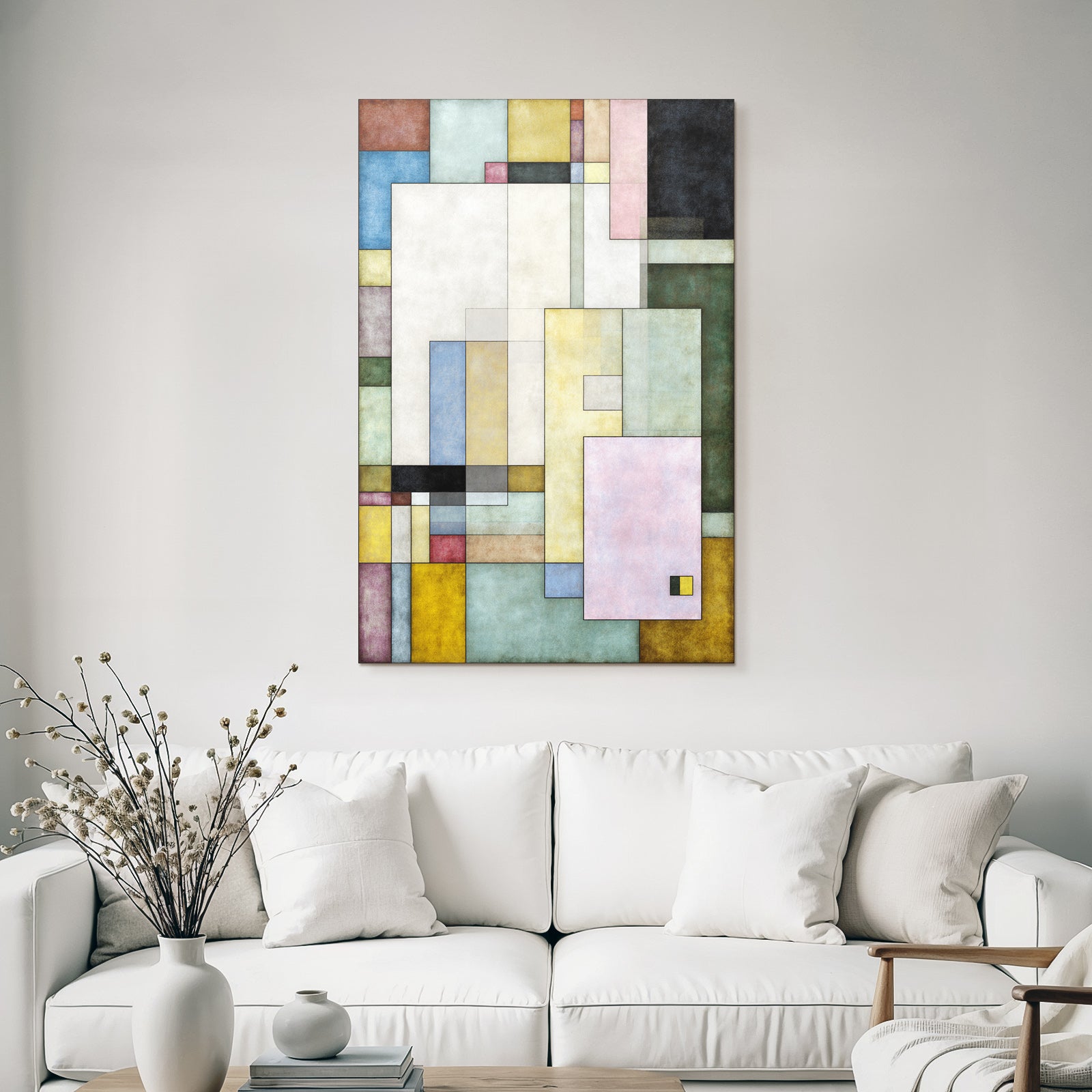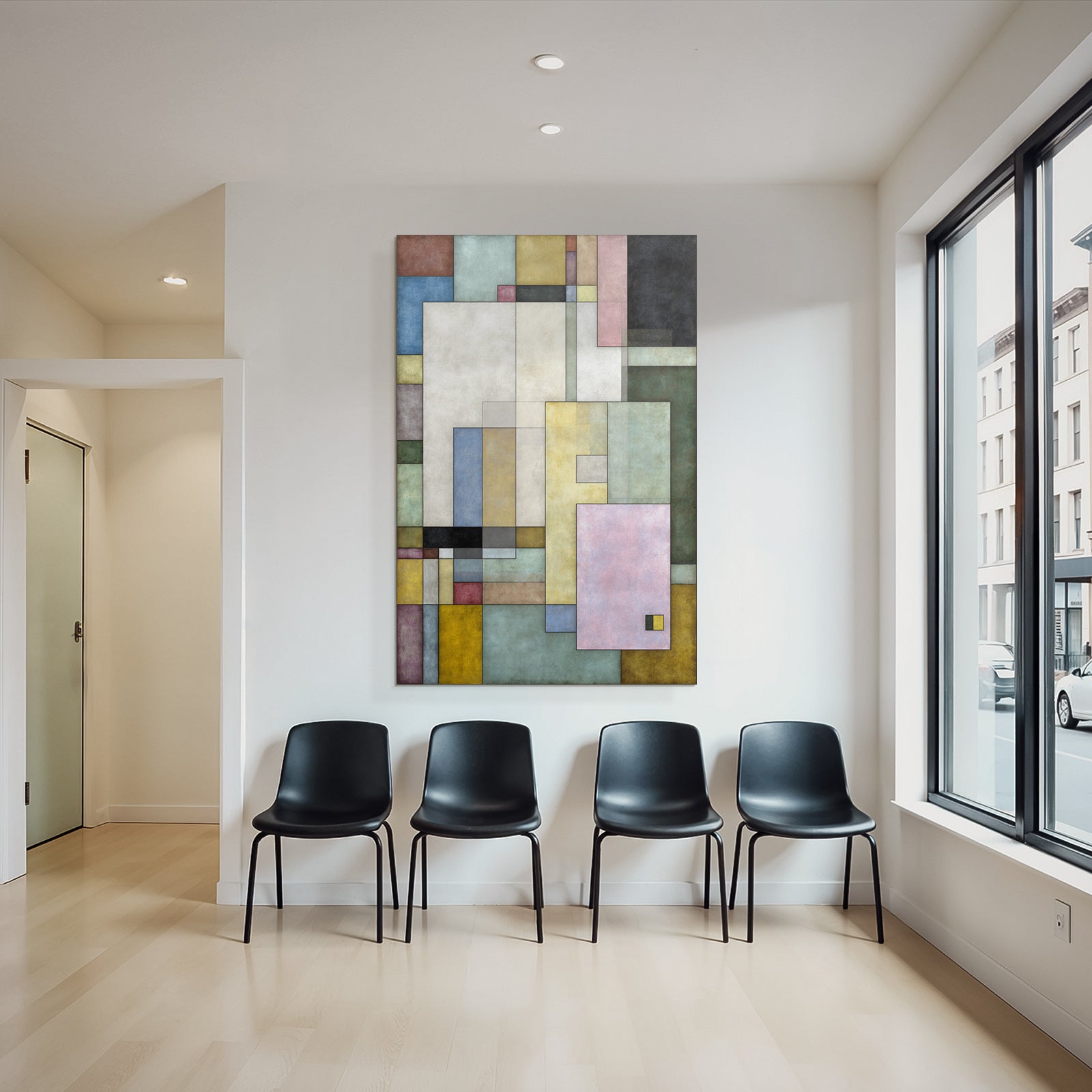 Ein Highlight für Wohnzimmer, Studio oder Empfangsbereich: „„Abstracte Geometrische Komposition Moderne Kunst““ bringt den Stil Digital Art auf Stoff – gespannt im edlen FameFrame.