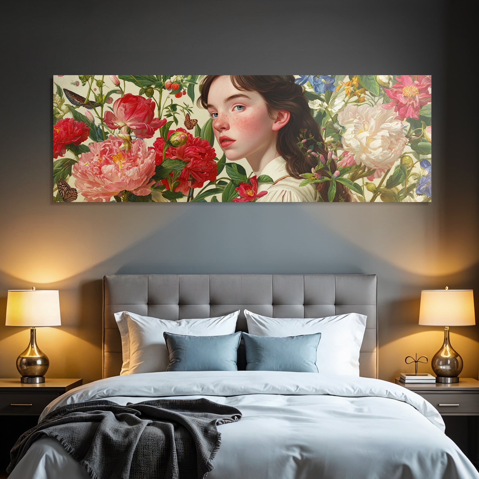 Setze Akzente im Esszimmer, Salon oder Praxisraum mit dem Kunstwerk „„Junge Mit Blumen Und Schmetterlingen““ im Stil Digital Art – gespannt im edlen FameFrame.