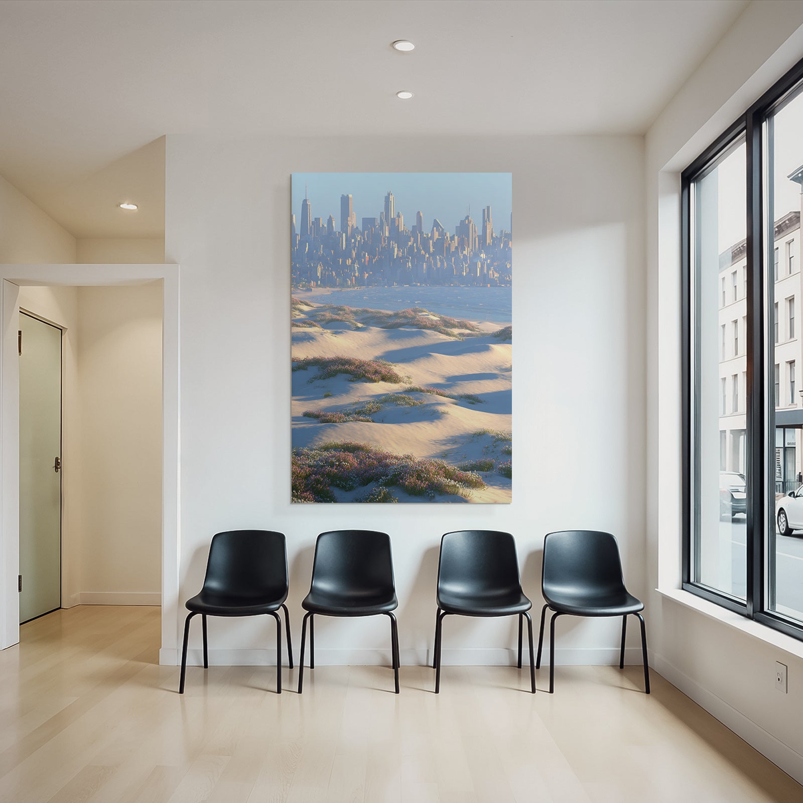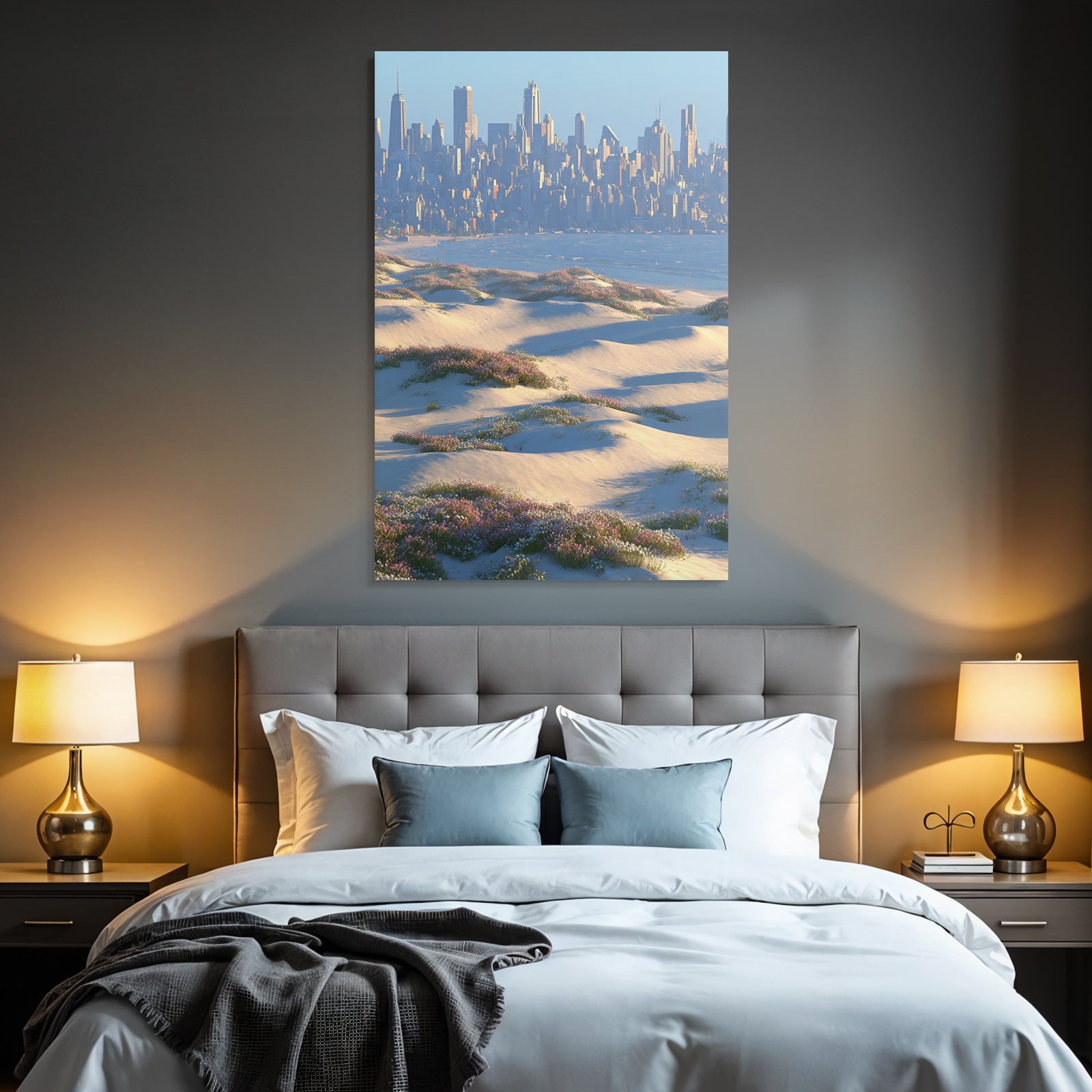 Die Kombination aus dem Motiv „Sanddünen Blumen Stadt Skyline Küste“ und dem Stil Dünen und Heide schafft eine Brücke zwischen Klassik und Moderne. Der FameFrame™ vollendet dieses Zusammenspiel perfekt.