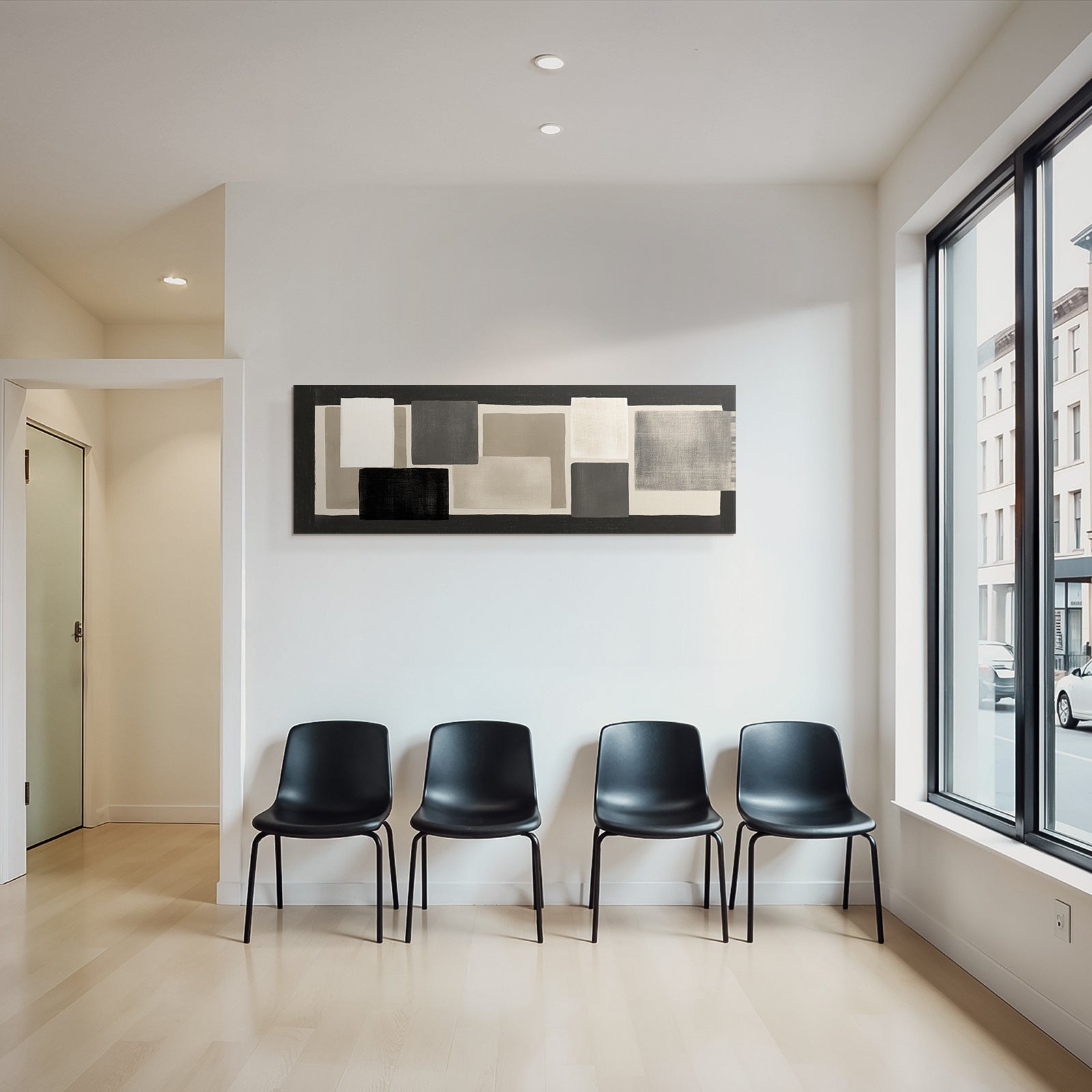 Verleihe Lobby, Wartezimmer oder Studio eine besondere Atmosphäre mit „„Abstracte Kunst Monochrom Rectangular Shapes““ im Stil Modern Basic – eindrucksvoll im FameFrame präsentiert.