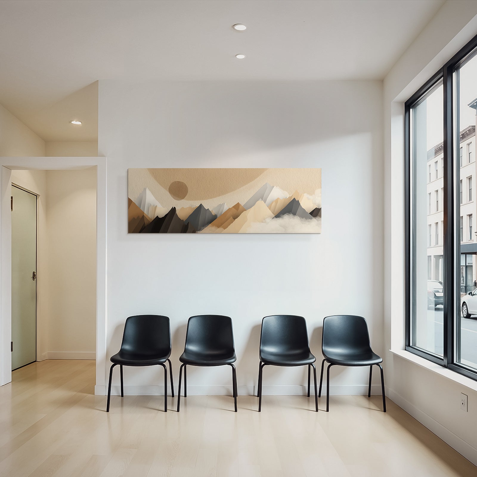 Mit dem Werk „„Berglandschaft Erdig Stilisiert Digitale Kunst““ im Stil Modern Basic gestaltest Du Dein Wartezimmer oder Deine Hotel-Lobby eindrucksvoll und modern – auf Stoff im FameFrame.