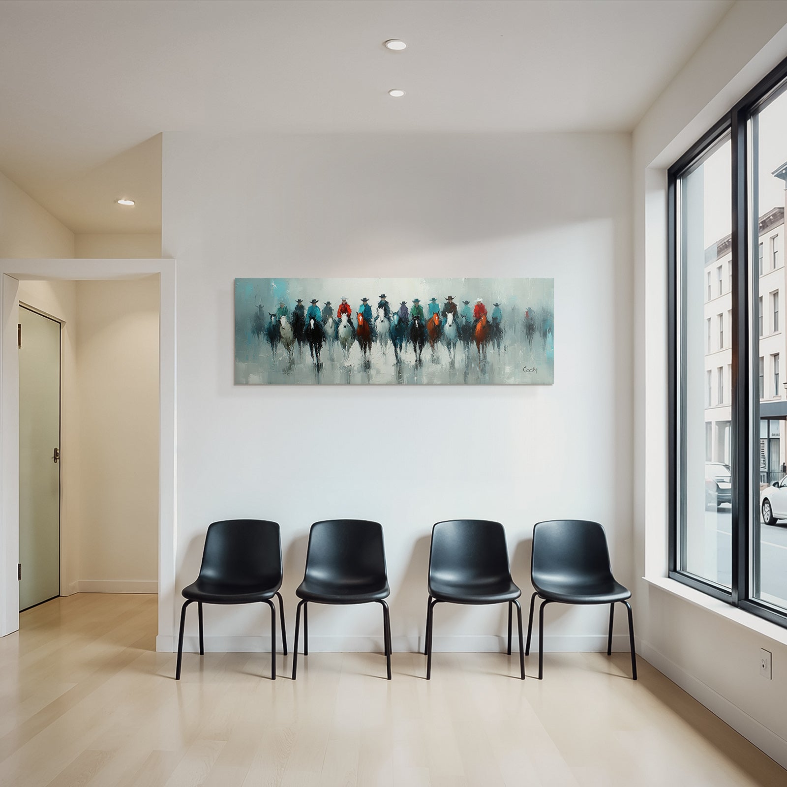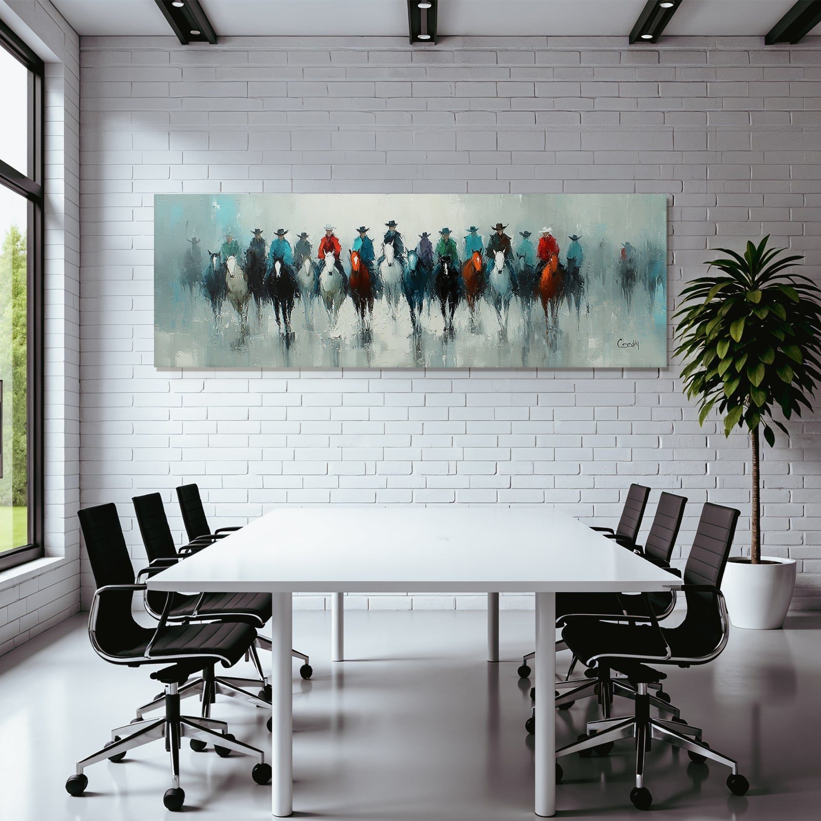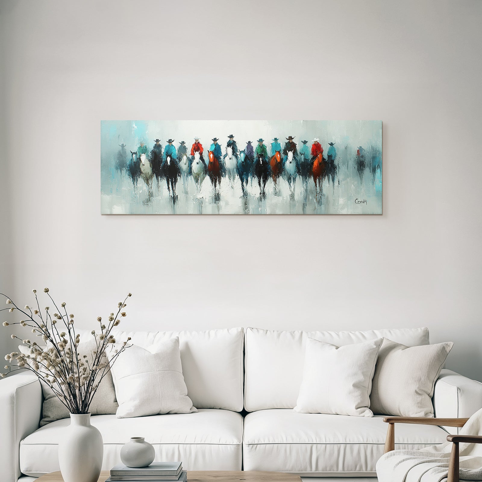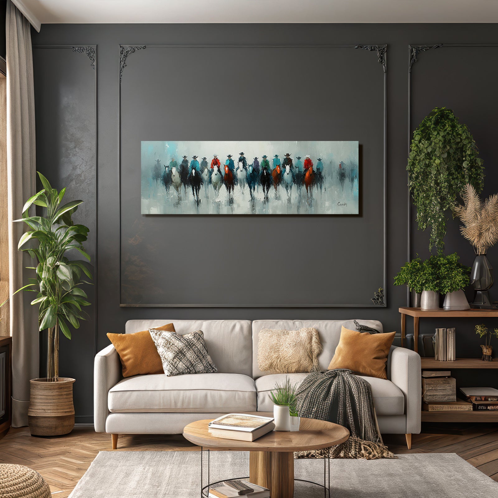 „„Cowboys Auf Pferden Abstrakte Kunst““ bringt den Stil Grandeur Chic an Deine Wand – perfekt für Schlafzimmer, Homeoffice oder Besprechungsräume, edel gerahmt im FameFrame.