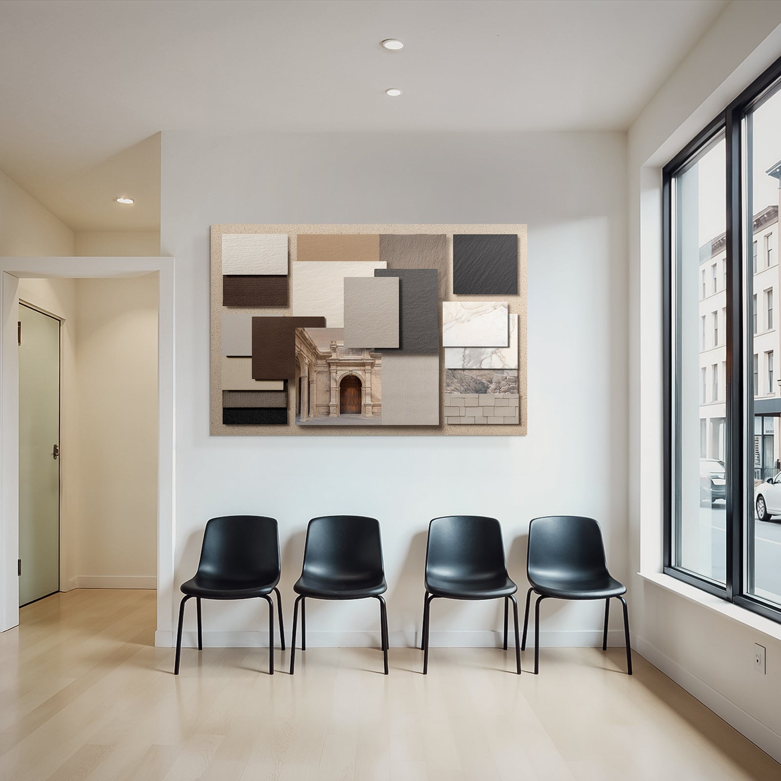 Ein Highlight für Wohnzimmer, Studio oder Empfangsbereich: „„Designkonzept Materialien Und Texturen Moodboard““ bringt den Stil Modern Basic auf Stoff – gespannt im edlen FameFrame.