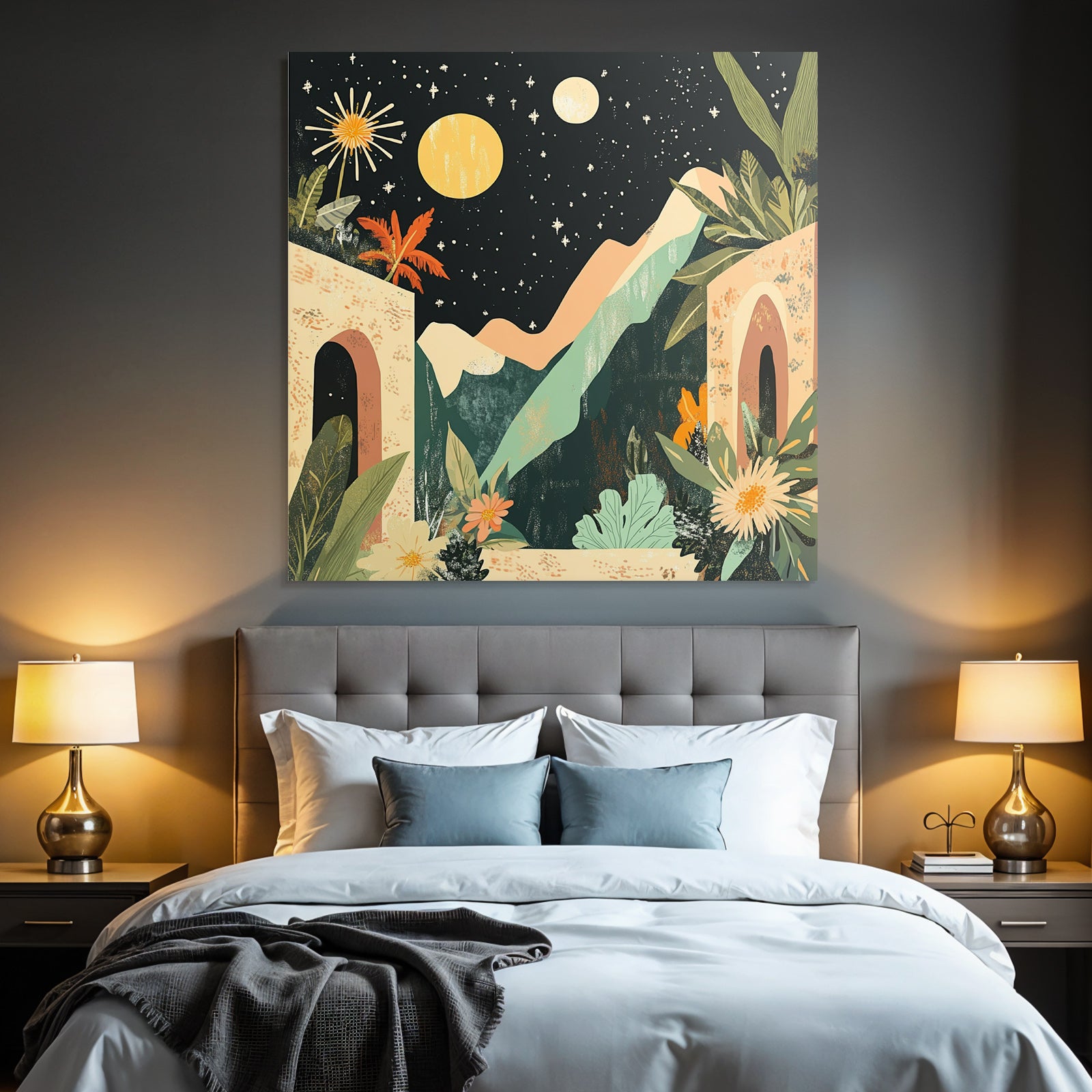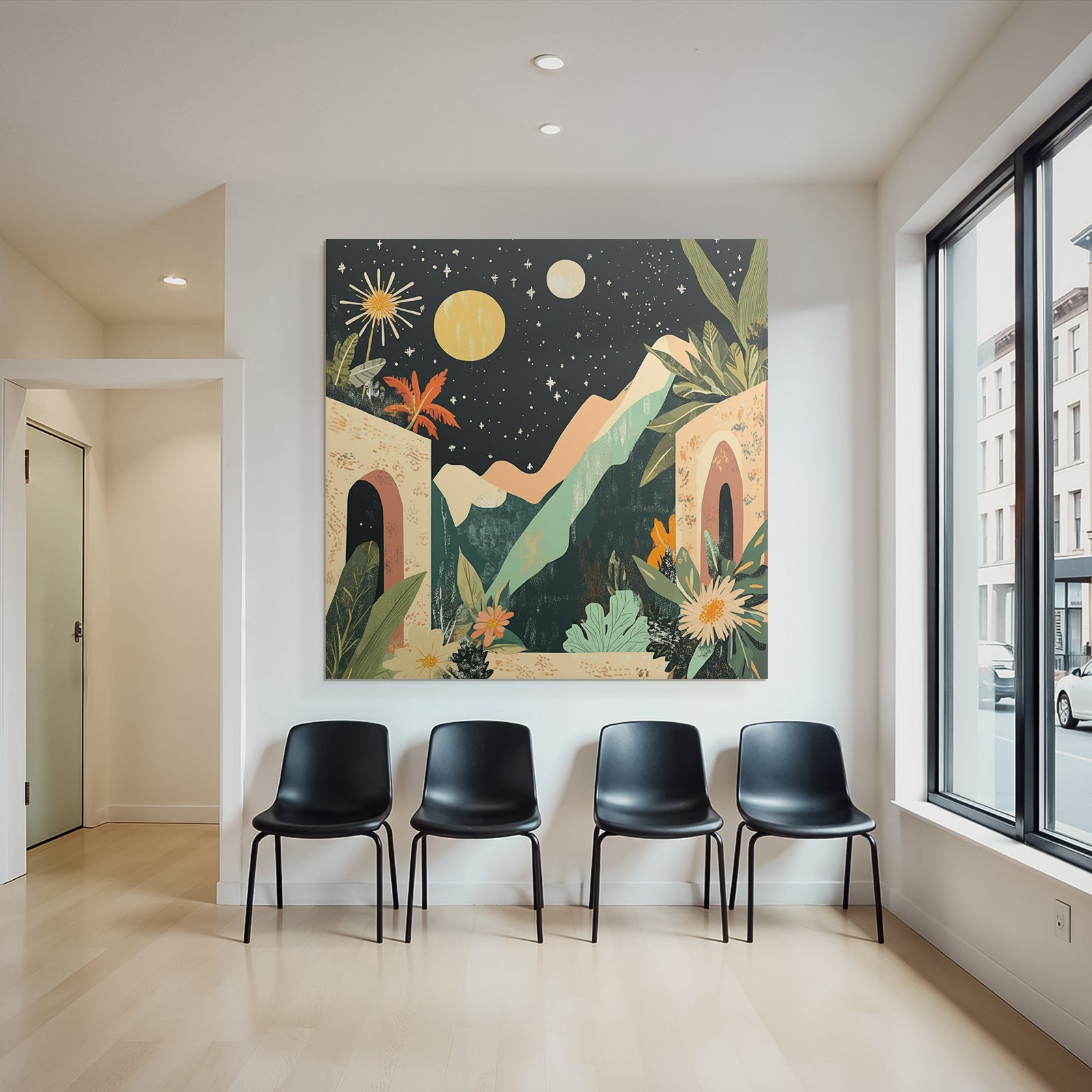 Setze Akzente im Esszimmer, Salon oder Praxisraum mit dem Kunstwerk „„Landschaft Mit Bergen Pflanzen Und Himmel““ im Stil Boho Eklektisch – gespannt im edlen FameFrame.