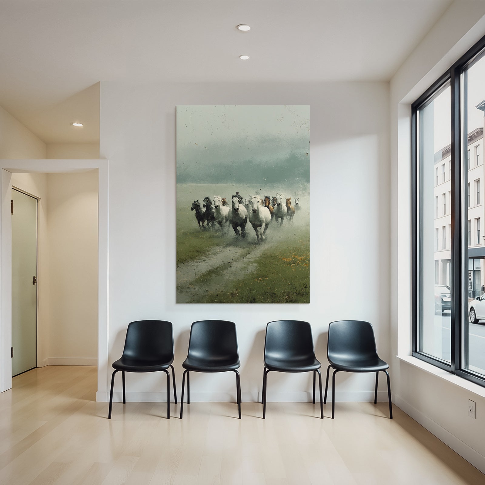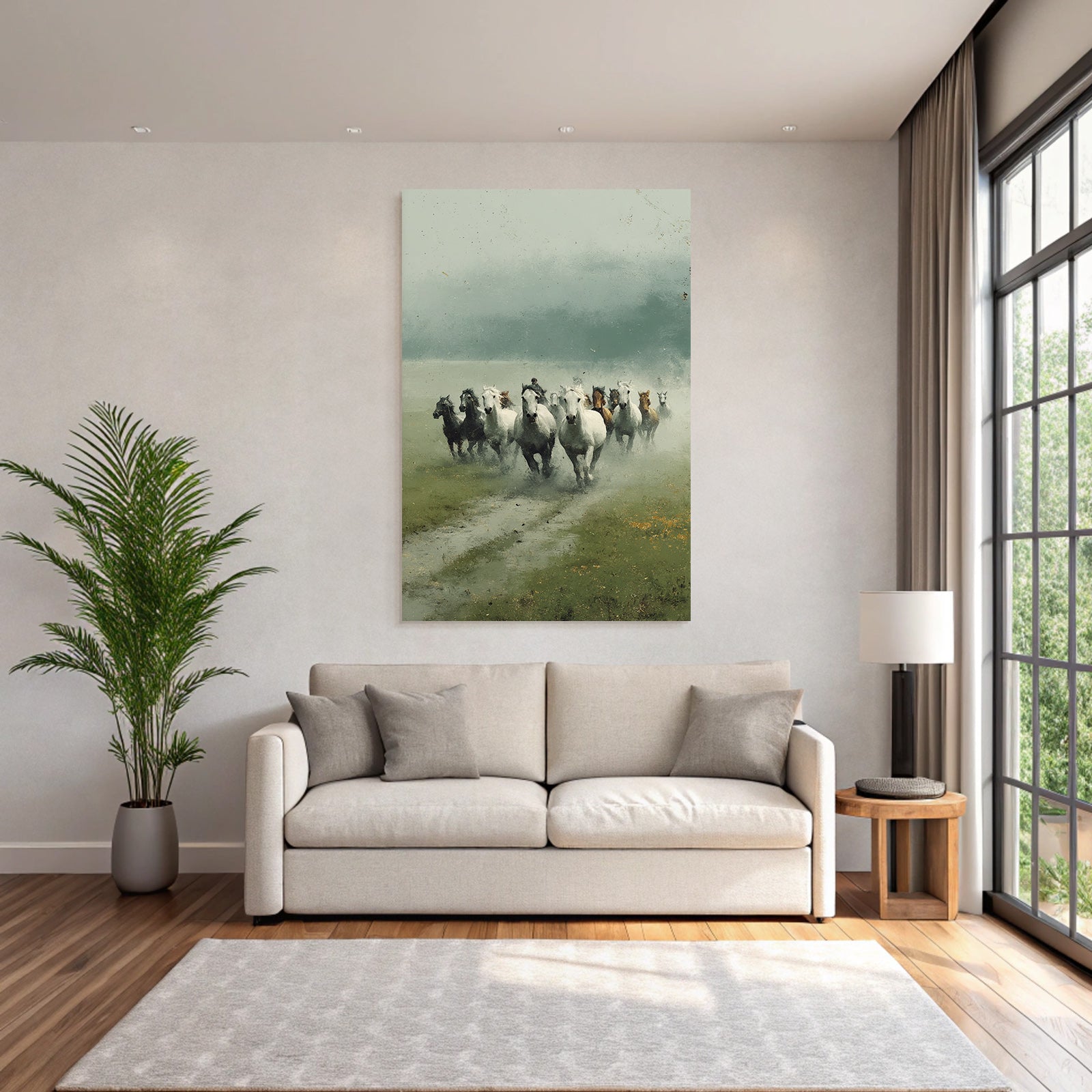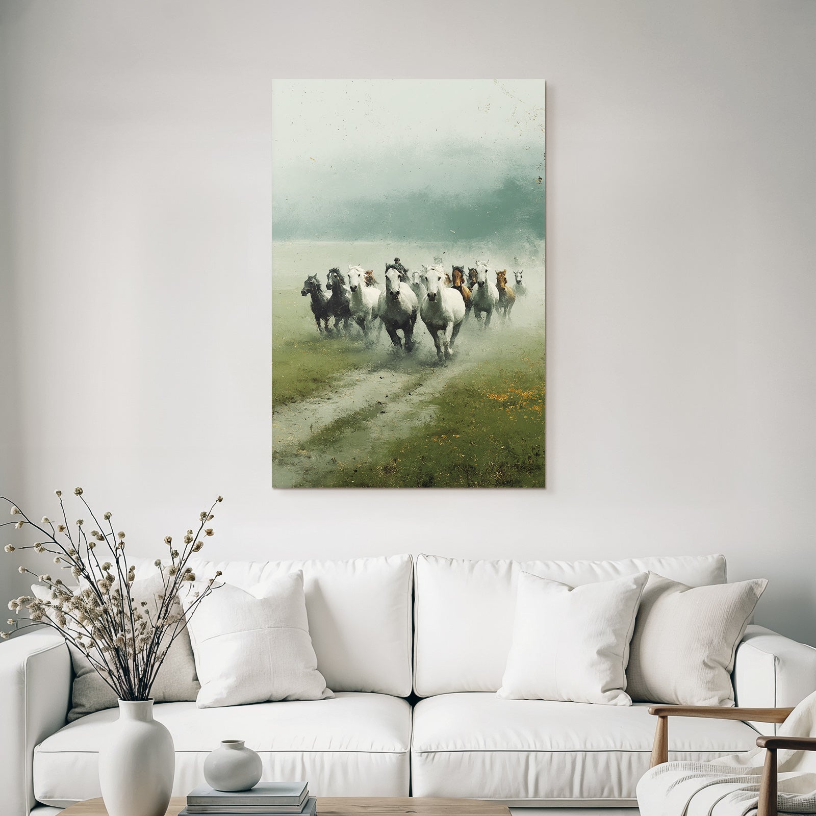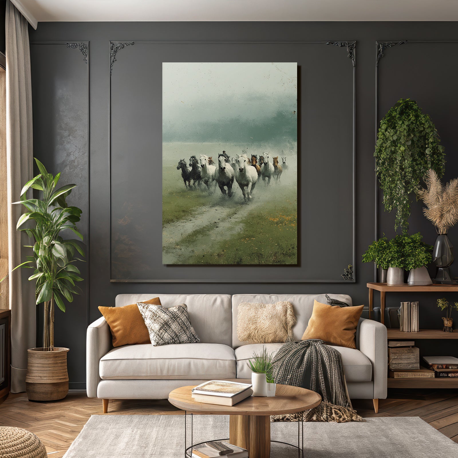 Bring die Atmosphäre von Grandeur Chic in Dein Zuhause – mit „„Pferde Im Nebel Und Reiter““ auf Stoff im austauschbaren FameFrame.