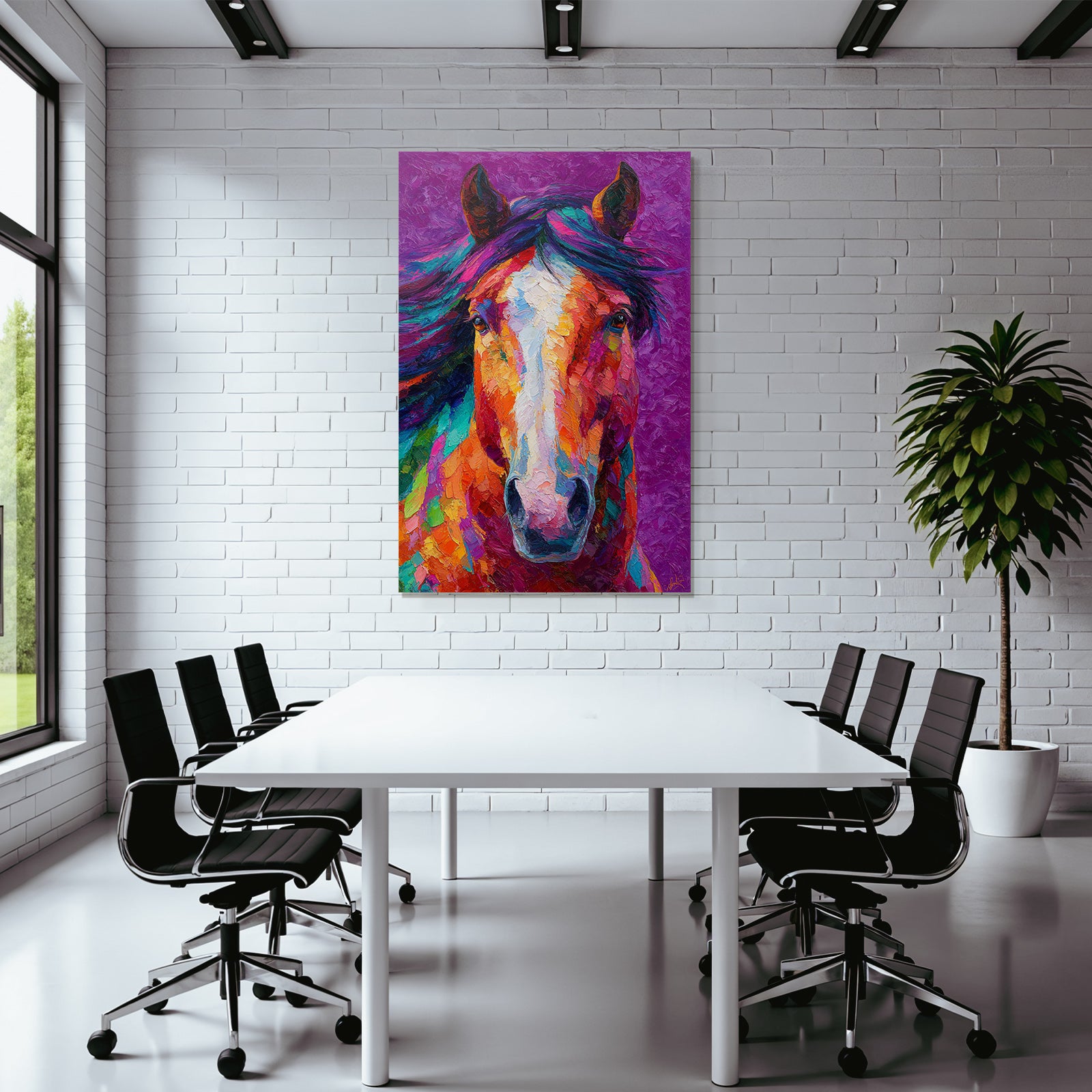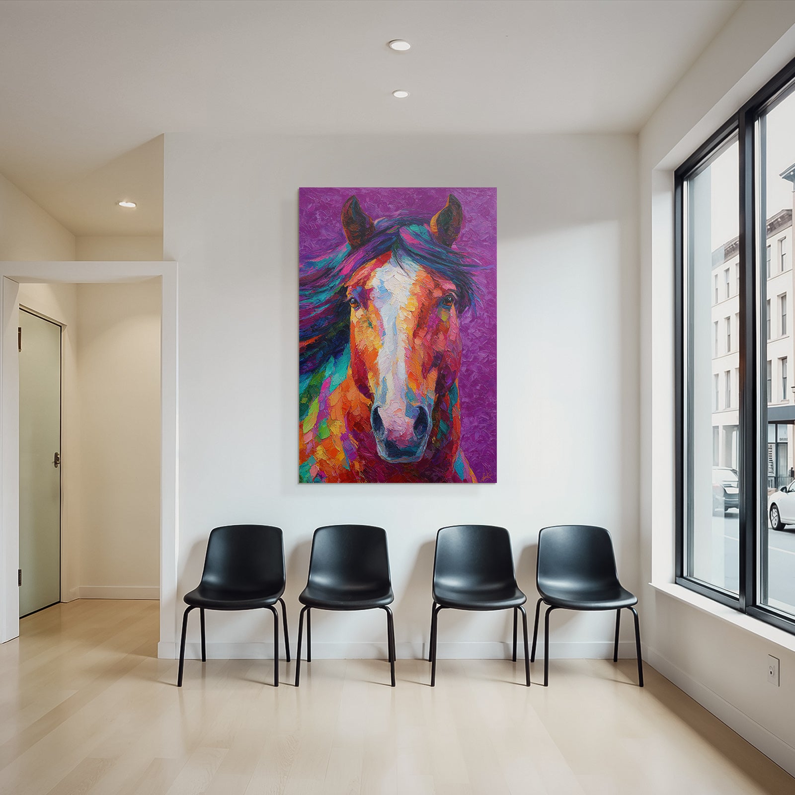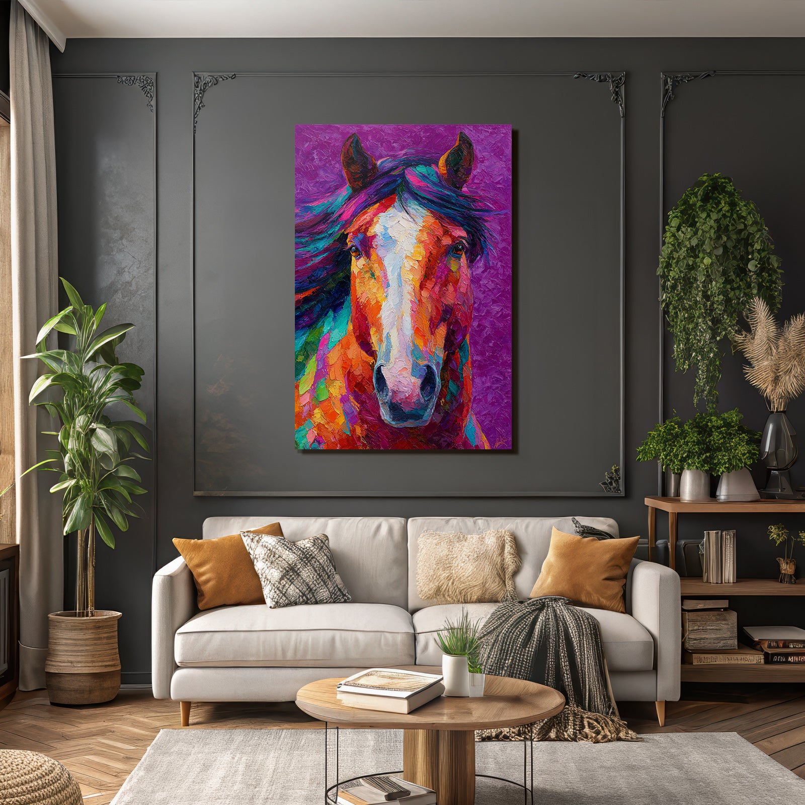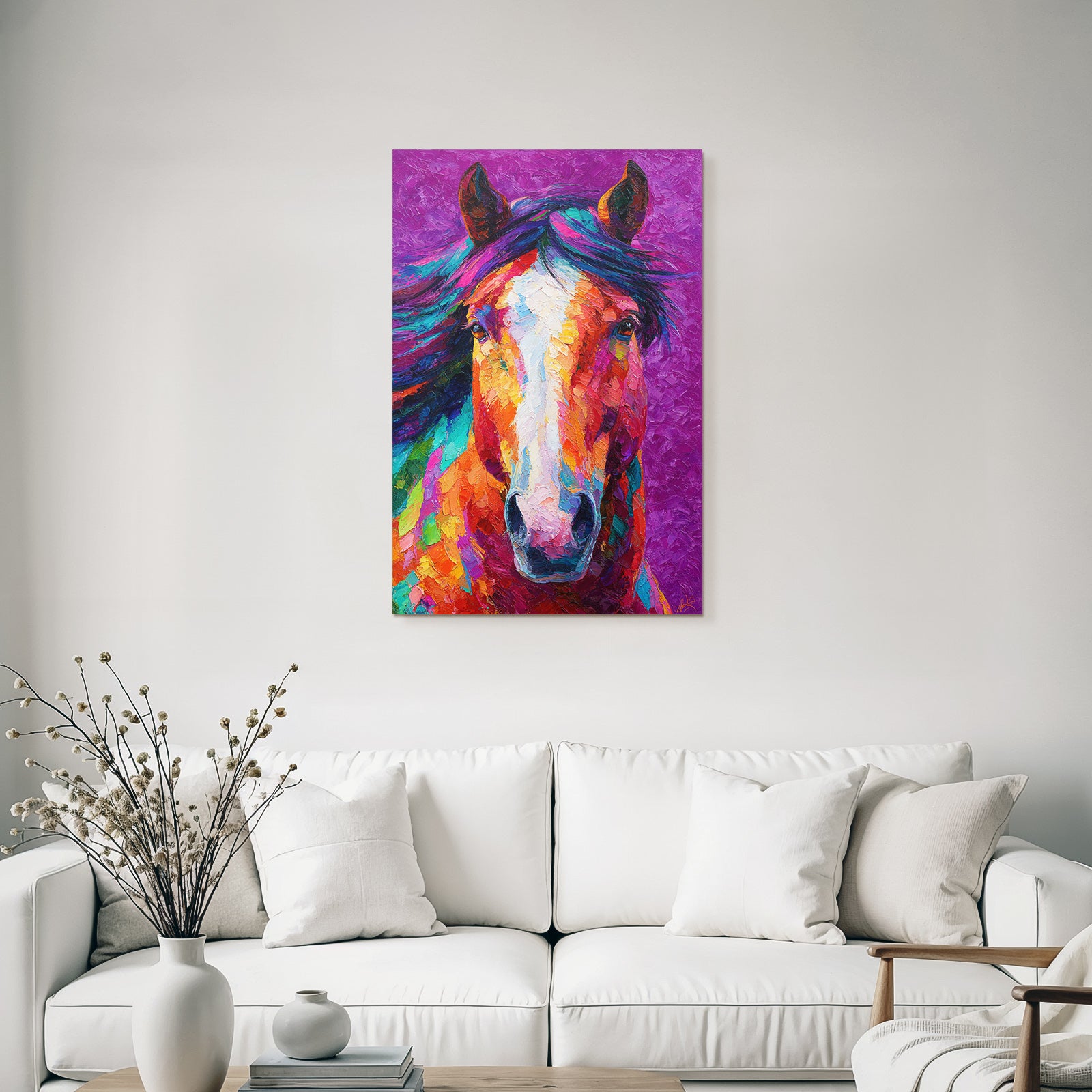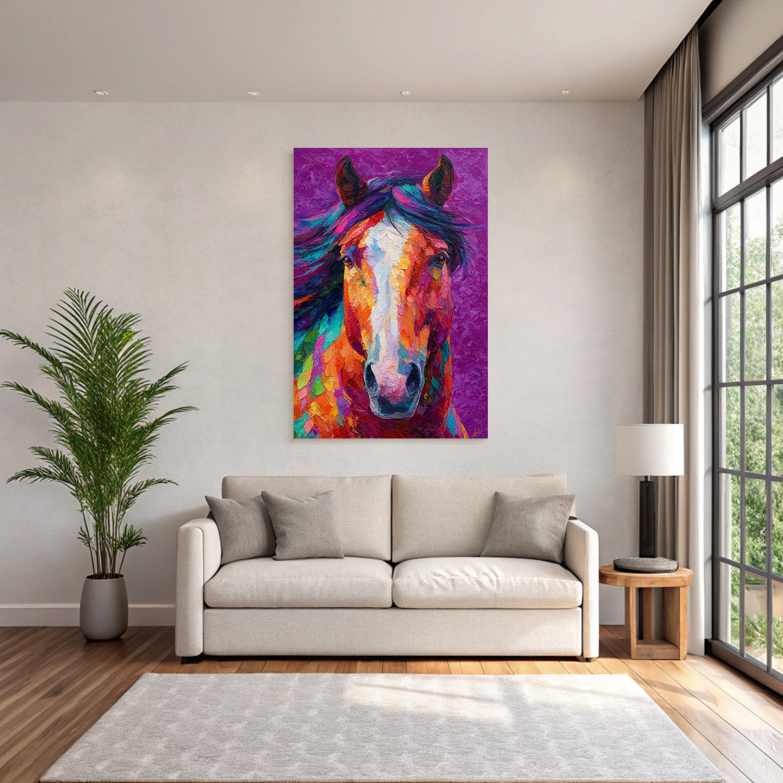 Verschönere Dein Zuhause mit diesem Werk im Stil Expressionismus. Der Titel „Buntes Pferdegemalde Mit Lila Hintergrund“ kommt im hochwertigen FameFrame™ perfekt zur Geltung.