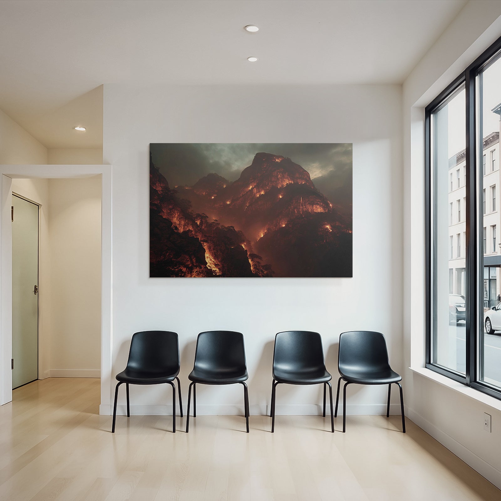 Das Kunstwerk „Dramatische Berglandschaft Im Feürlicht“ ist eine Hommage an den Stil Feuer und Vulkane. Im FameFrame kommt die Farbbrillanz und Detailtiefe des Motivs perfekt zur Geltung.