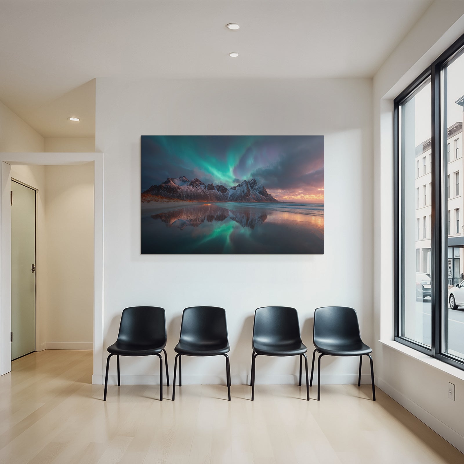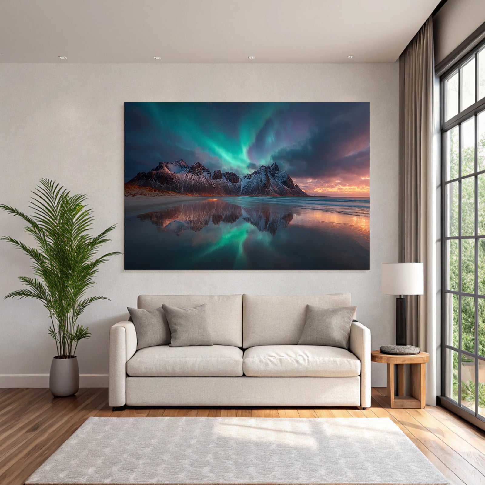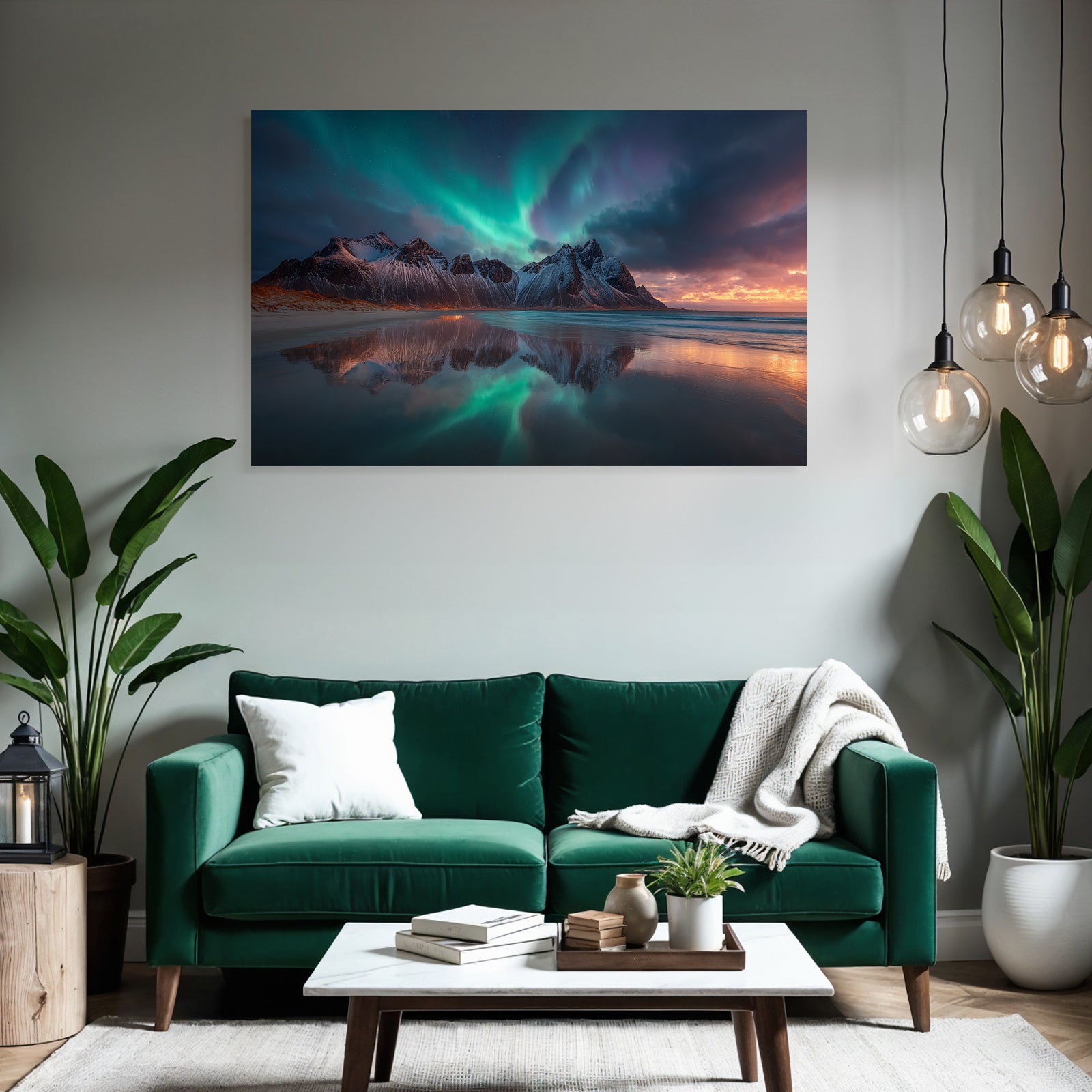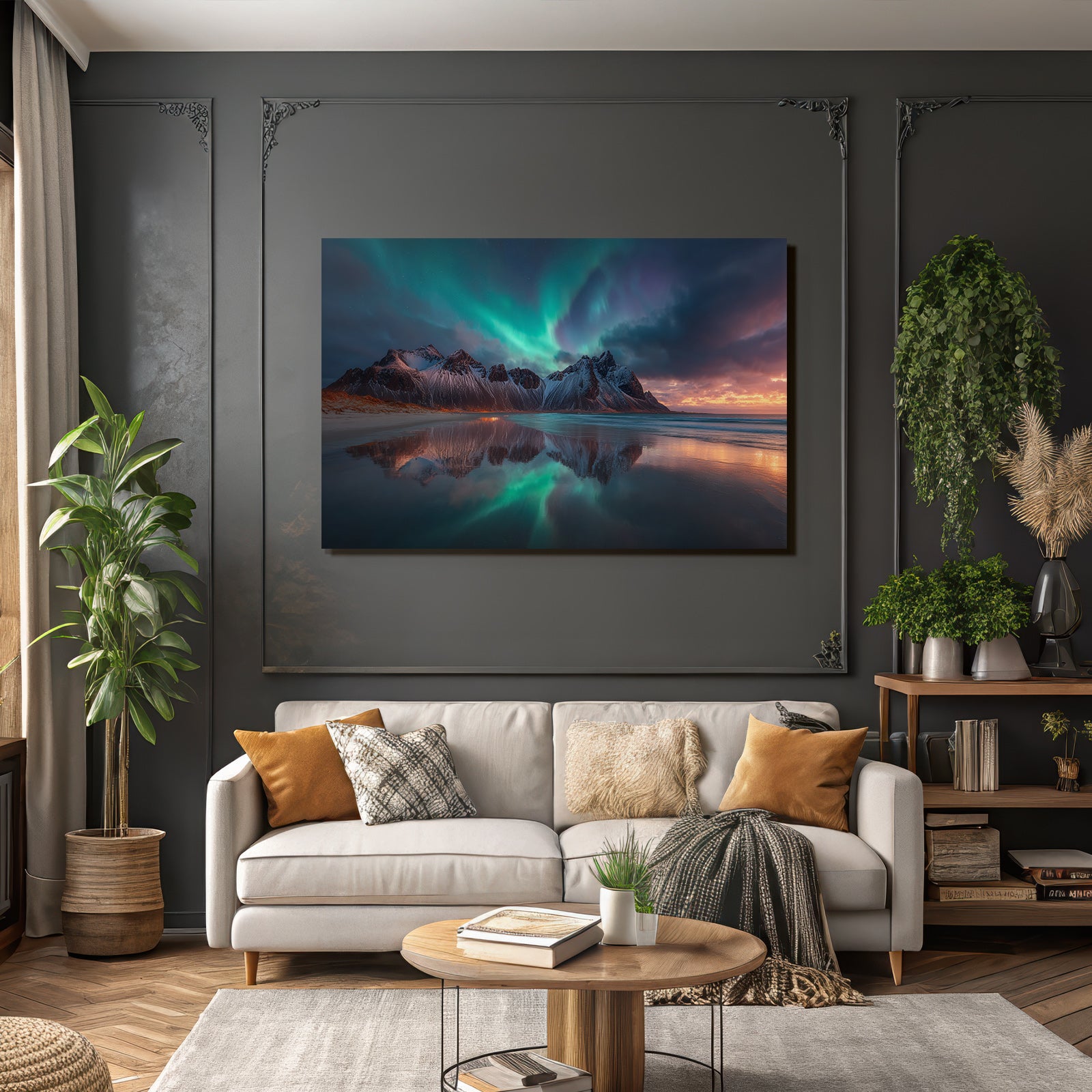 Dieses Werk mit dem Titel „Polarlicht Dramatische Bergoffnung Mit Nordlichtern Und Reflektionen“ ist eine meisterhafte Interpretation des Stils Fjorde und Gletscher. Auf Stoff gespannt im FameFrame™, entsteht ein fast schwebender Eindruck.